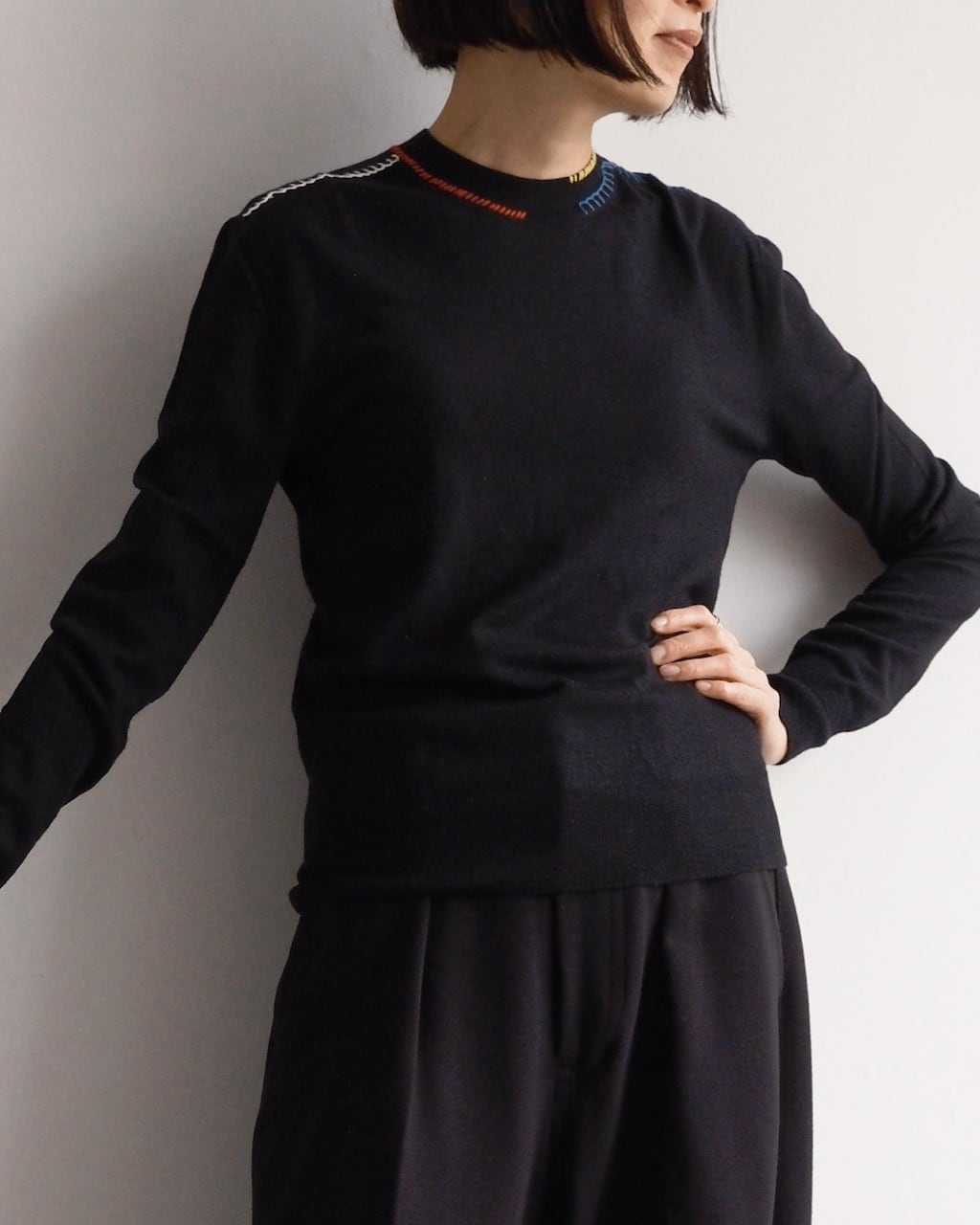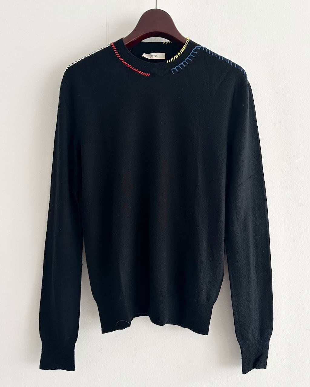 襟ぐりから肩にかけて、レッド・ブルー・イエロー・ホワイトの糸でステッチを施したCÉLINEの遊びのあるニットプルオーバー。