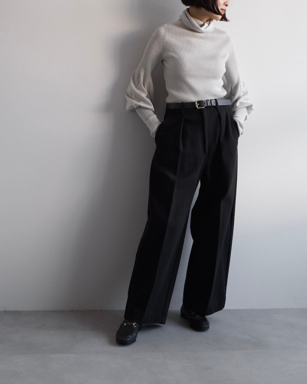 たっぷりとしたタートルネックは、折り返してもくしゅっと無造作にたゆませても美しく、ニュアンスのある表情を演出。
