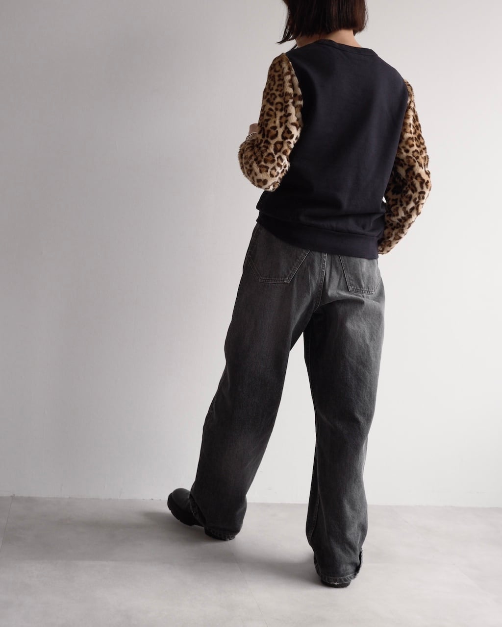 DRIES VAN NOTENのフロントは黒無地でシンプルにまとめ、袖にレオパード柄の柔らかなフェイクファー素材を切り替えたデザインが印象的なスウェットトップス。