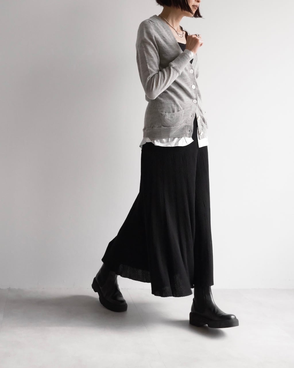 フロントはホワイトボタンで統一され、グレーのニットとのコントラストが上品な印象に。
