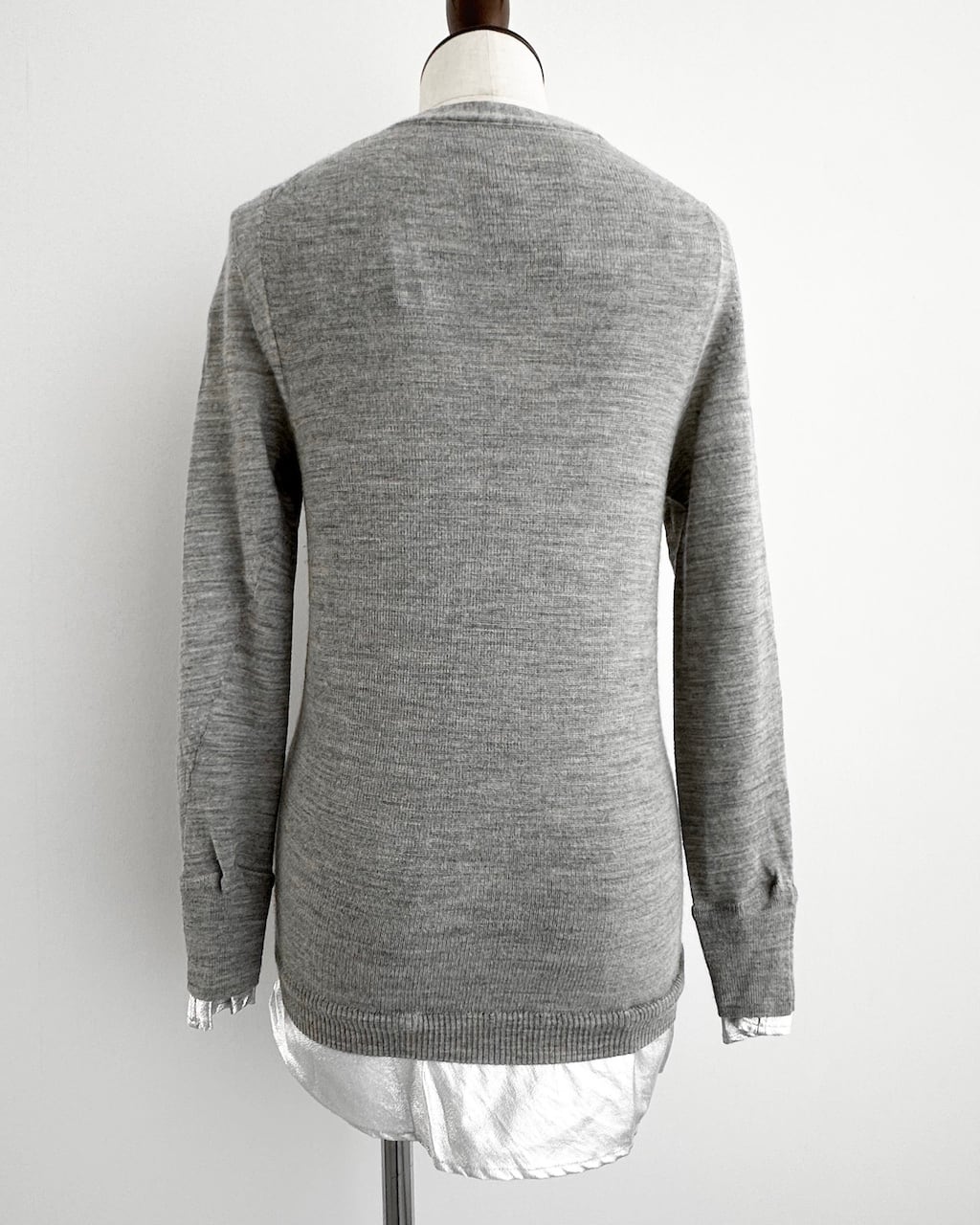 軽やかなウールニットにメタリック調のポリエステル生地をレイヤードしたsacai らしい遊び心が光るカーディガン。