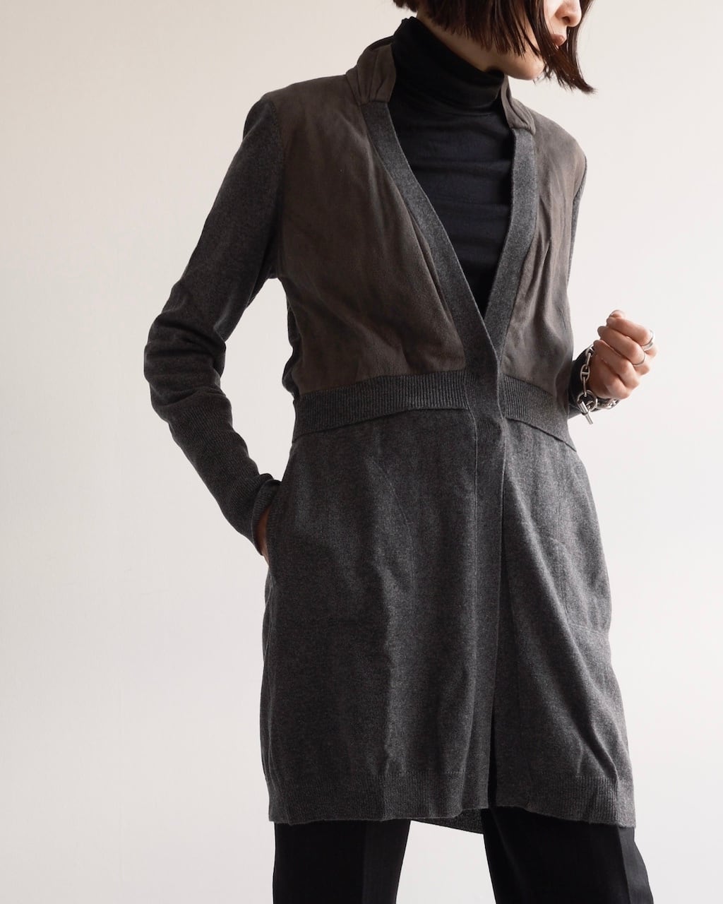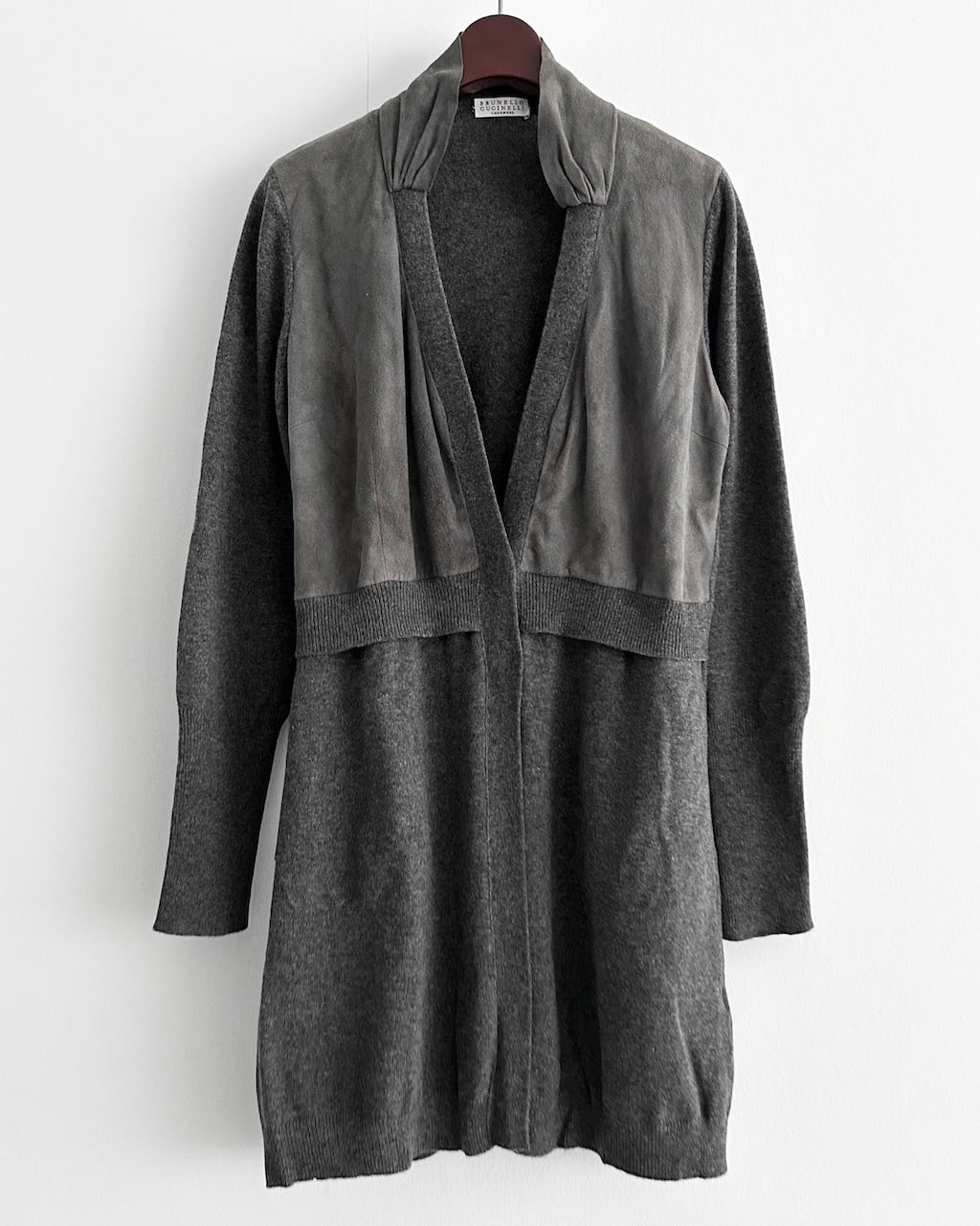 柔らかなカシミヤニットと山羊革を切り替えたブルネロクチネリのロングカーディガン。
