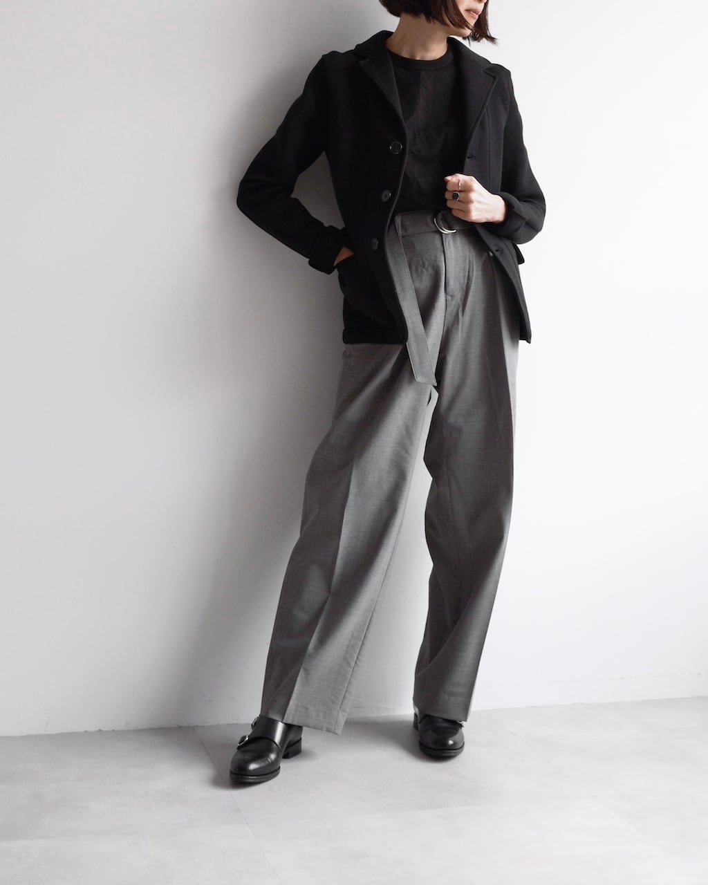 ボンディングのようなハリと密度のある素材感が特徴で、着ると自然にシルエットが立ち上がります。