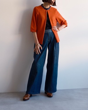 深みのあるオレンジにネイビーの縁取りが凛としたアクセントを添え、シャネルらしい気品が漂う一着です。