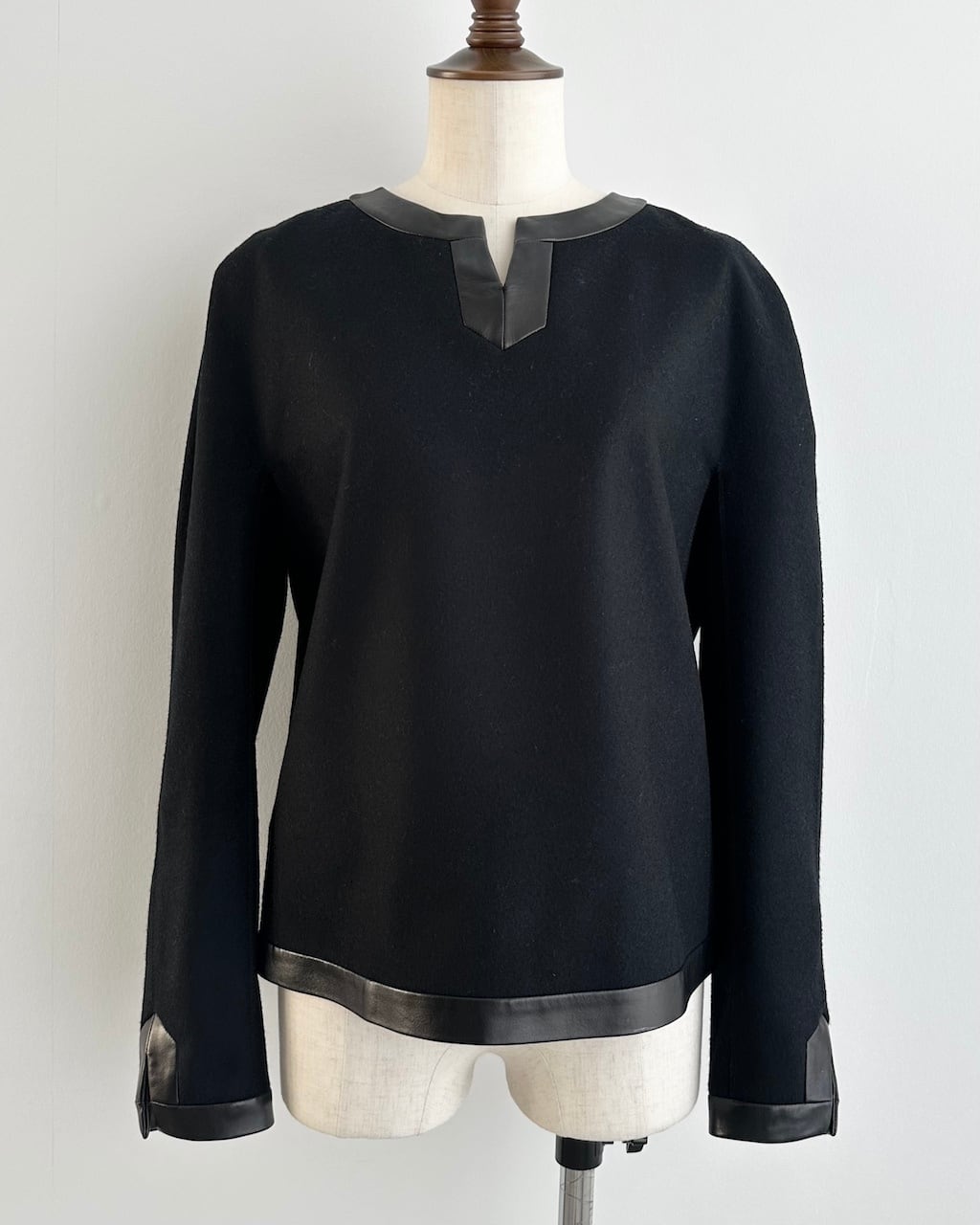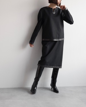 トップスはネックライン・袖口・裾にレザーを配したミニマルなデザイン。
