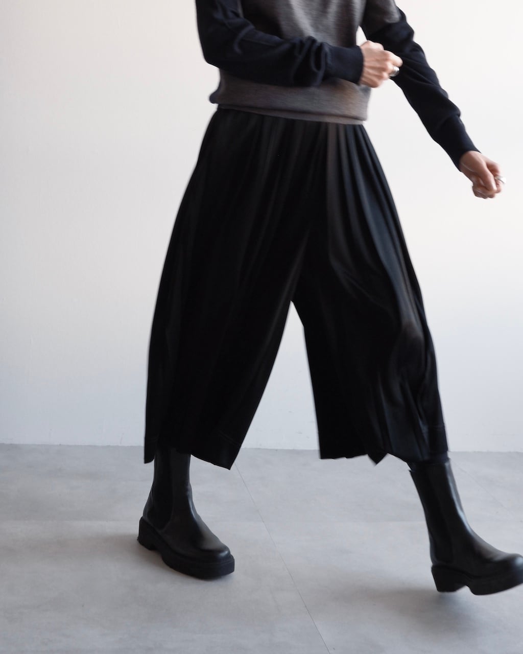 立体的に入った細かなプリーツが滑らかに揺れ、着用するとスカートのような優雅な表情を見せてくれます。