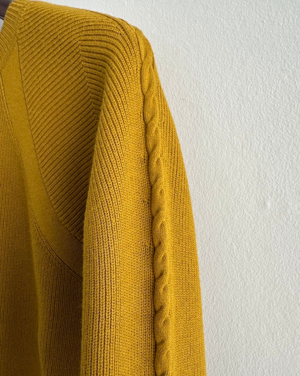 袖のサイドにはケーブル編みを配し、クラシックな要素をモダンに取り入れたデザインが魅力。