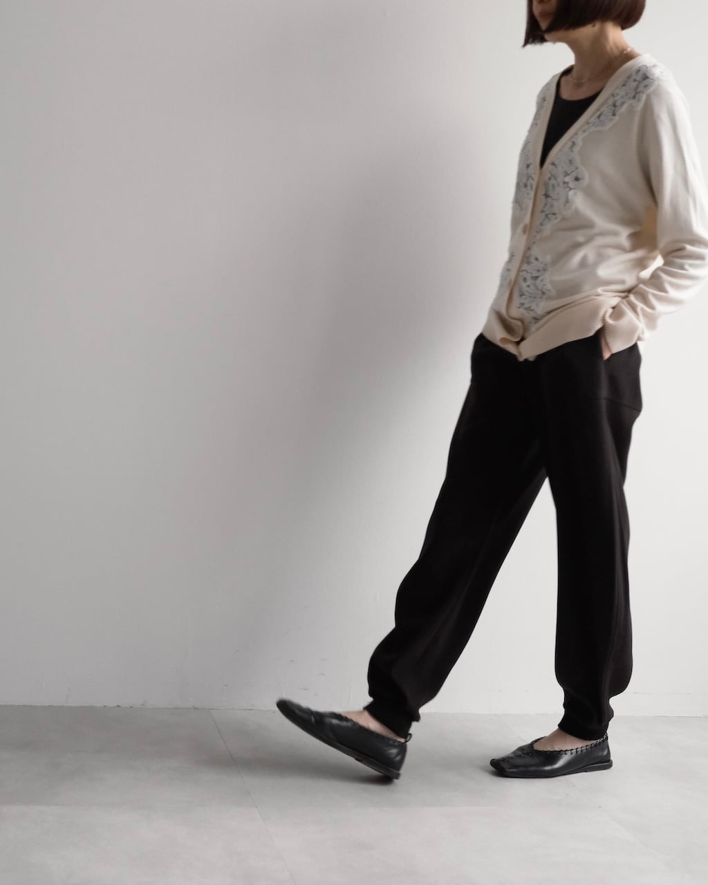 カラーはやさしいアイボリーで肌なじみがよく、装い全体を温かな印象にまとめてくれます。