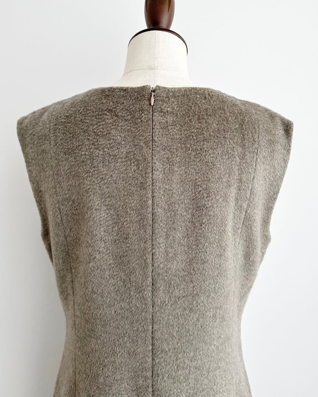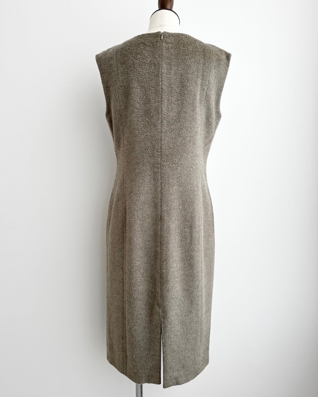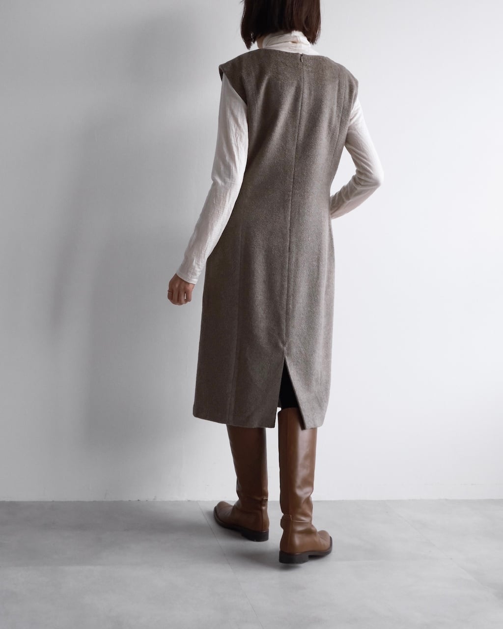背面はファスナー仕様で着脱しやすく、裾にはスリットを配し足さばきの良さと後ろ姿の表情をさりげなくプラス。