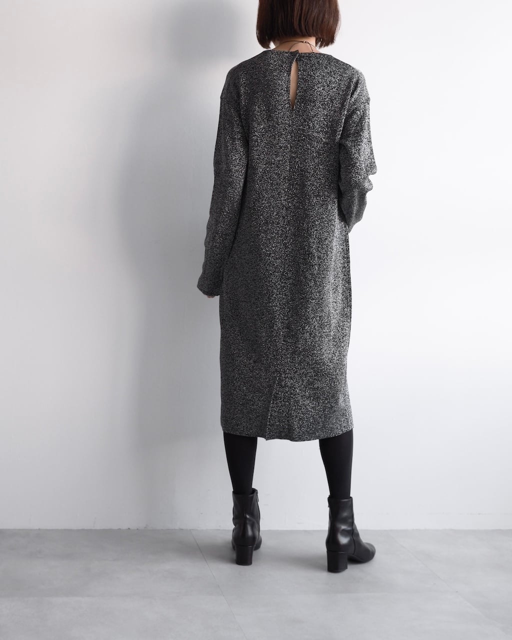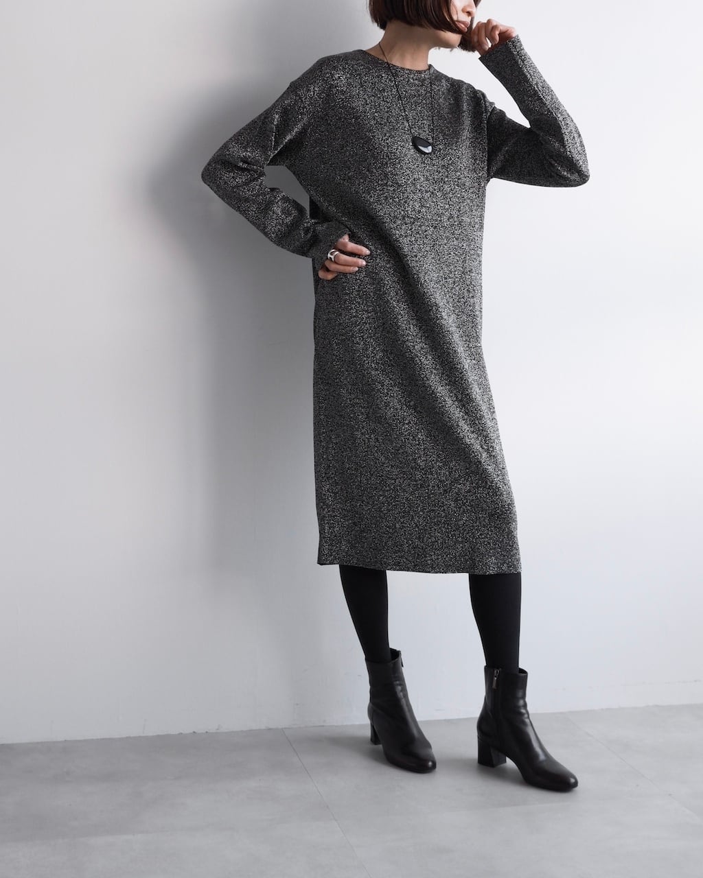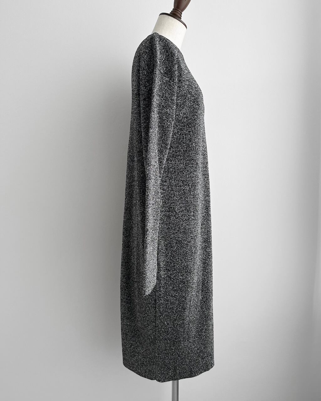 ブラックをベースに、光を受けてさりげなくきらめくテクスチャーが、シンプルなシルエットに奥行きを与えます。