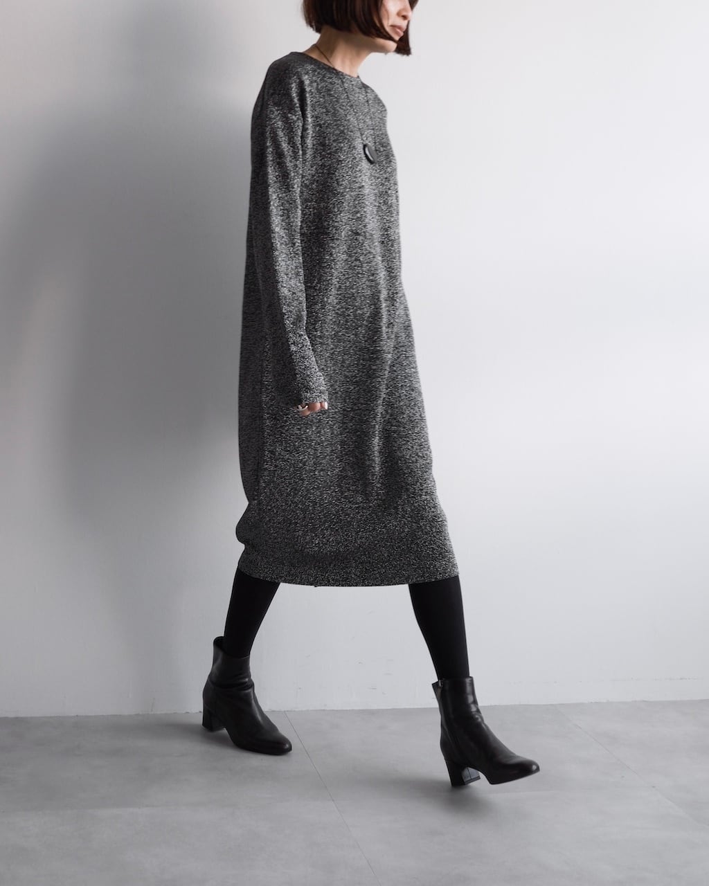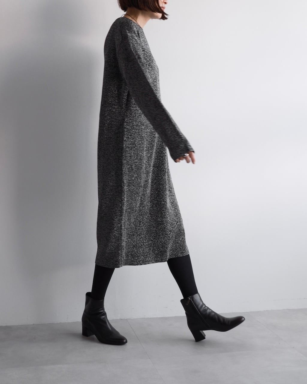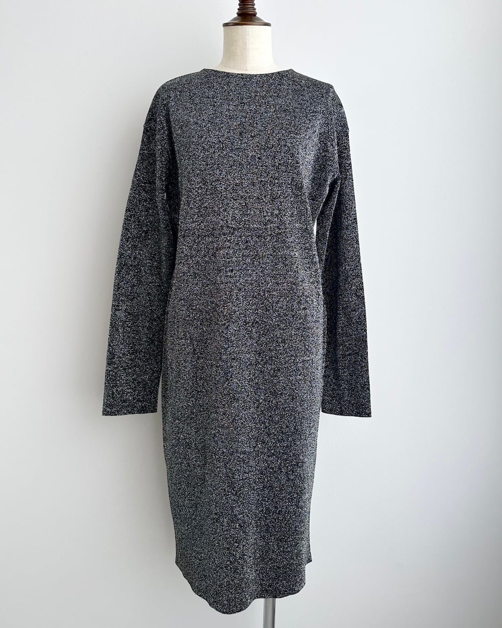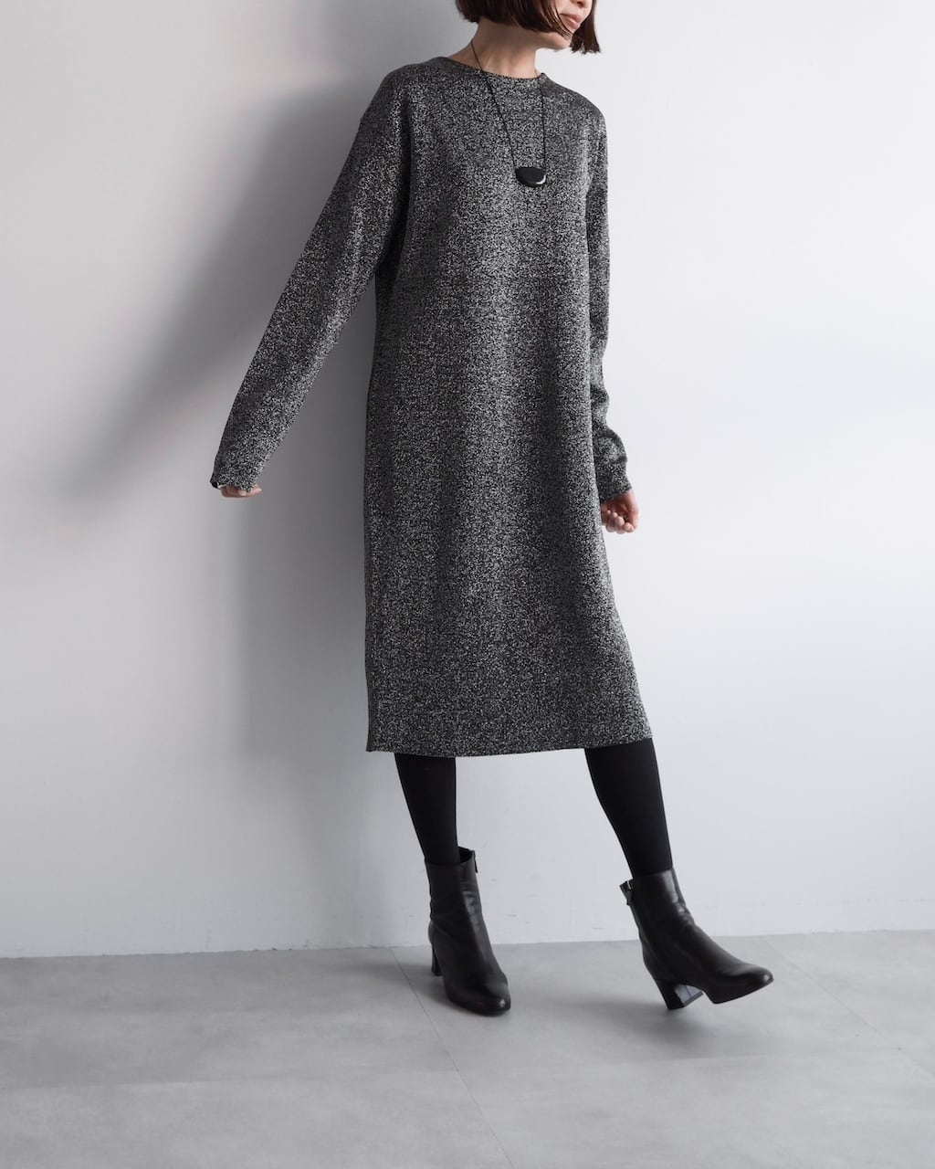 ブラックをベースに、光を受けてさりげなくきらめくテクスチャーが、シンプルなシルエットに奥行きを与えます。