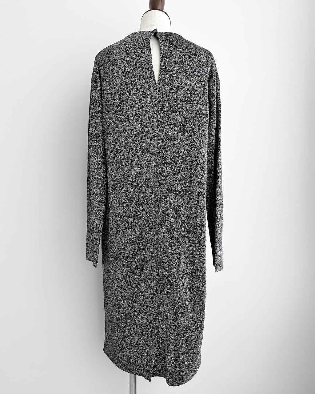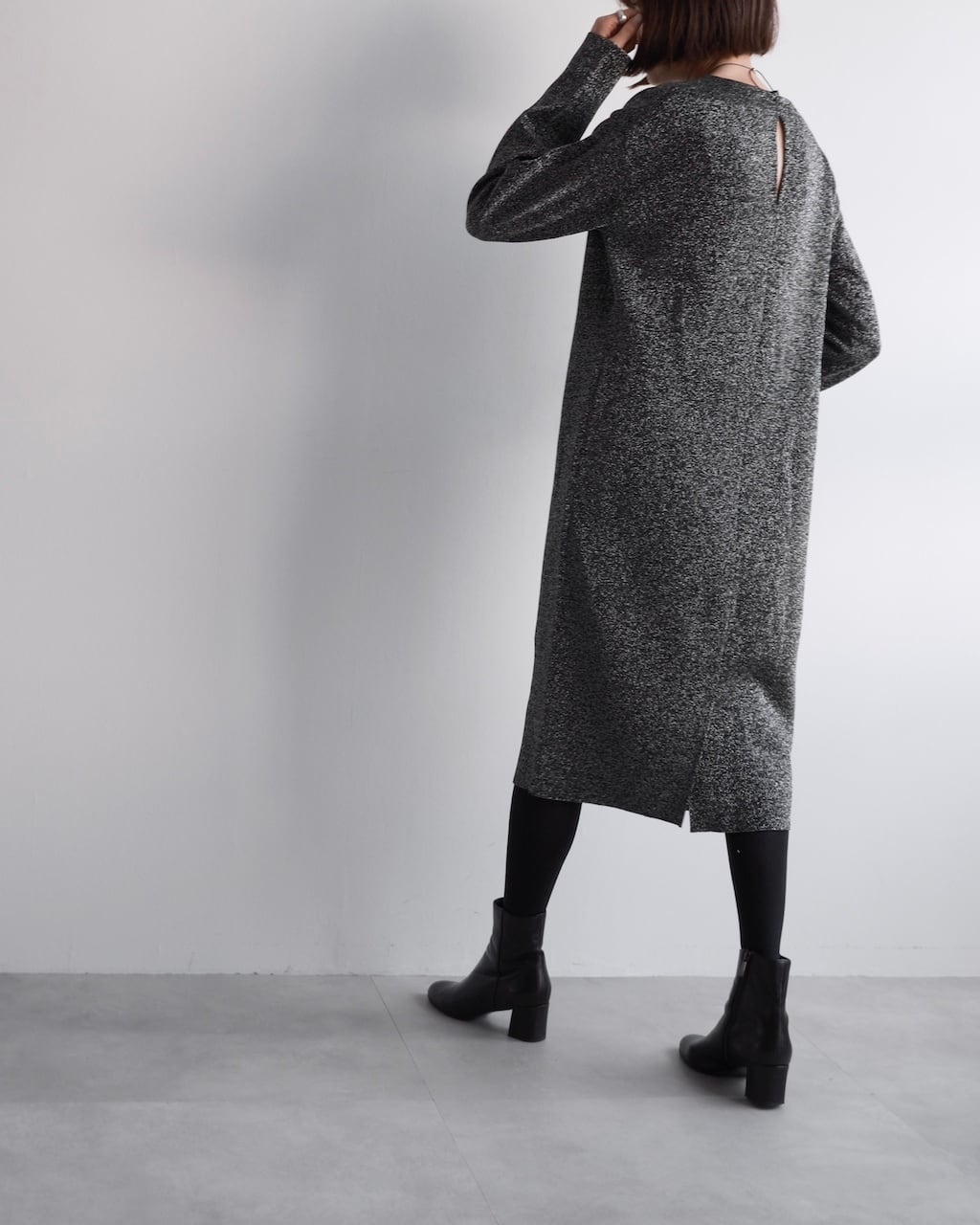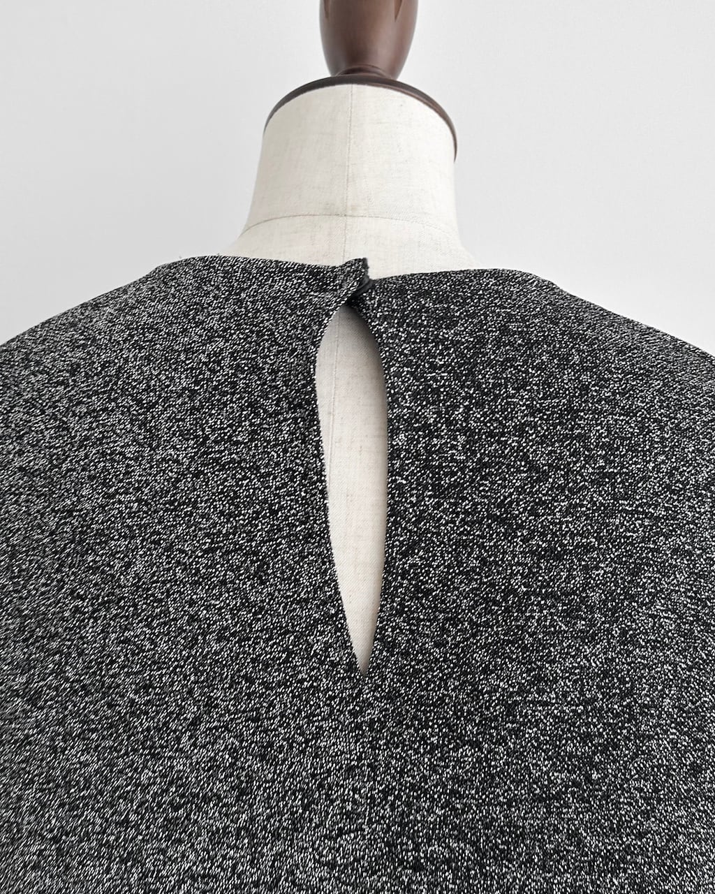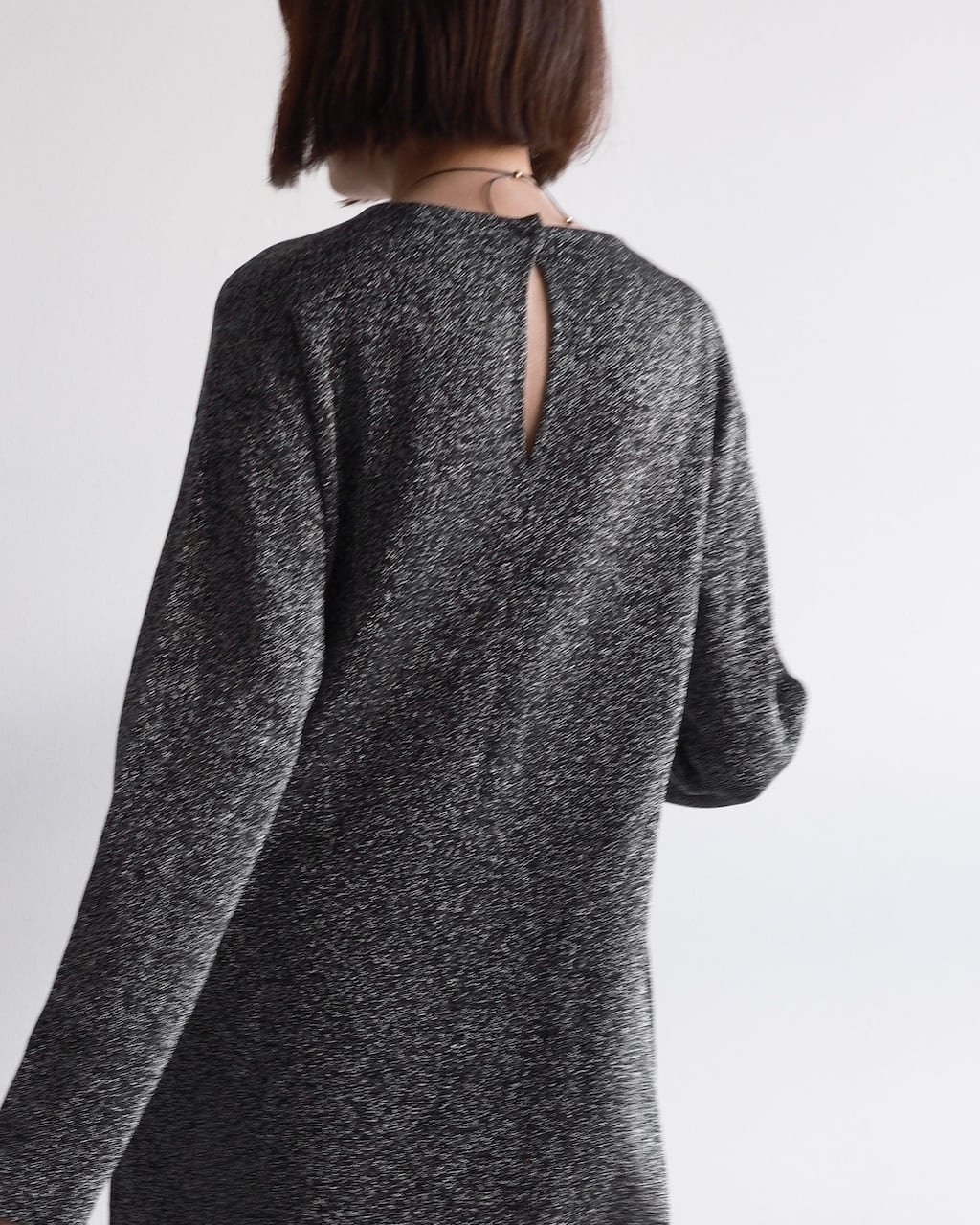 一方でバックネックにはスリット開きが設けられ、後ろ姿に控えめなアクセントを添えています。