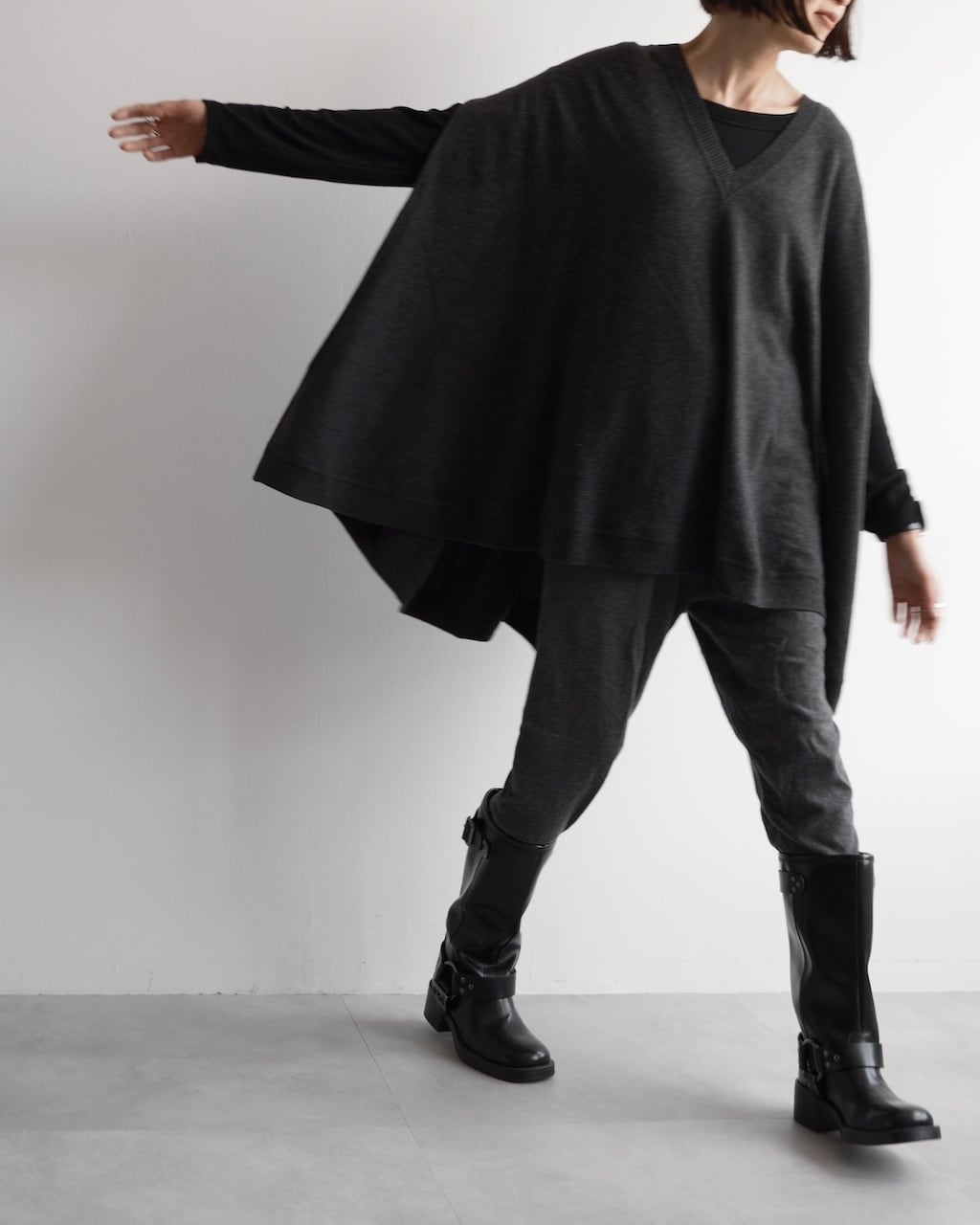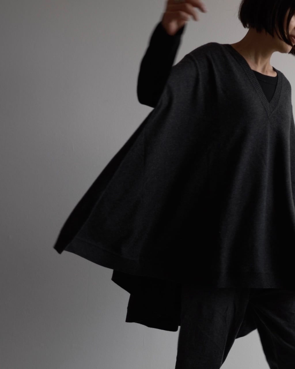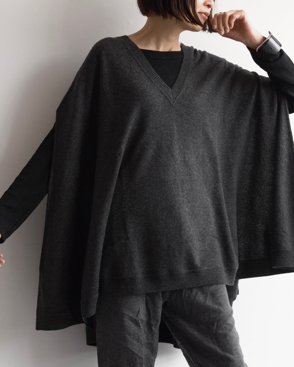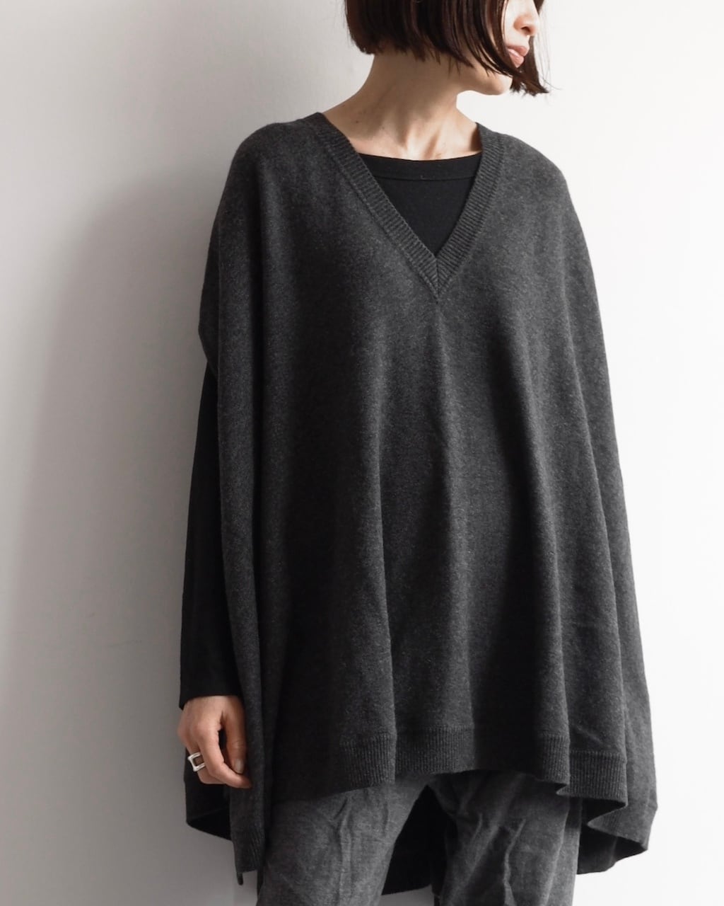 ネックラインは浅すぎないVラインで、ポンチョ特有の分量感の中にもすっきりとしたバランスに。