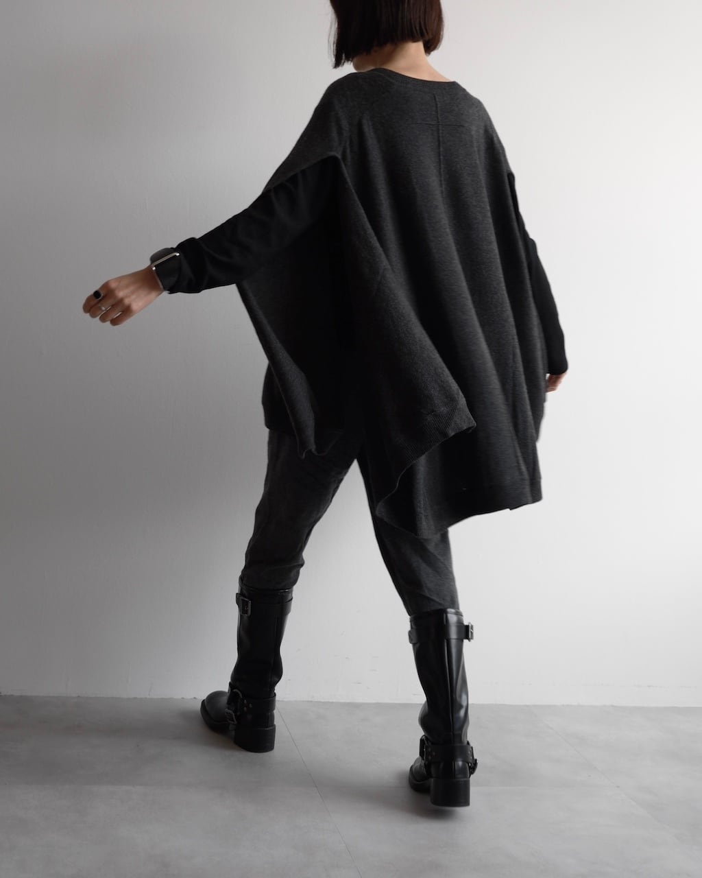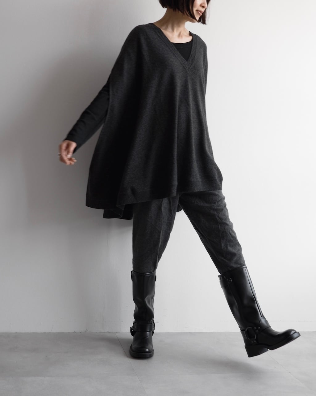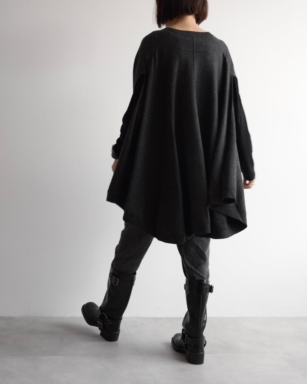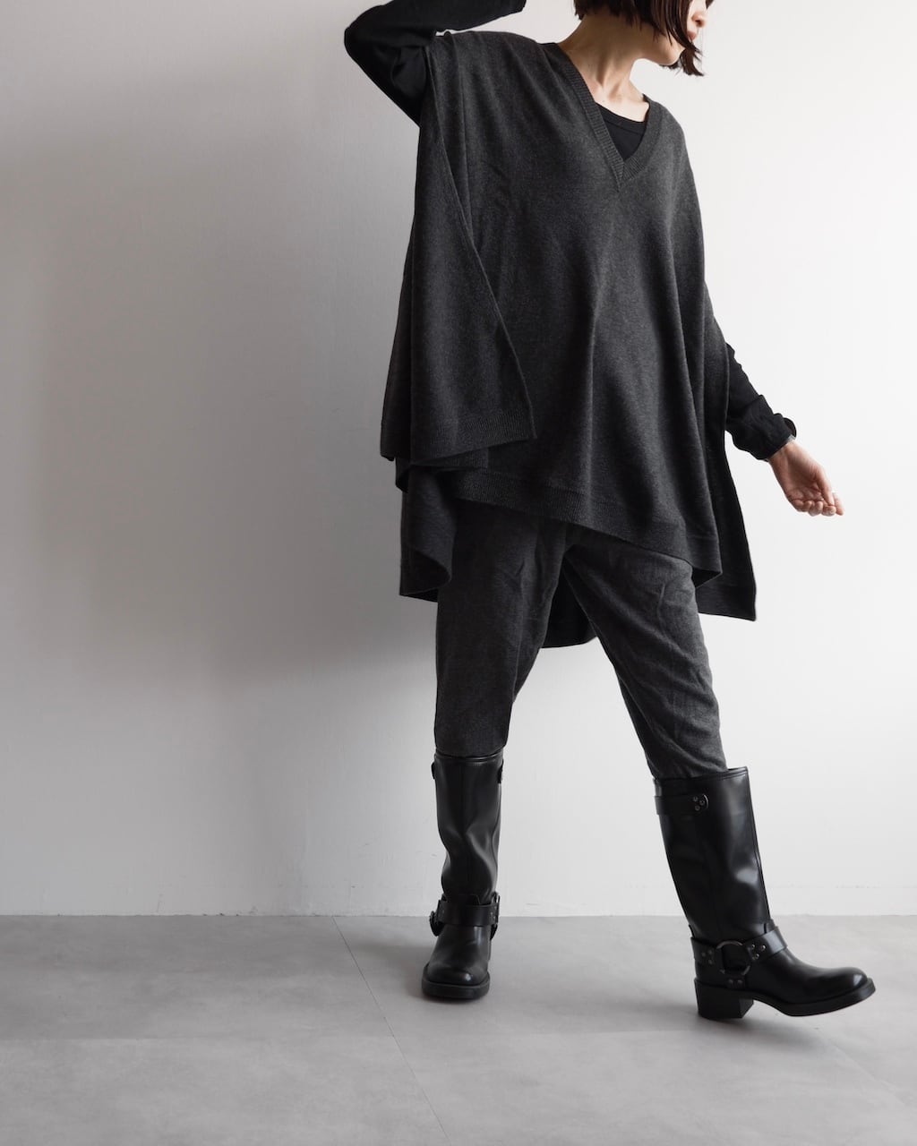 ネックラインは浅すぎないVラインで、ポンチョ特有の分量感の中にもすっきりとしたバランスに。