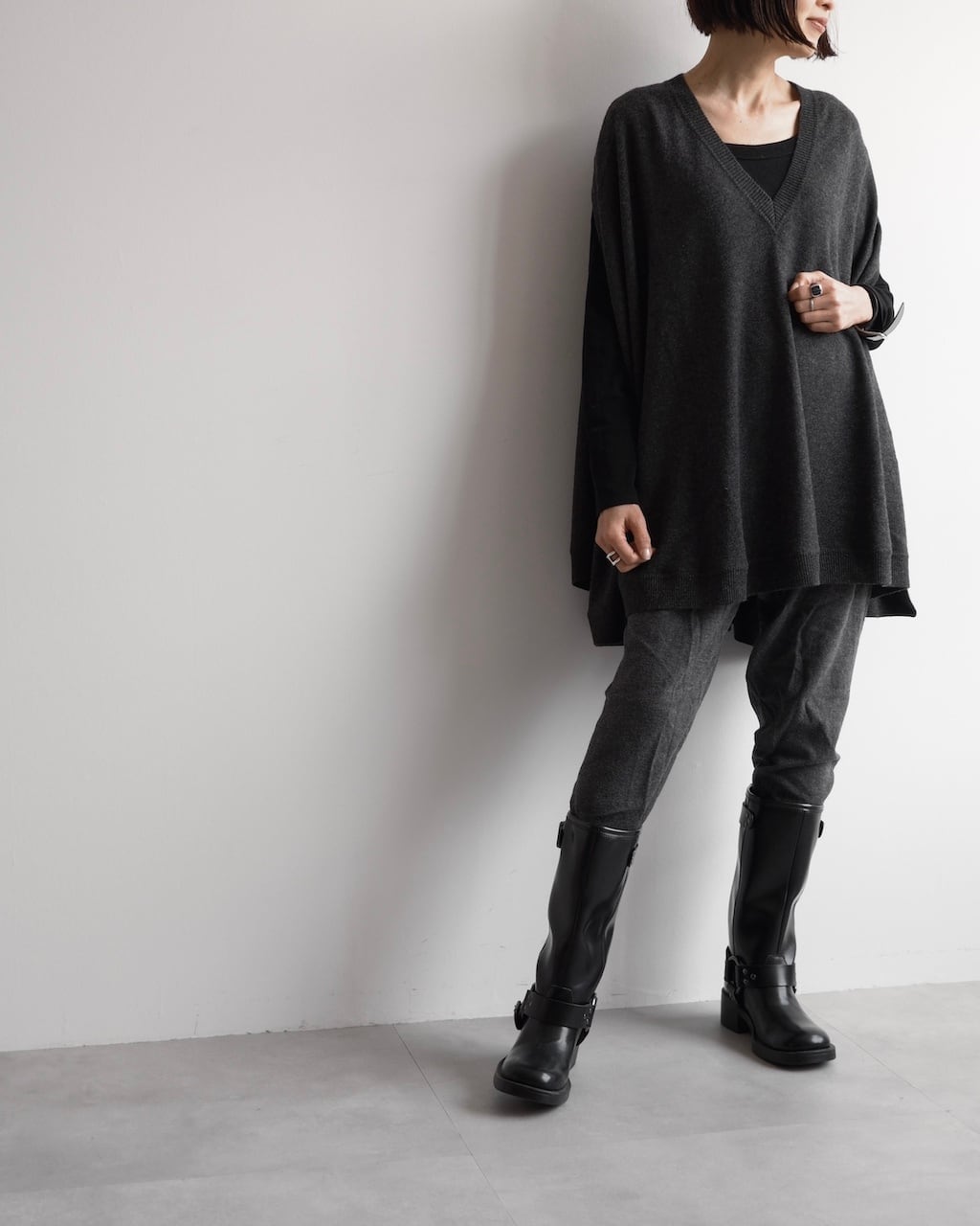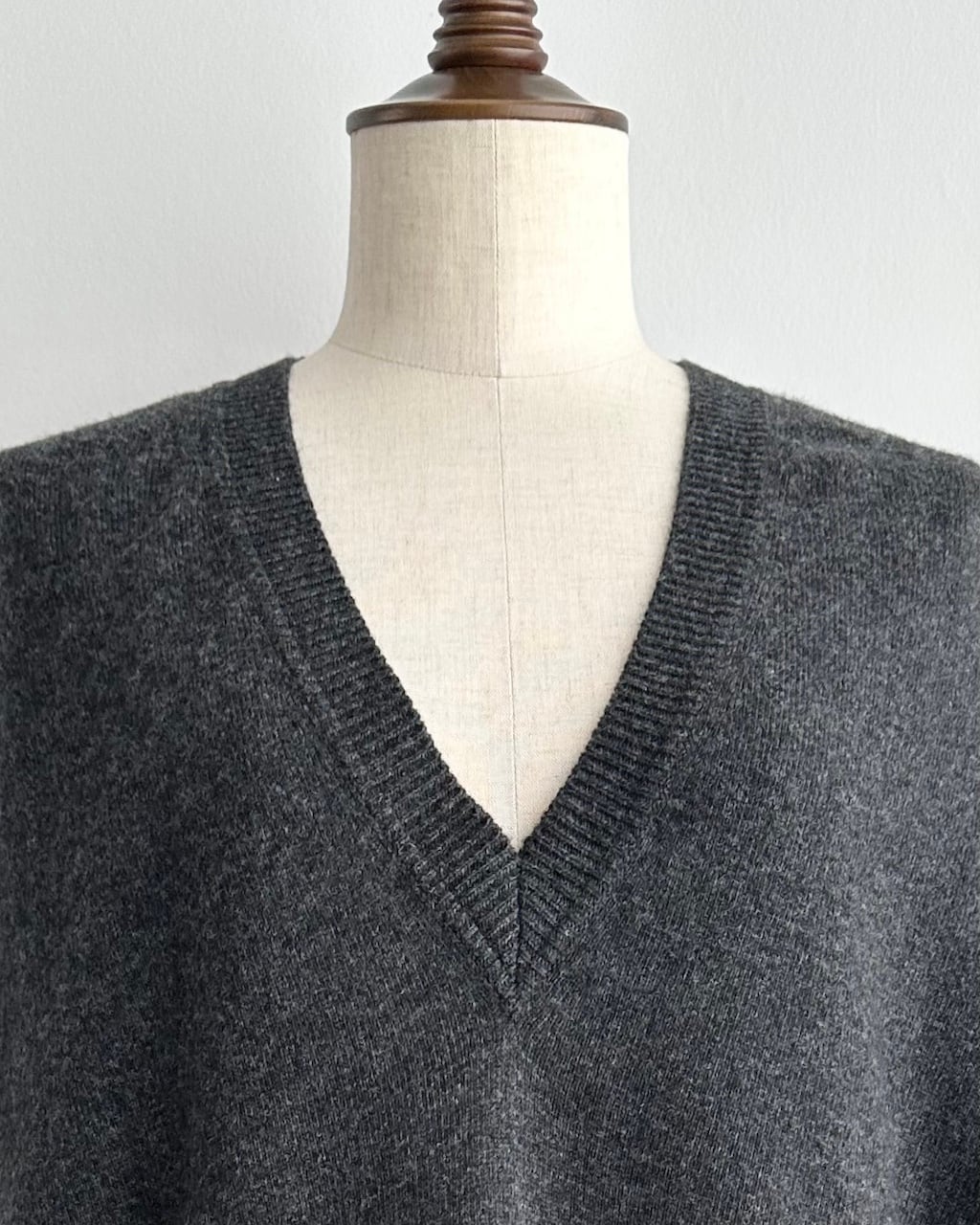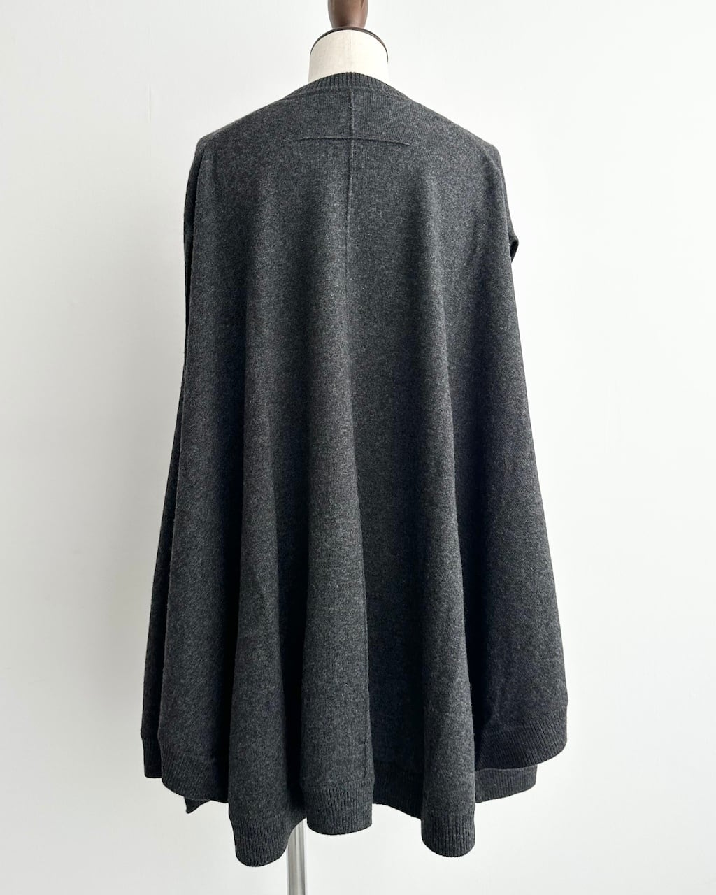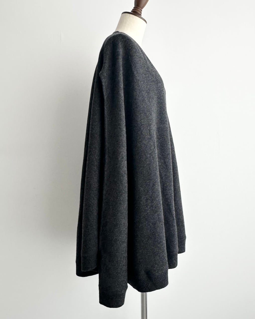 ネックラインは浅すぎないVラインで、ポンチョ特有の分量感の中にもすっきりとしたバランスに。