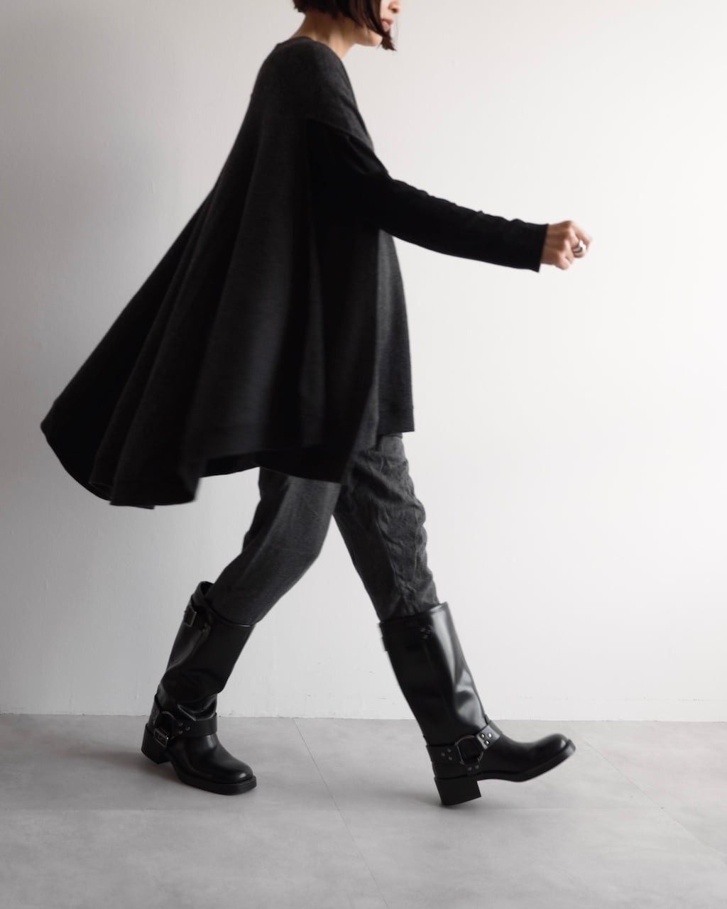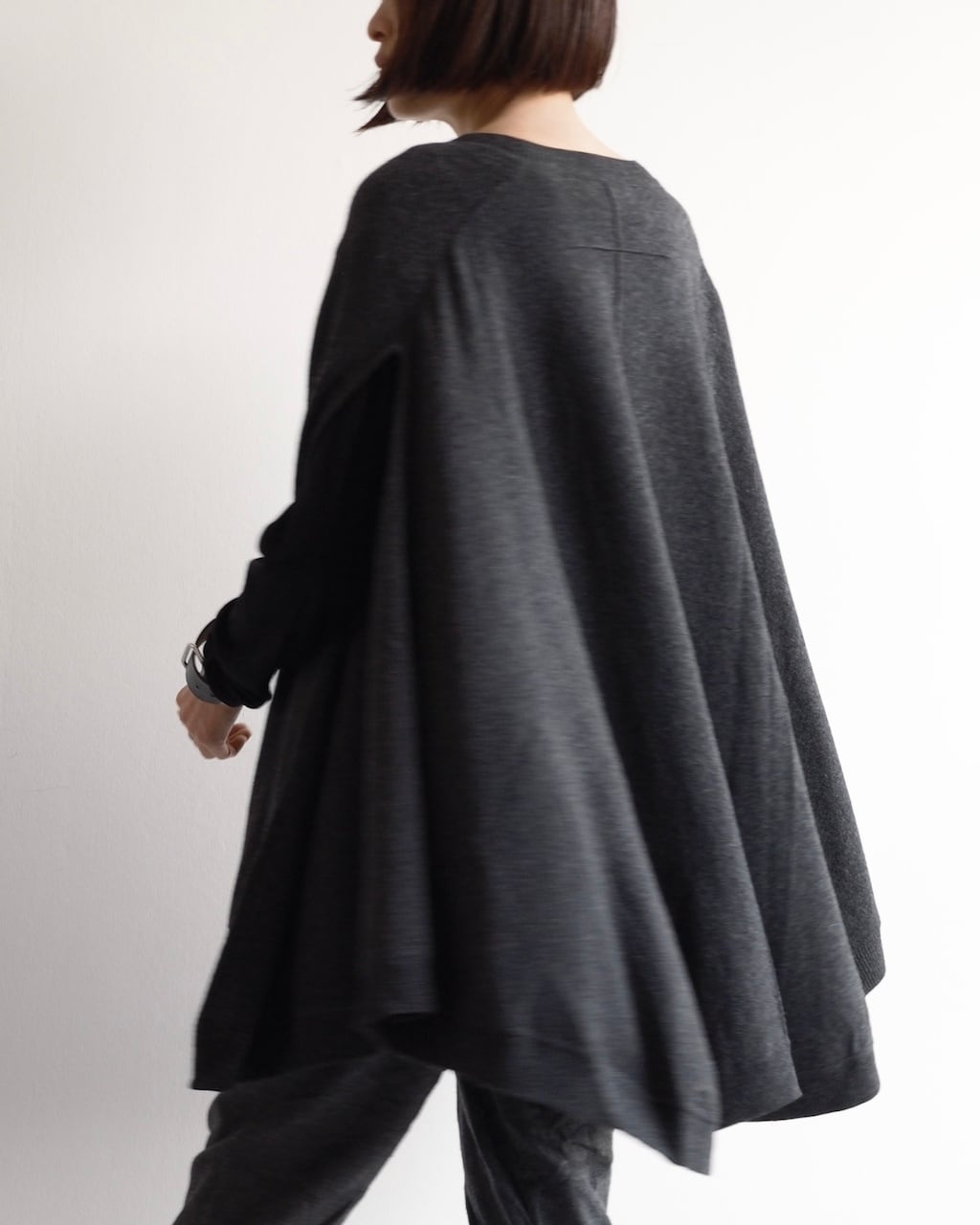 肩からすとんと落ちるシルエットで、体を包み込むようなドレープが生まれ、動きに合わせて自然な表情を見せます。