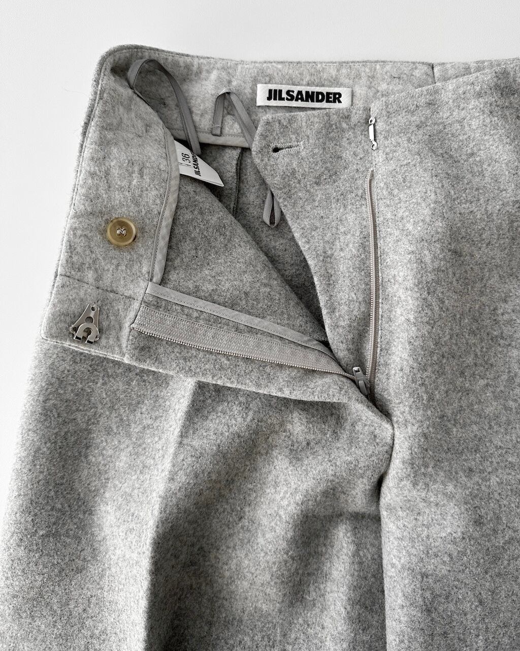 JIL SANDERらしいミニマルな美意識が感じられる、ウール×アンゴラ素材のライトグレーのハーフパンツ。