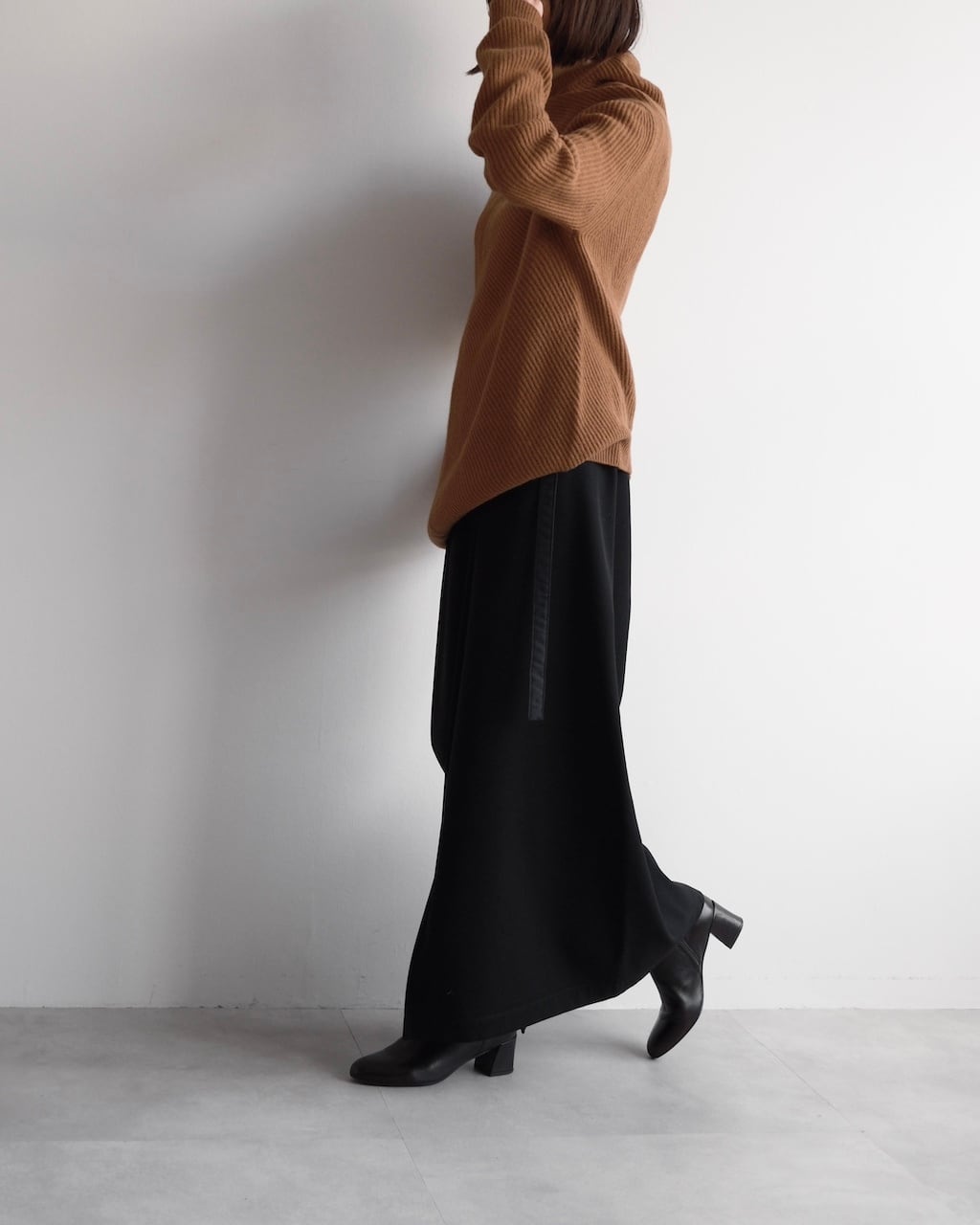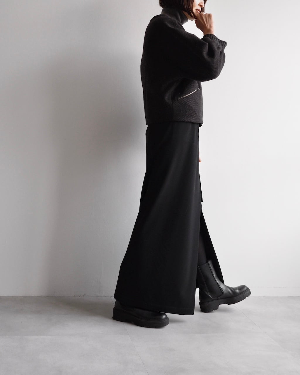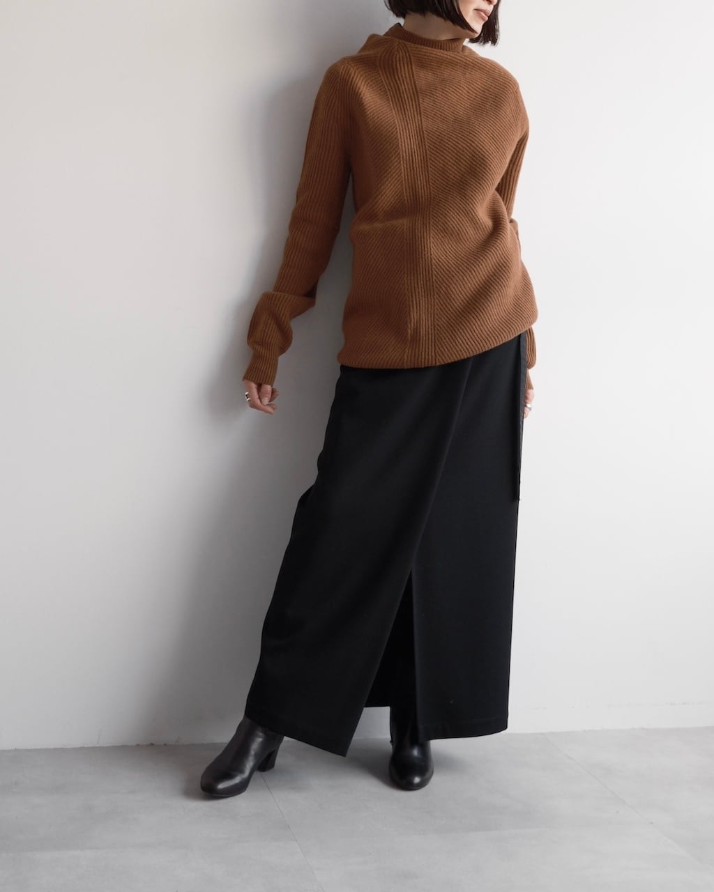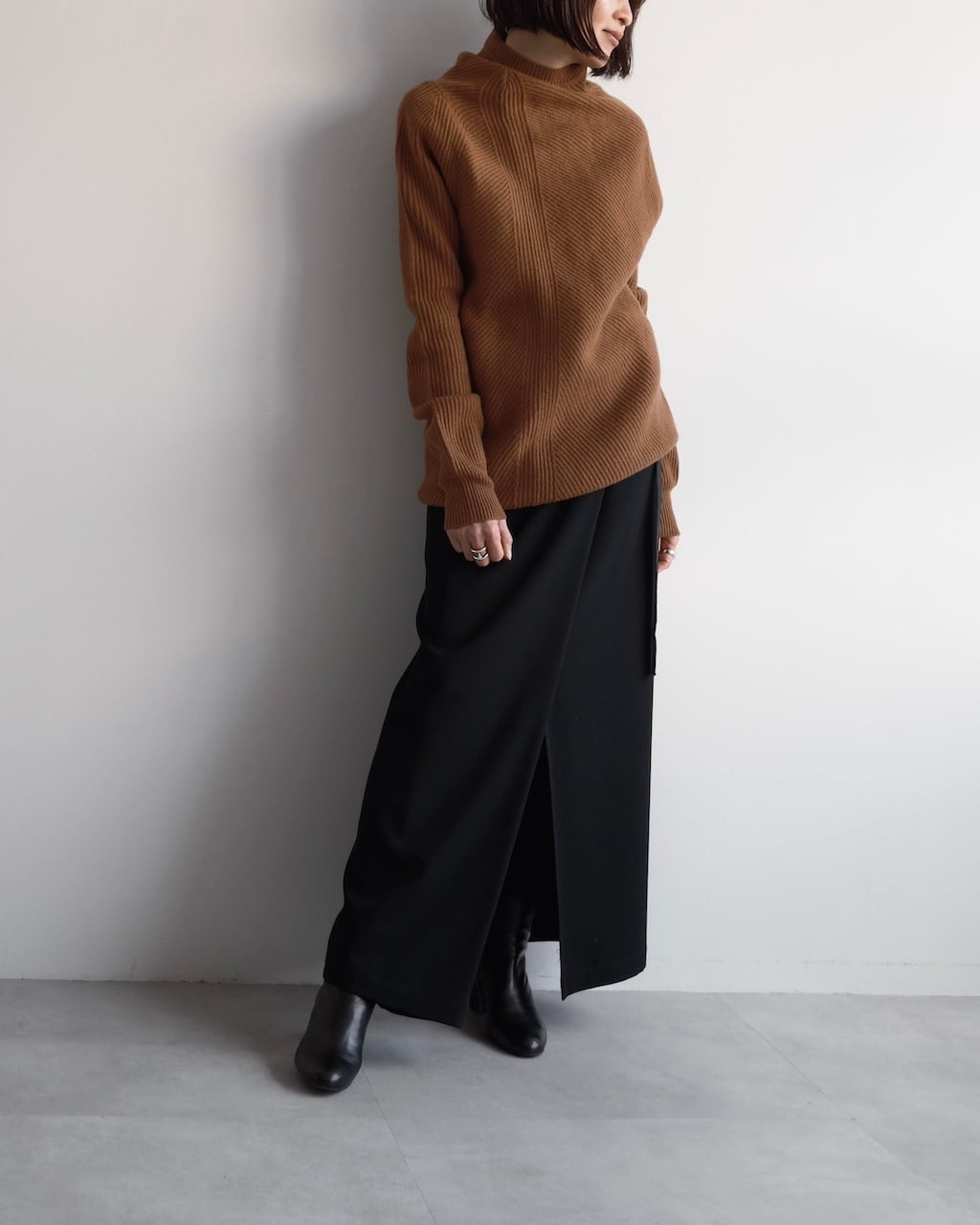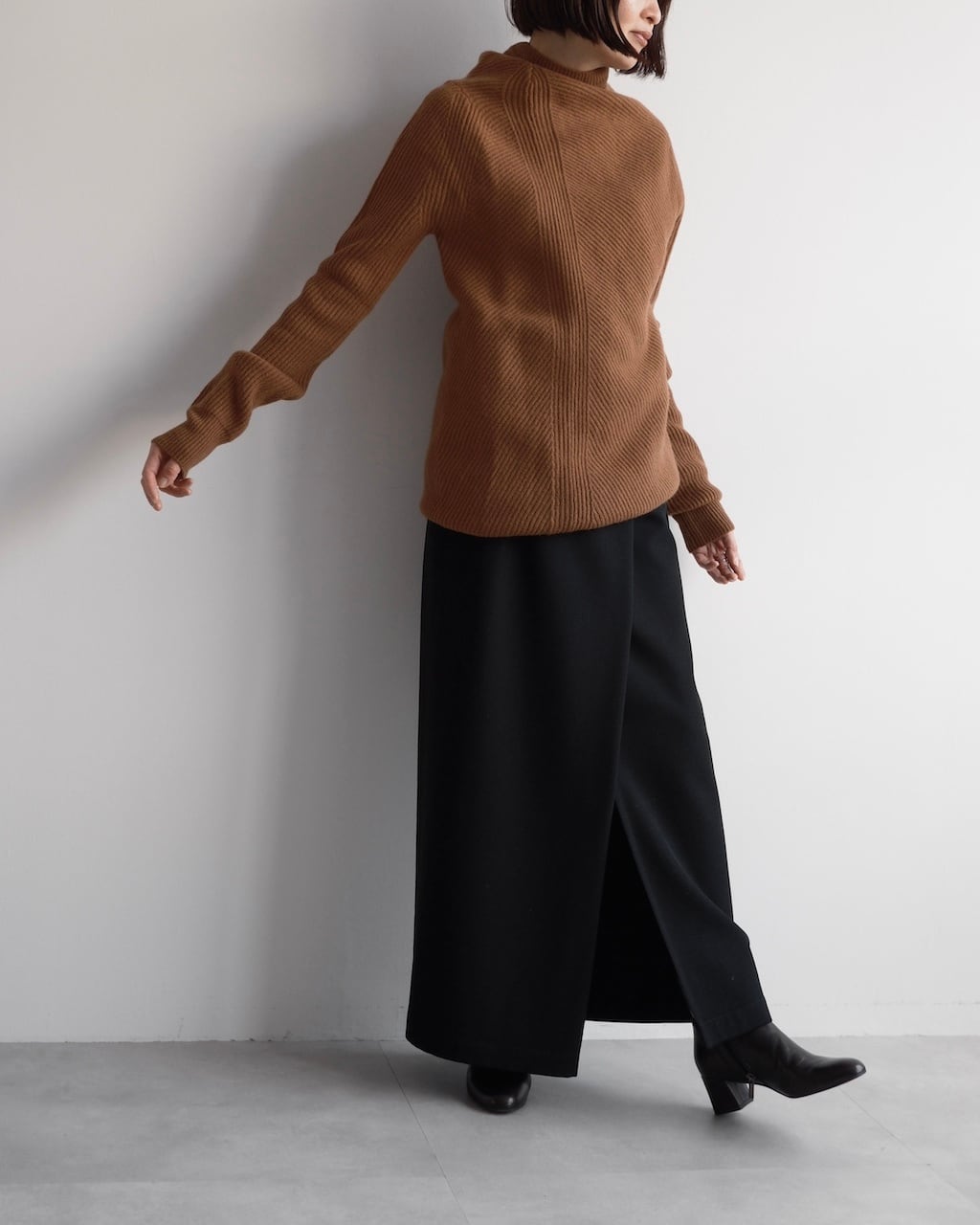 フロントは深めの重なりとスリットを設けたデザインで、動きに合わせて生まれる陰影が美しく、さりげなく存在感を放ちます。
