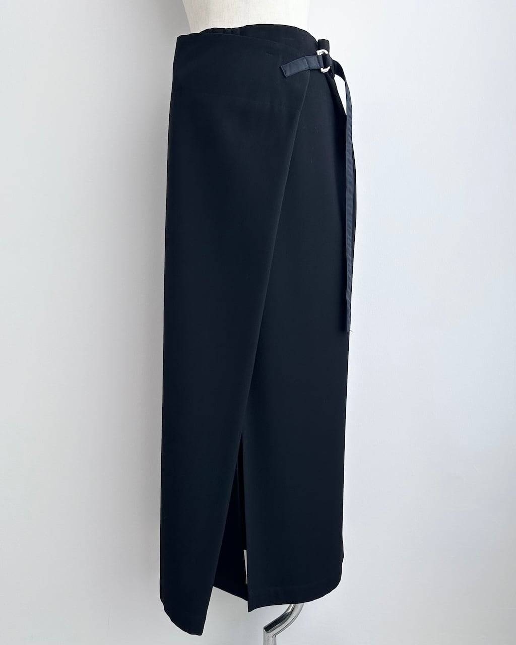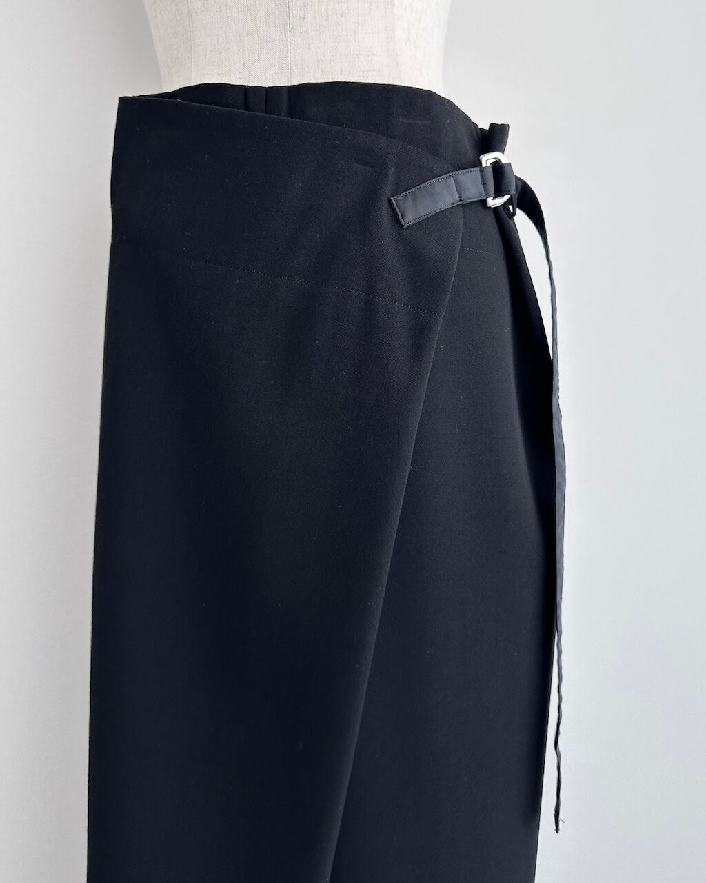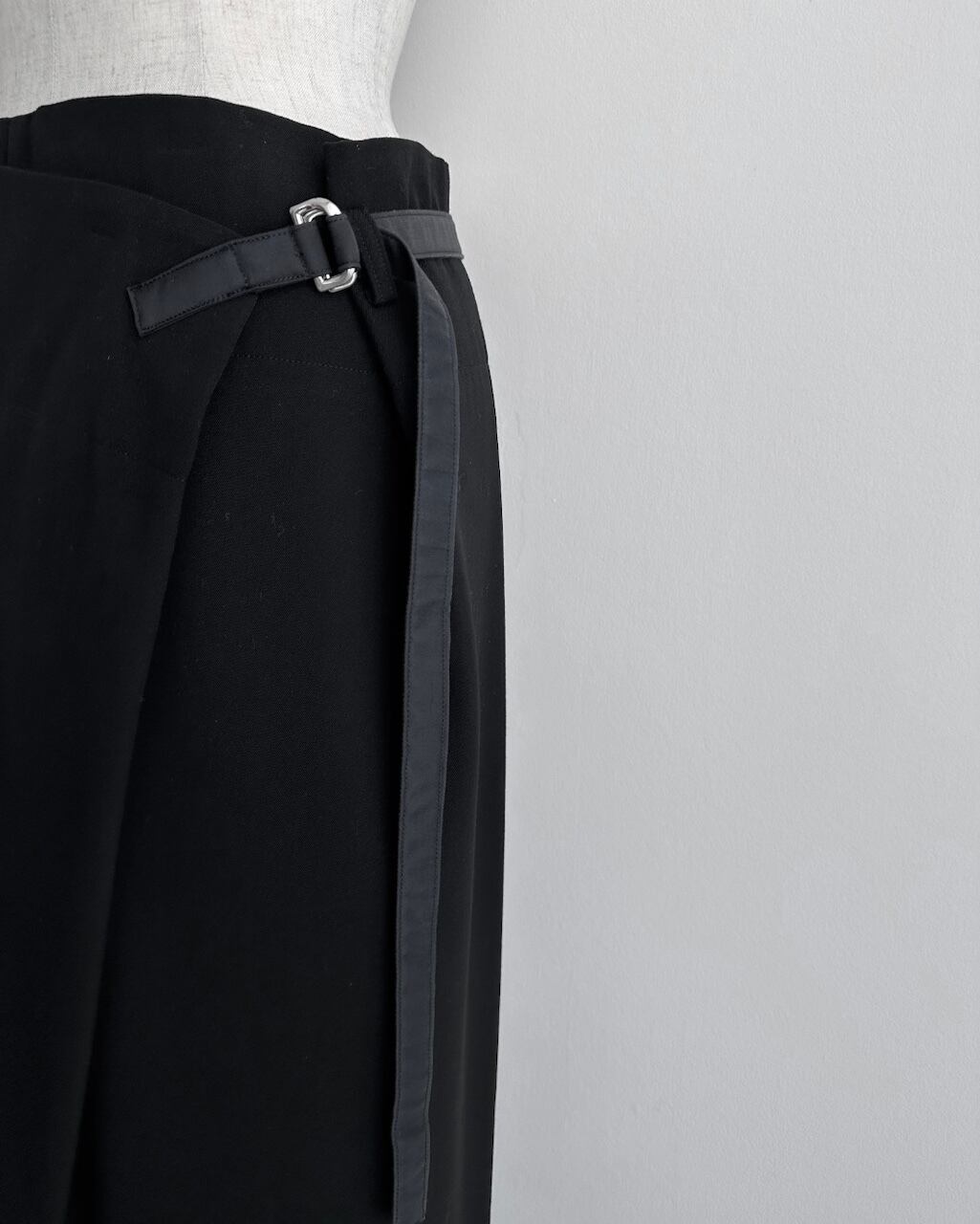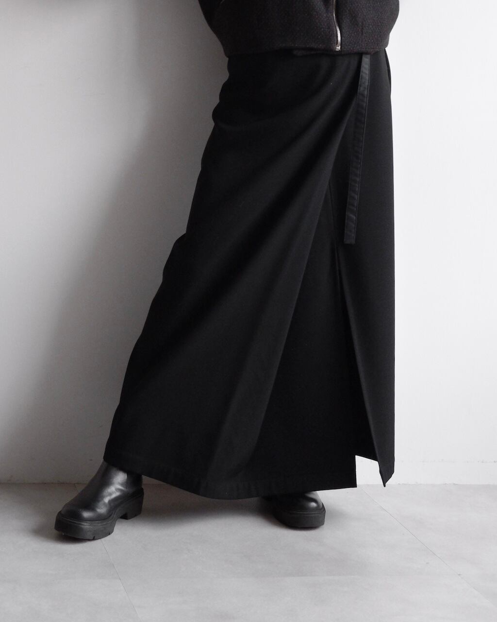 Y’sらしいモダンで構築的なアプローチが際立つ、ラップ仕様のロングスカート。