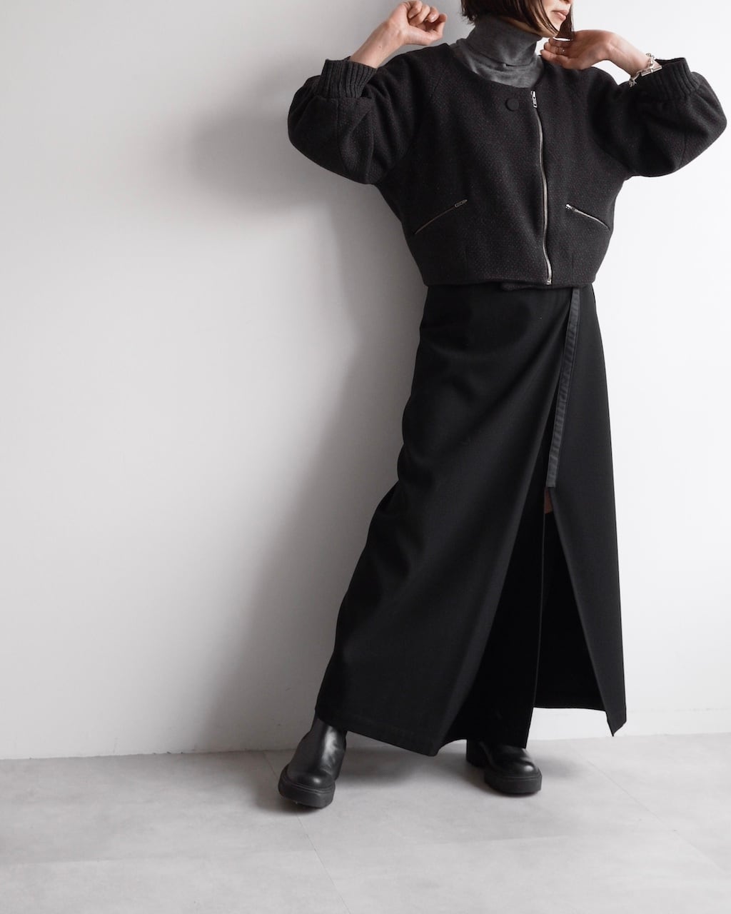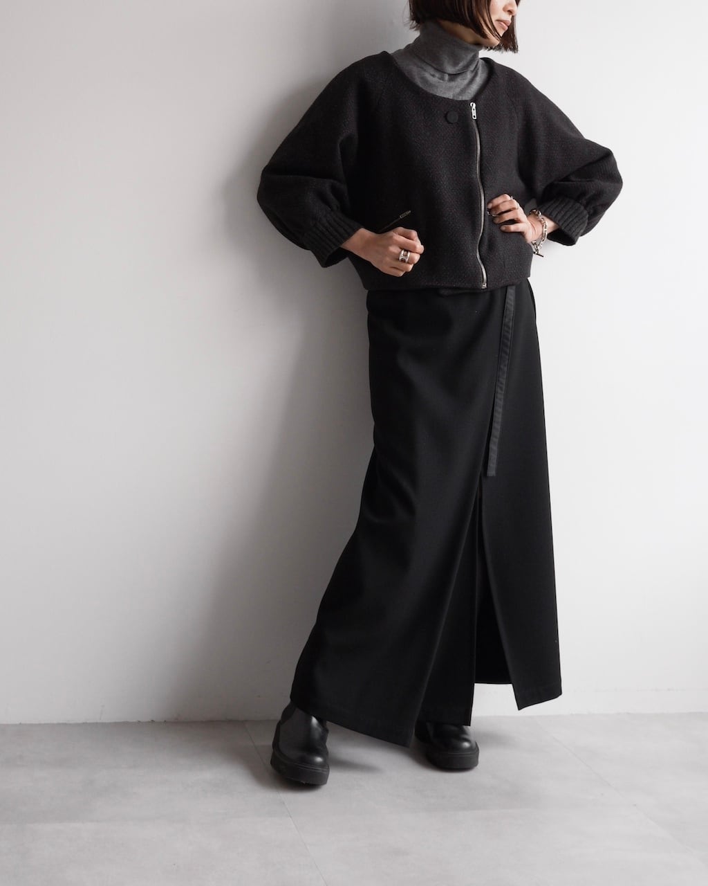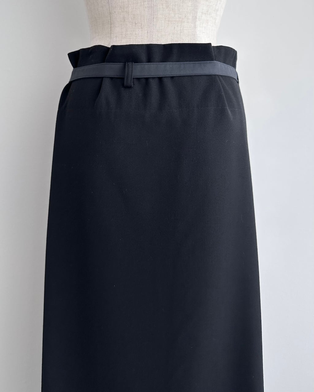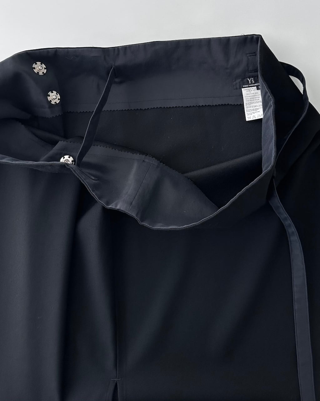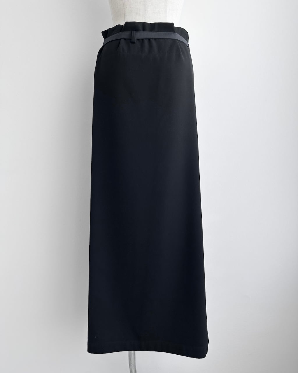 Y’sらしいモダンで構築的なアプローチが際立つ、ラップ仕様のロングスカート。