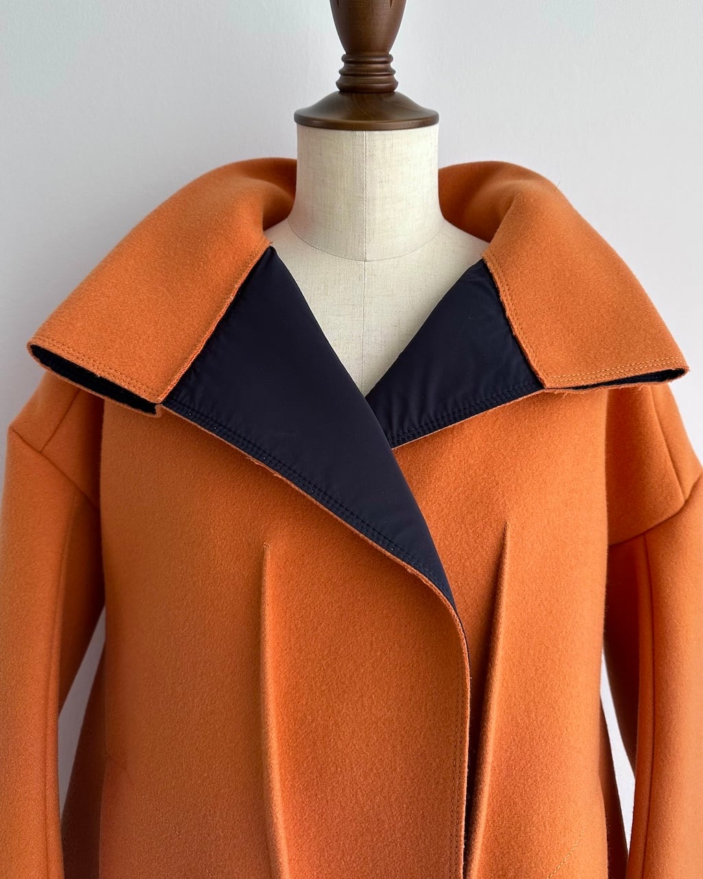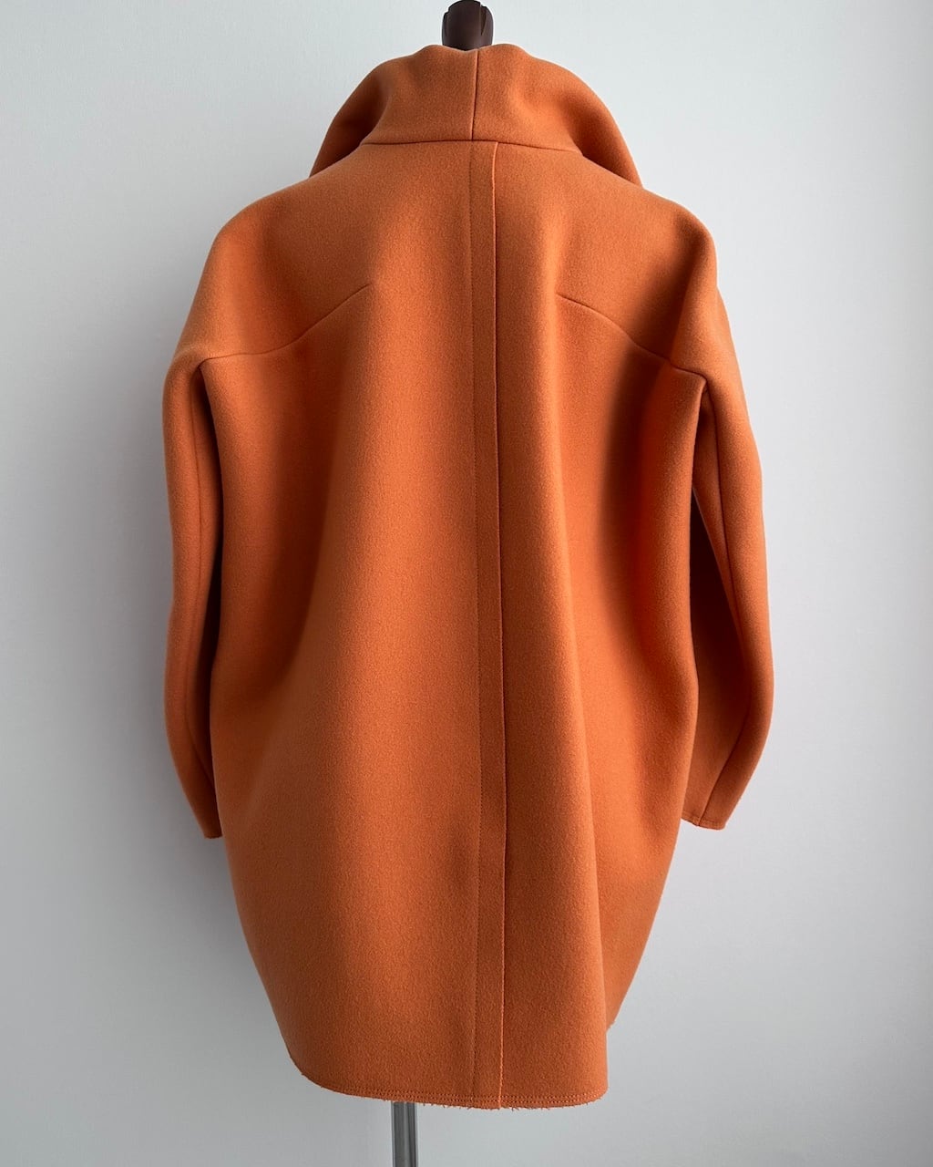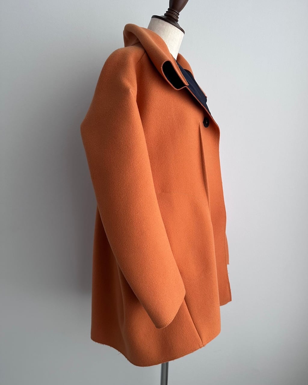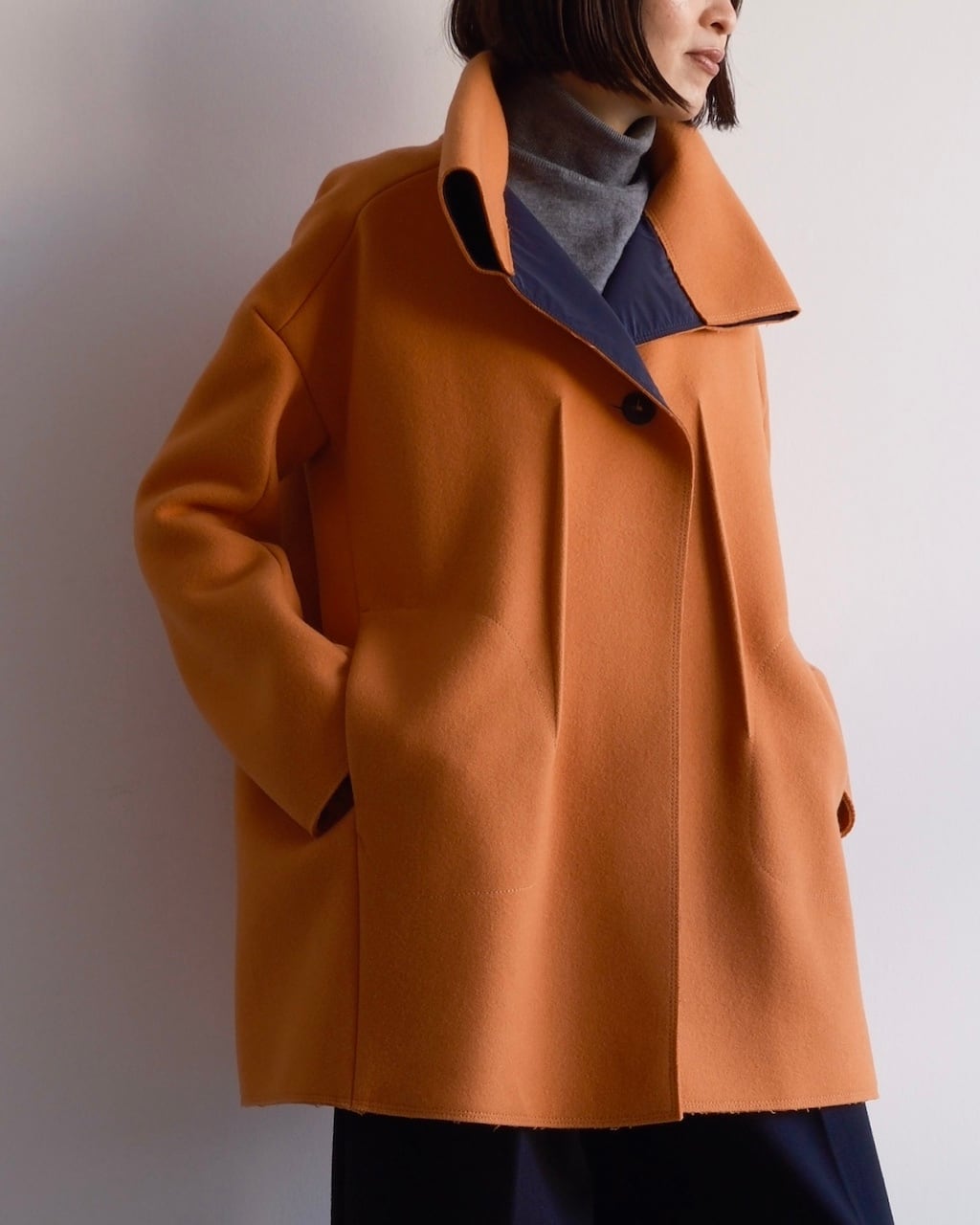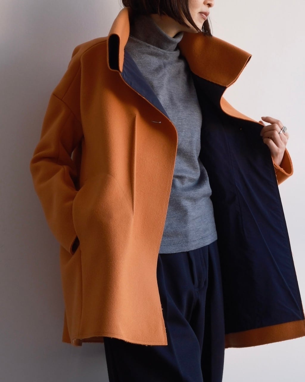美しいオレンジの色調と、体から離れる構築的なシルエットが印象的な一着。