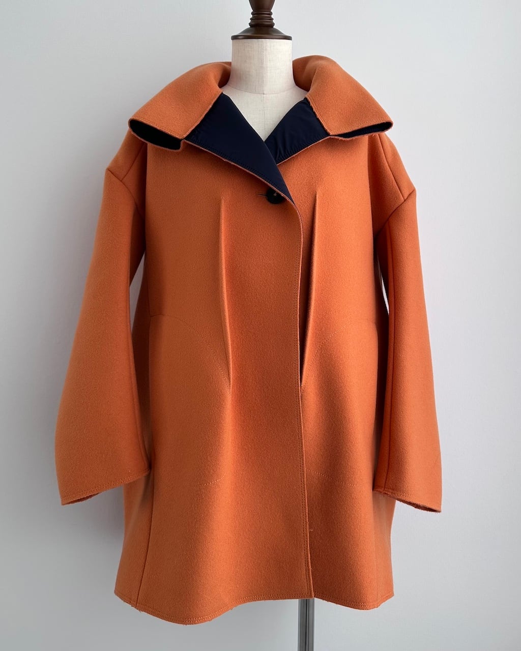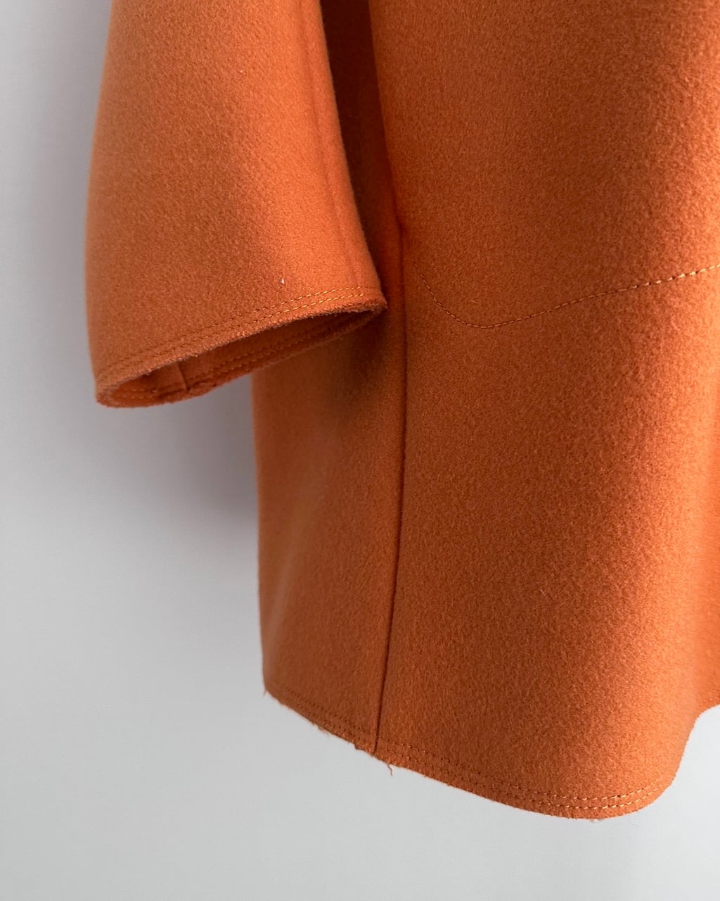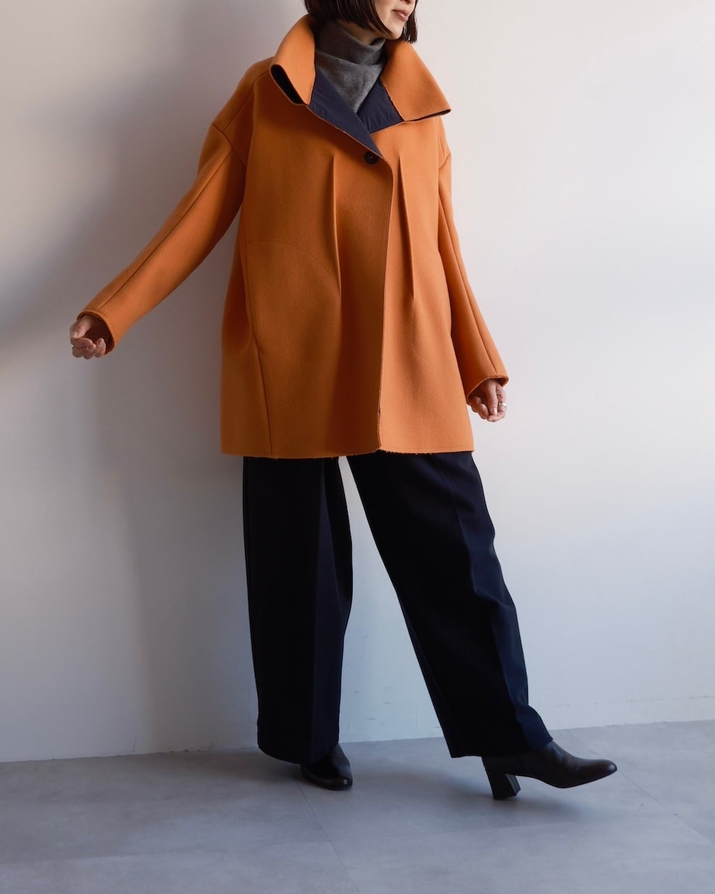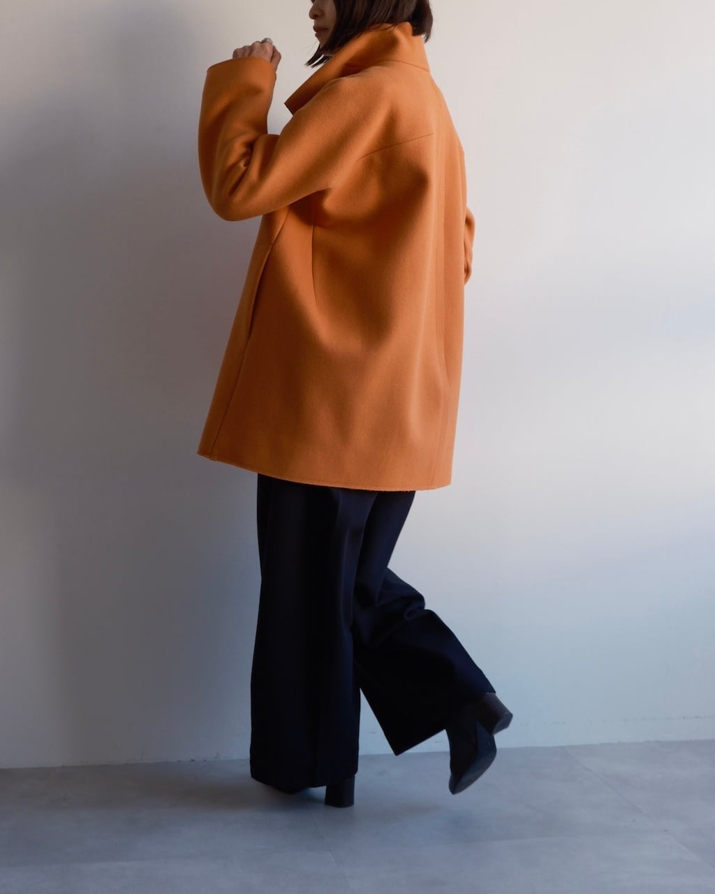美しいオレンジの色調と、体から離れる構築的なシルエットが印象的な一着。