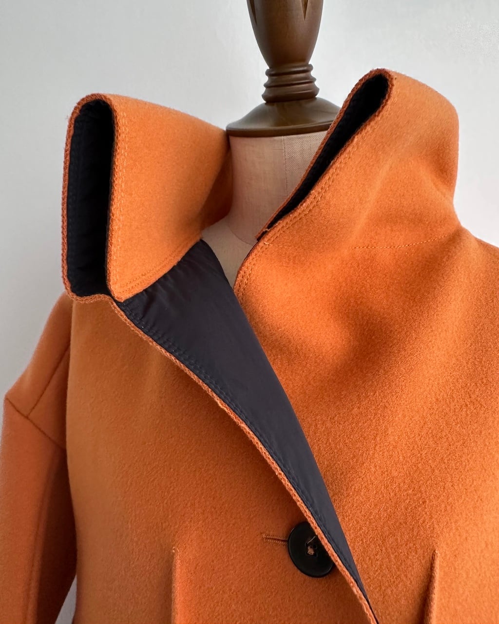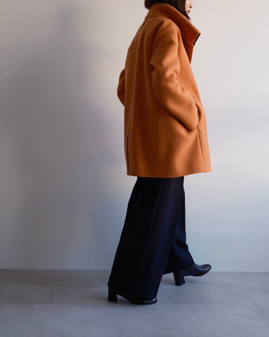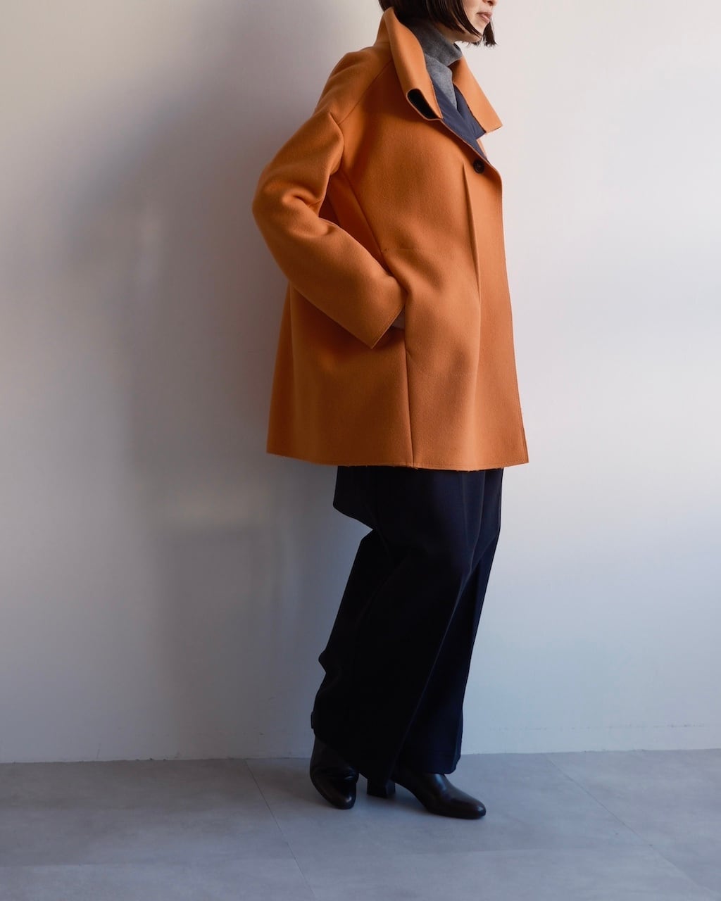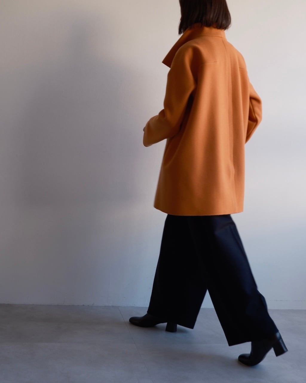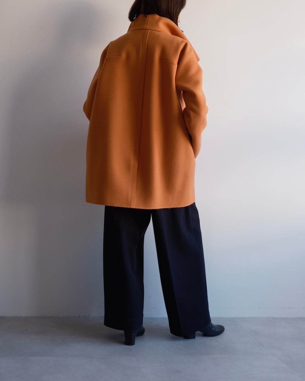 美しいオレンジの色調と、体から離れる構築的なシルエットが印象的な一着。