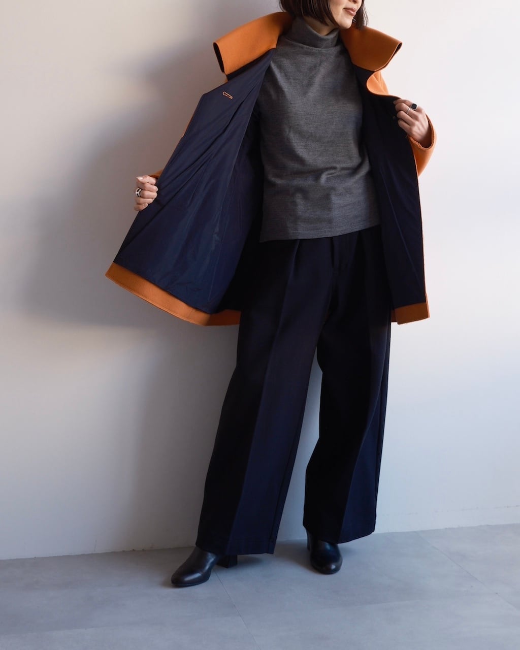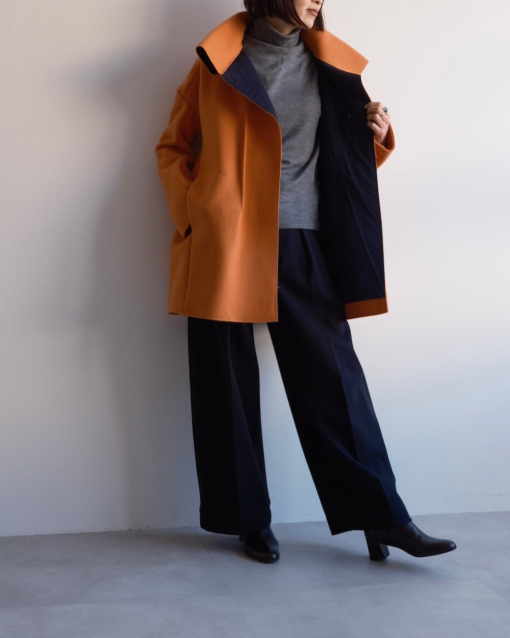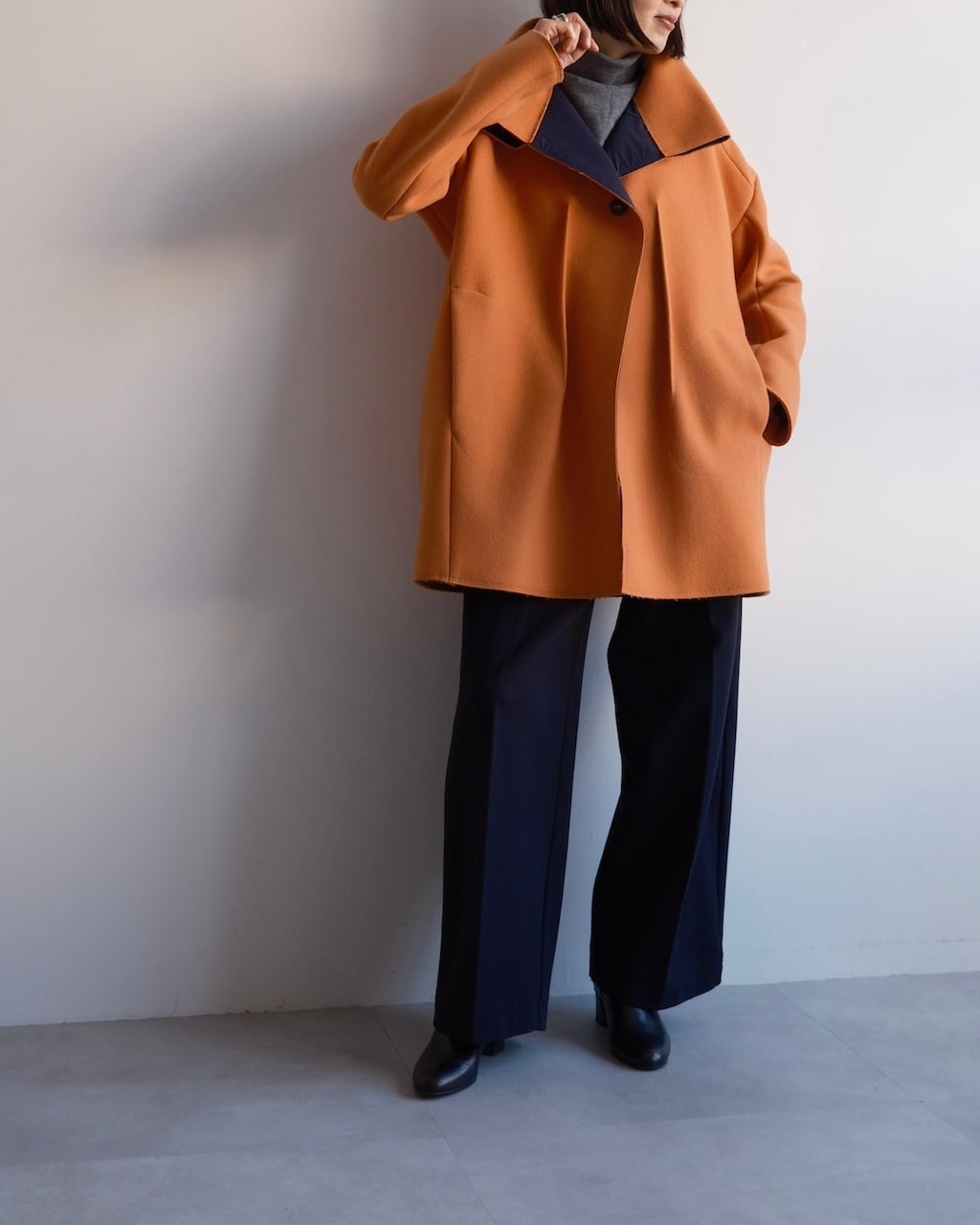 色・分量・デザインの美しさが目を惹くコート。