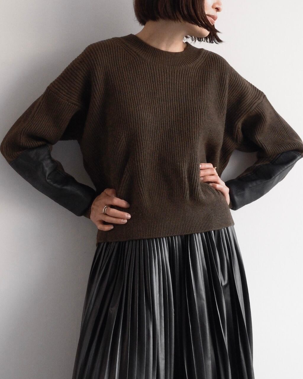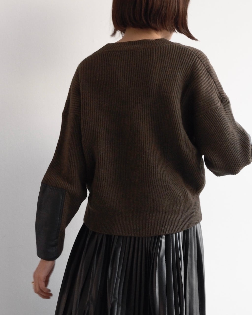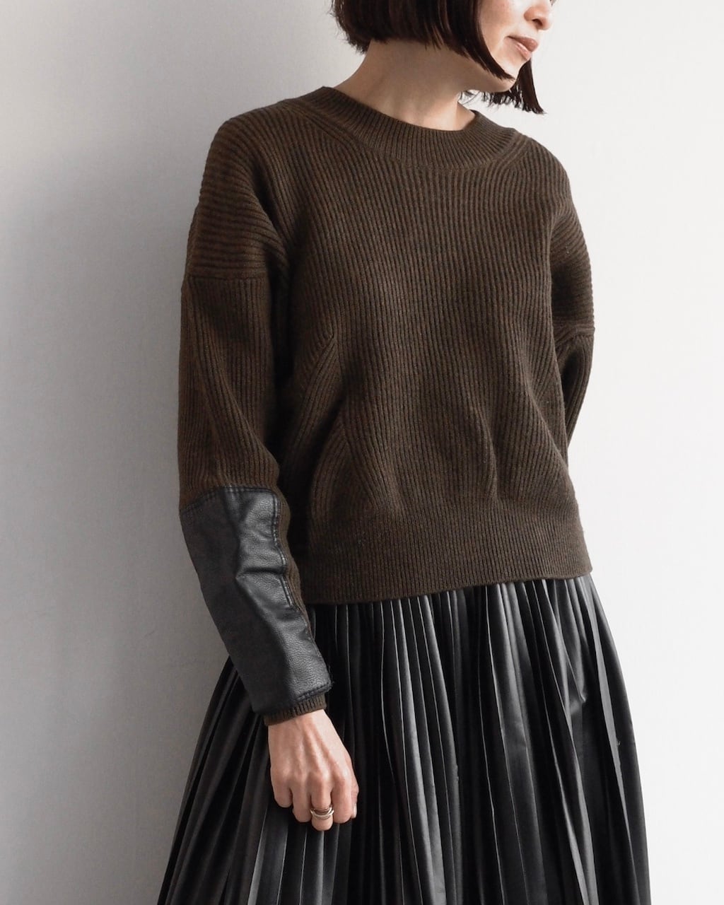 身頃から袖にかけてリブの向きを切り替えた編地に加え、裾はリブで程よく締めることで、自然な丸みを帯びた立体的なシルエットを形成。