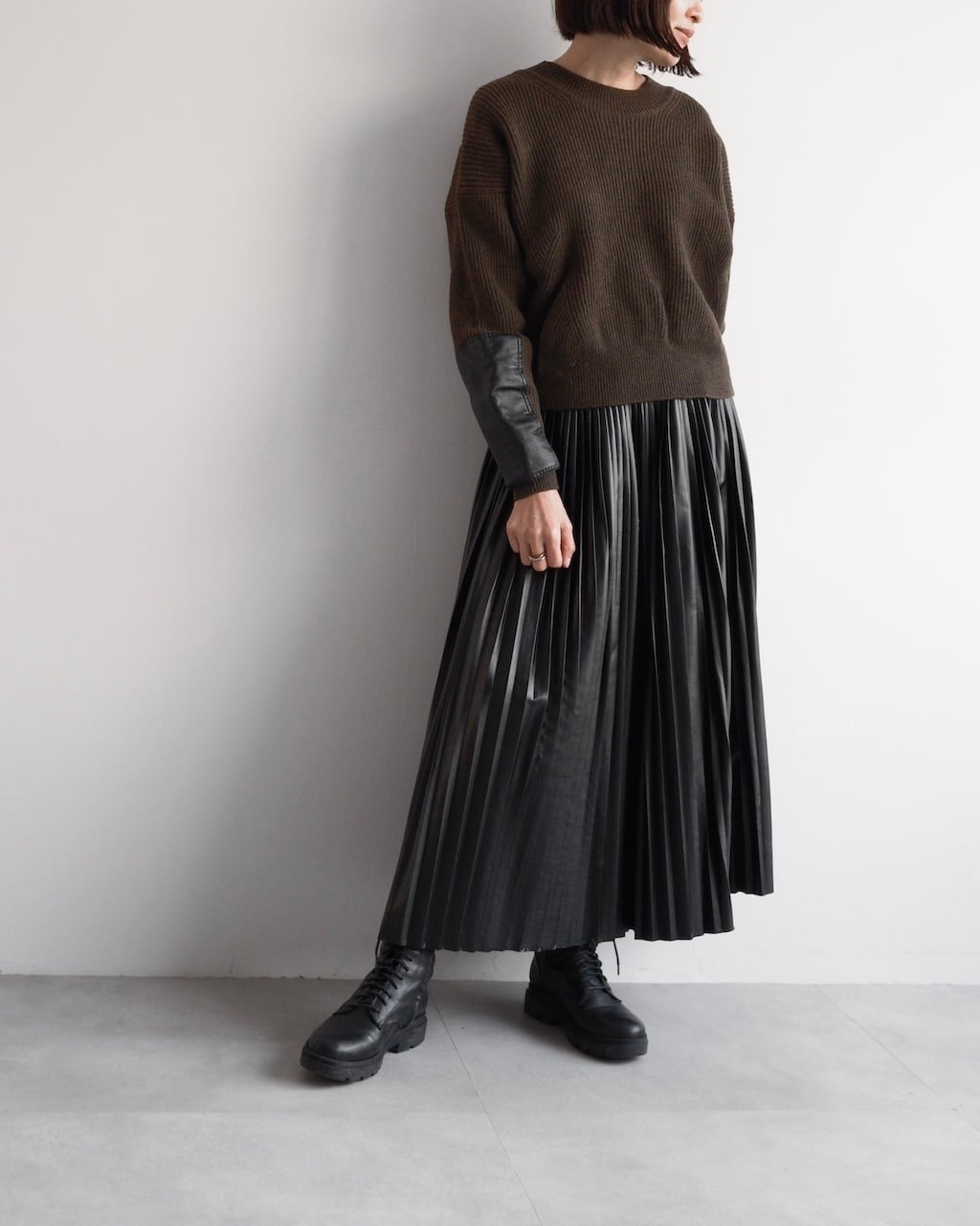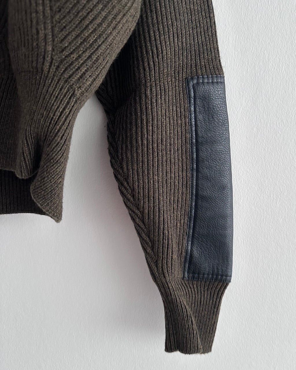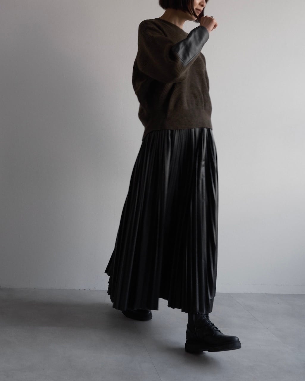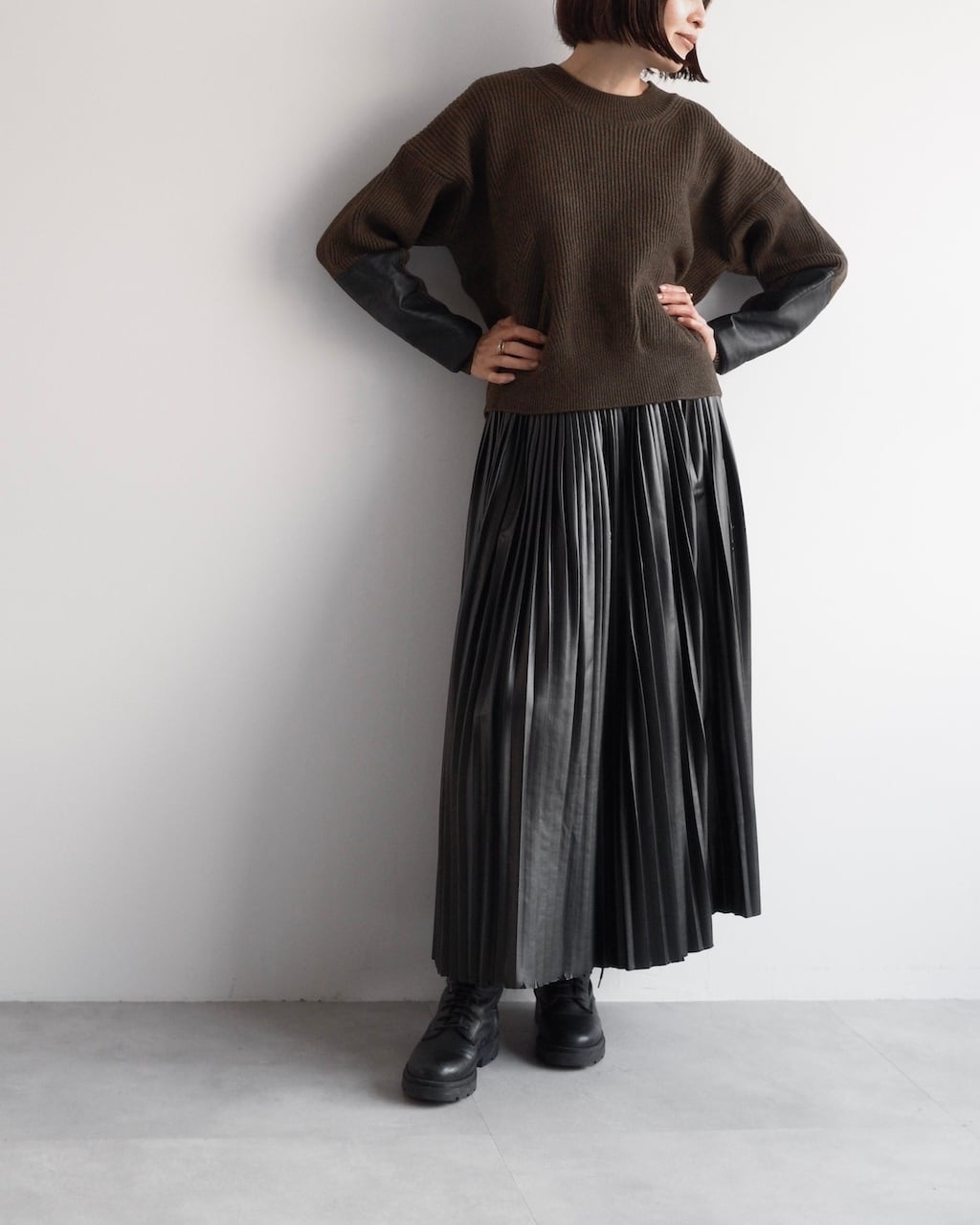 身頃から袖にかけてリブの向きを切り替えた編地に加え、裾はリブで程よく締めることで、自然な丸みを帯びた立体的なシルエットを形成。