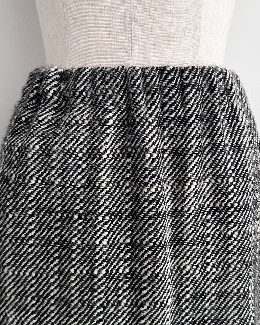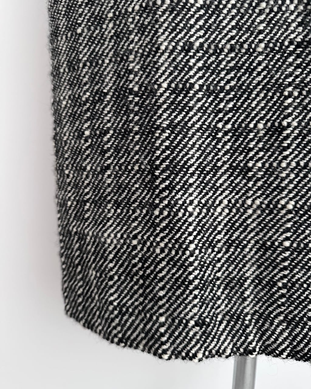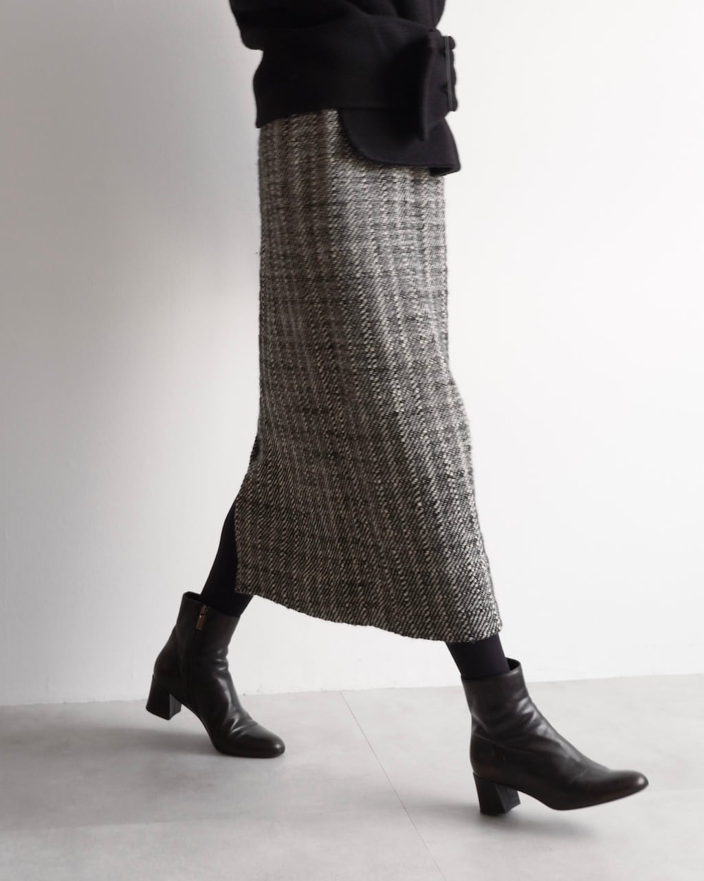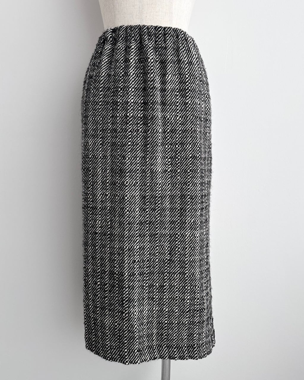 黒と白の糸が細かく織り込まれた生地は奥行きのある風合いで、シンプルながら存在感のあるスカートです。