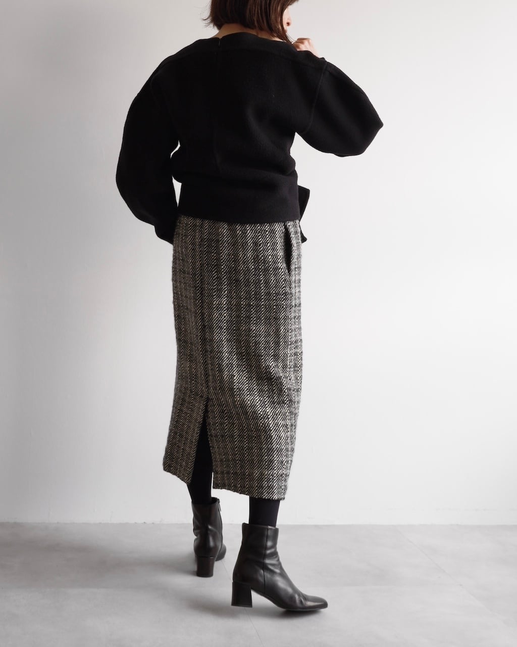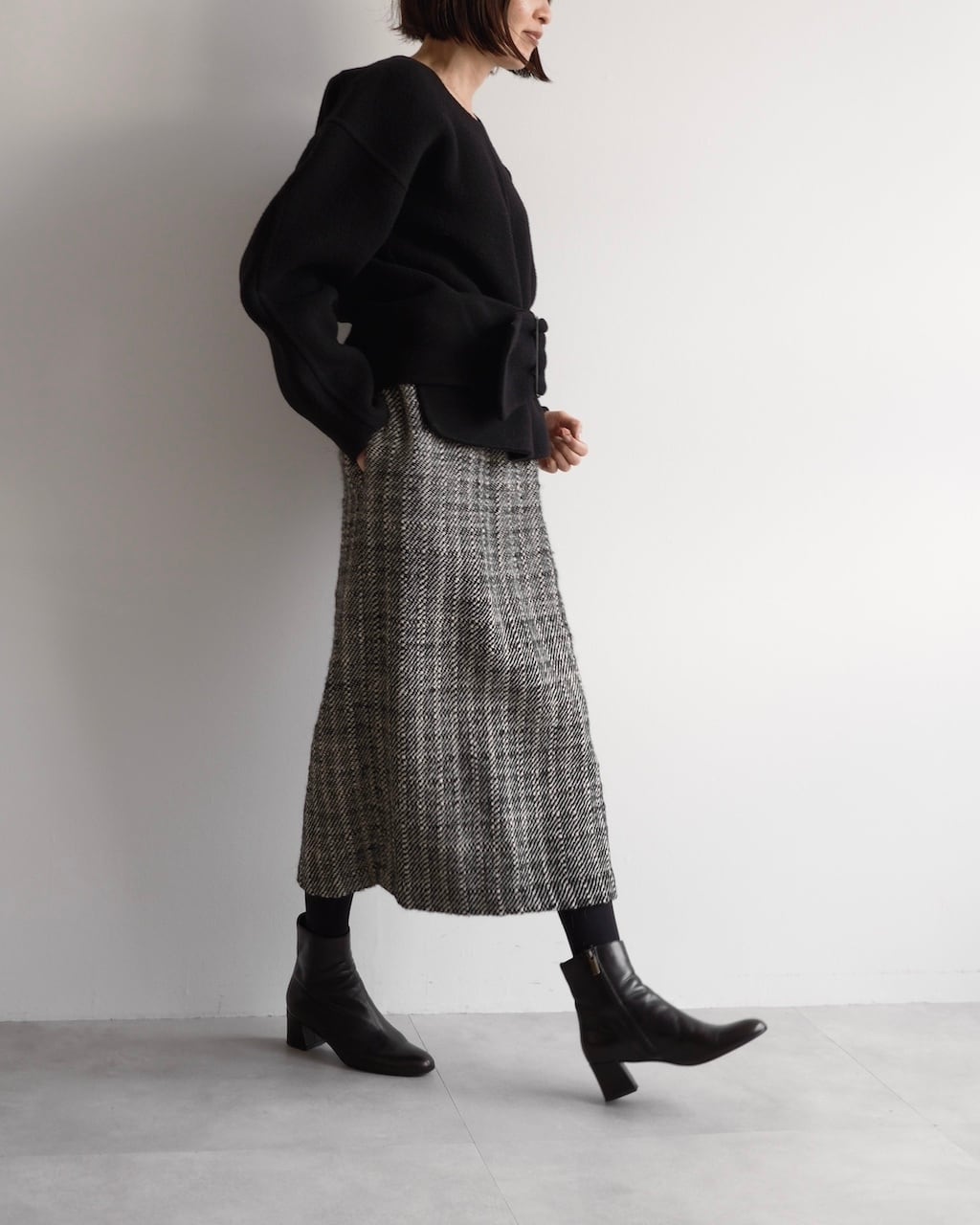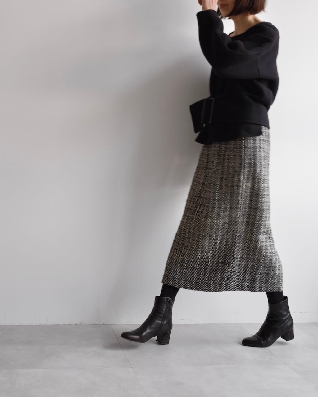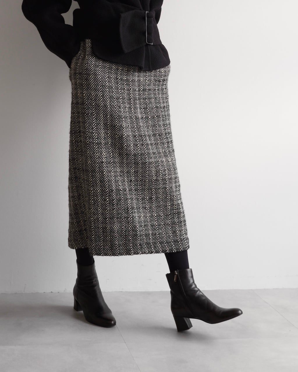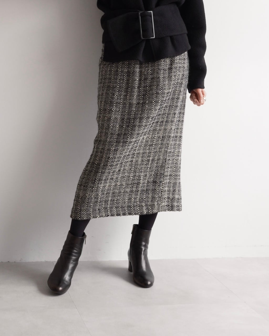 黒と白の糸が細かく織り込まれた生地は奥行きのある風合いで、シンプルながら存在感のあるスカートです。
