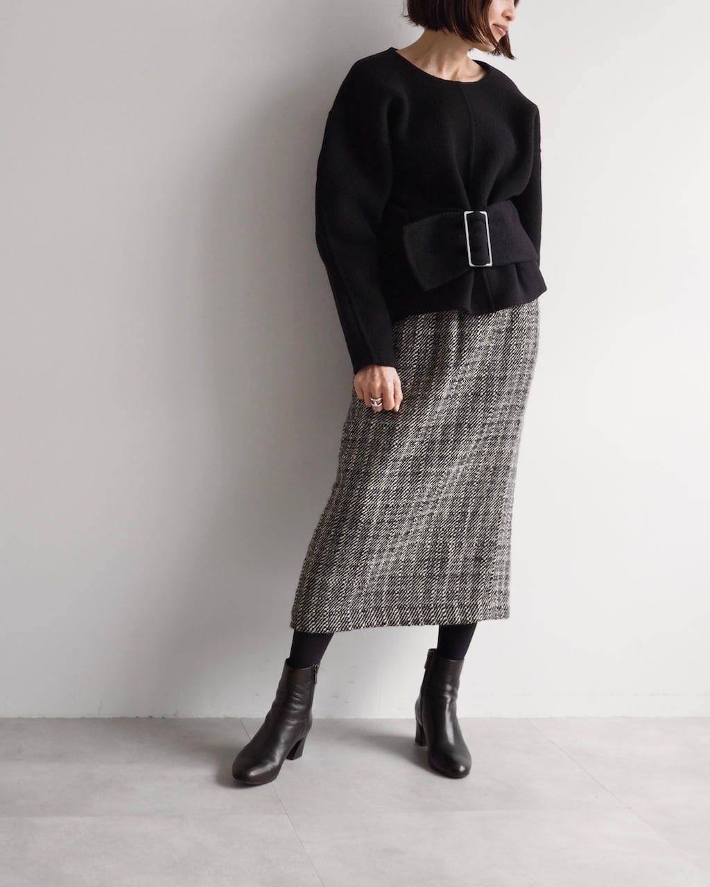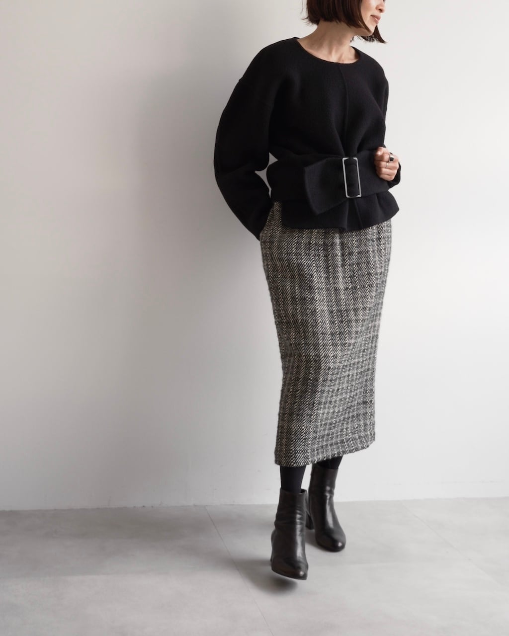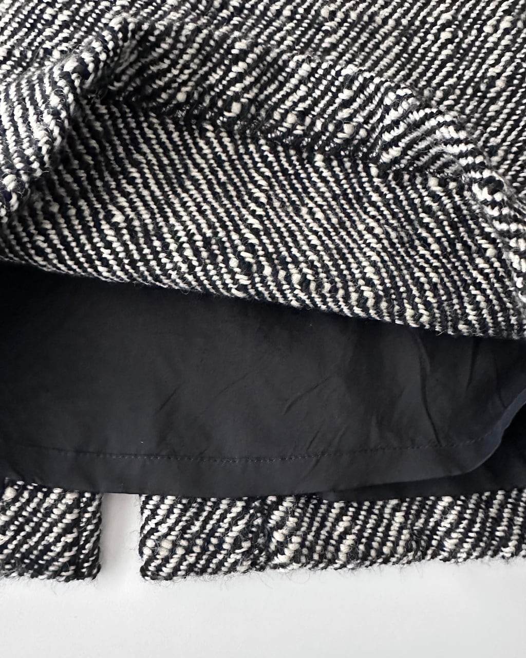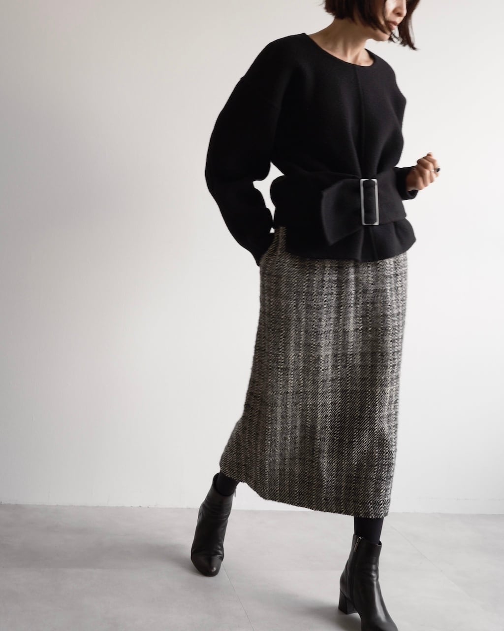 黒と白の糸が細かく織り込まれた生地は奥行きのある風合いで、シンプルながら存在感のあるスカートです。