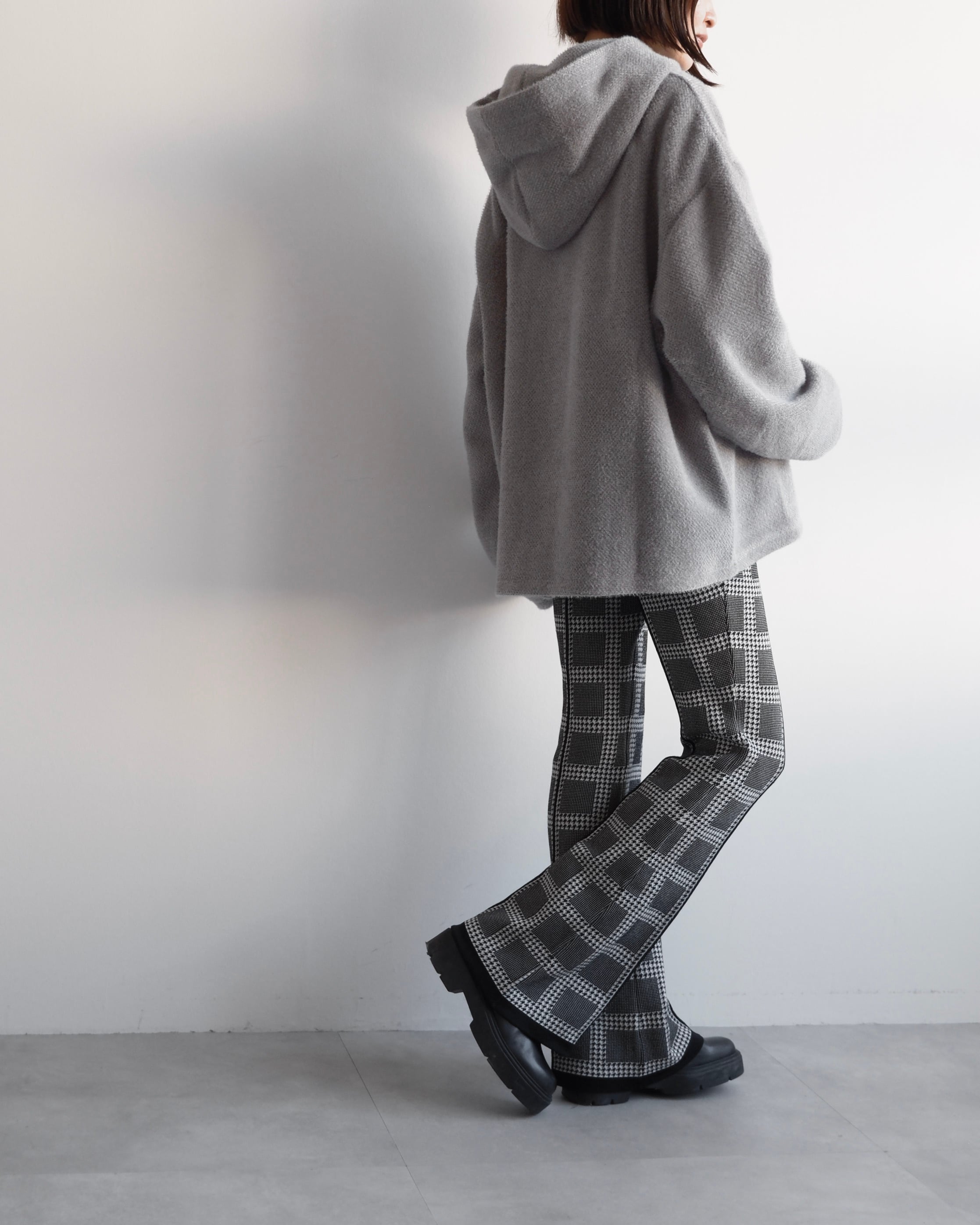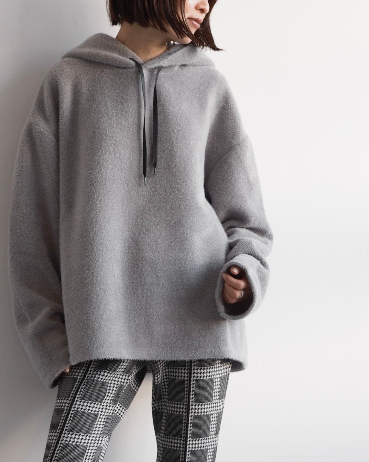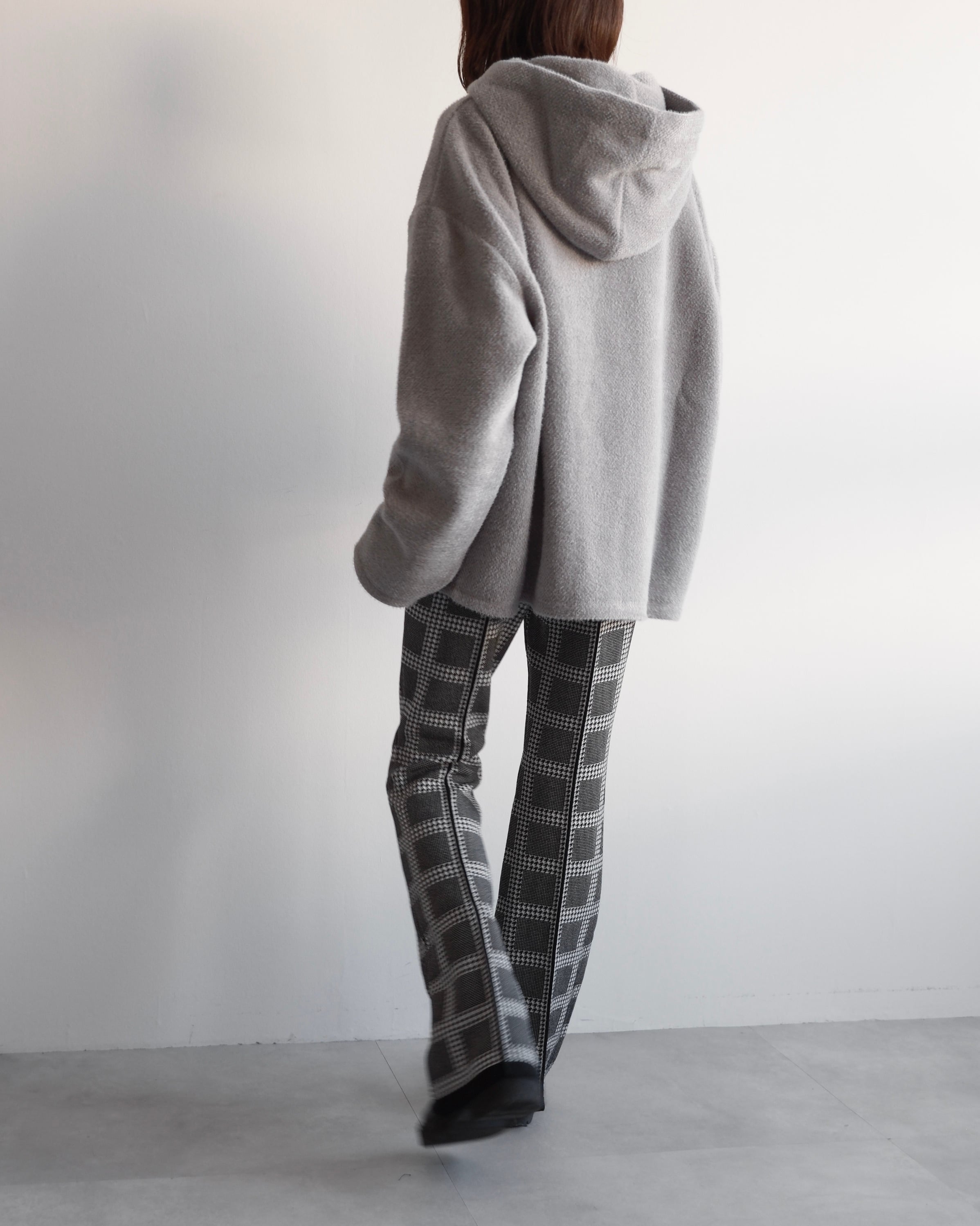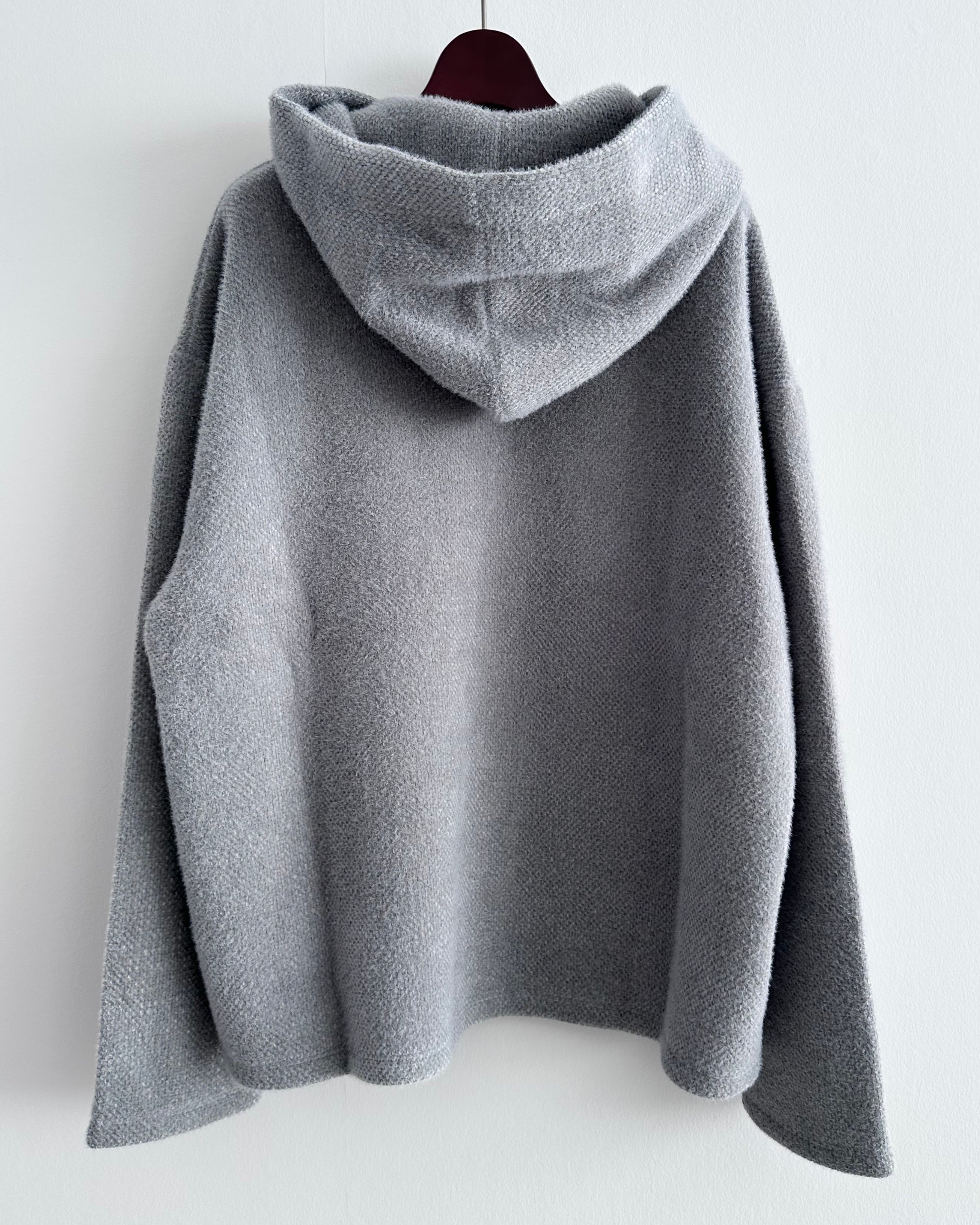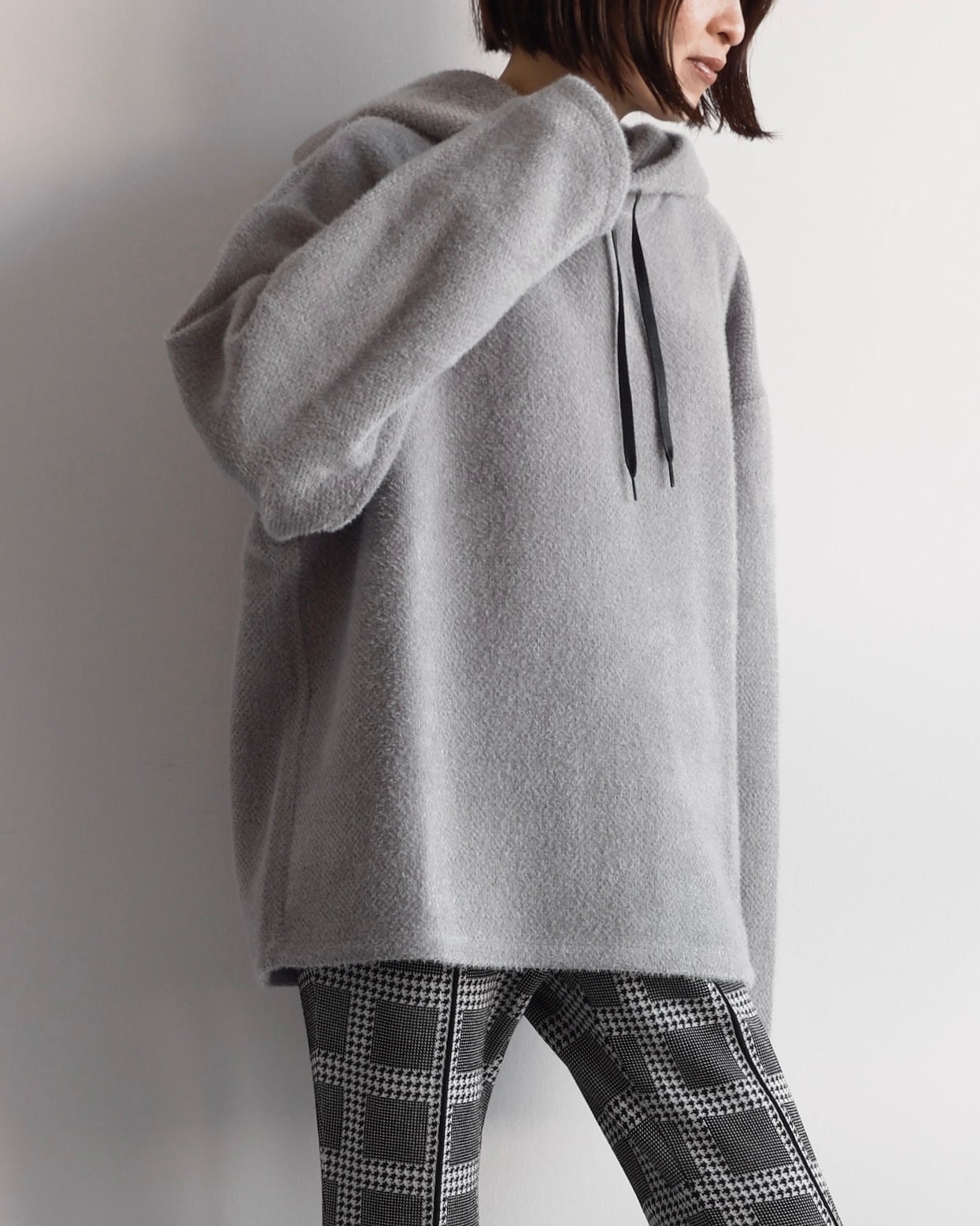 クシュっと自然な立体感をもたせたフードが顔まわりを穏やかに包み込み、後ろ姿にも柔らかな陰影をつくります。