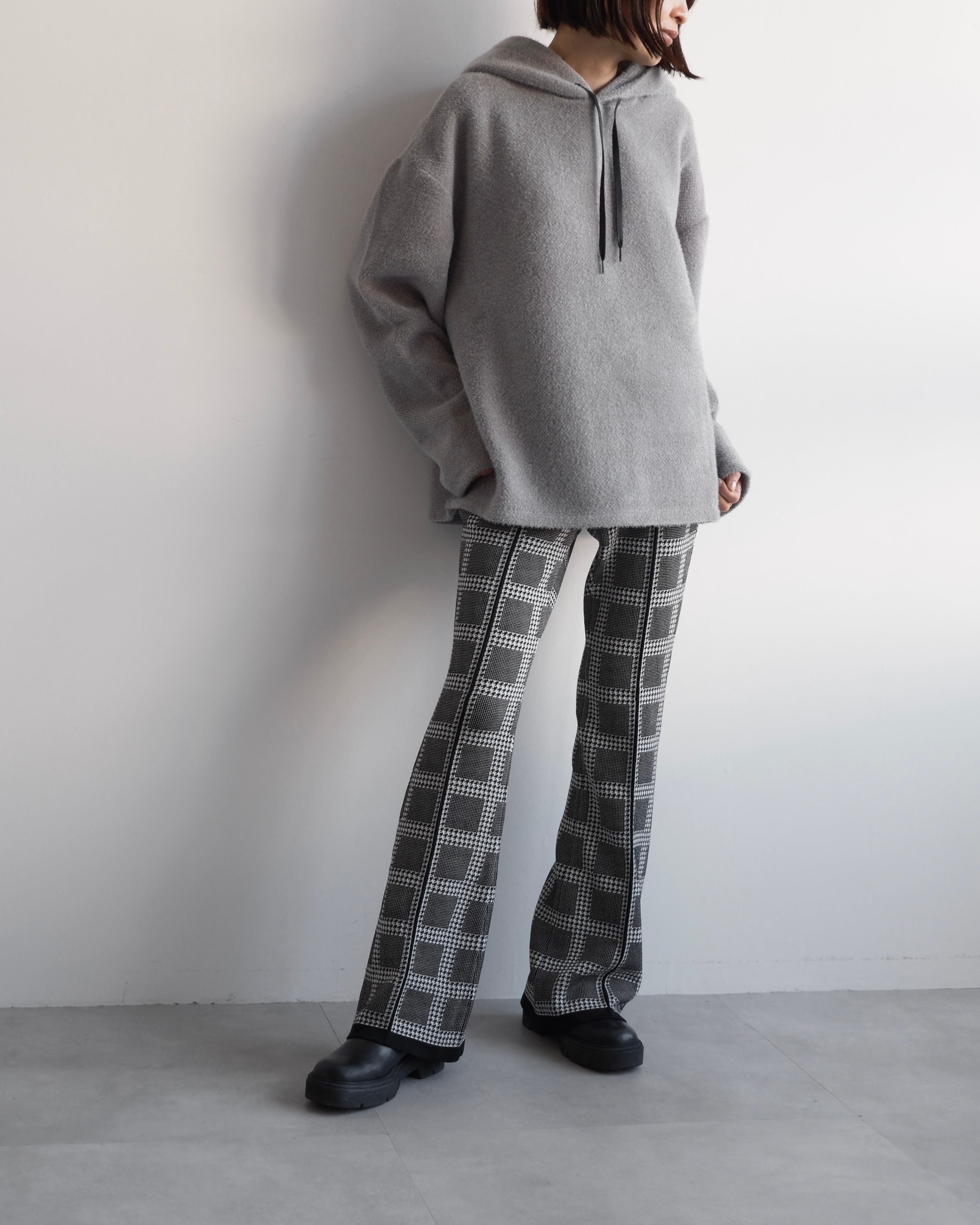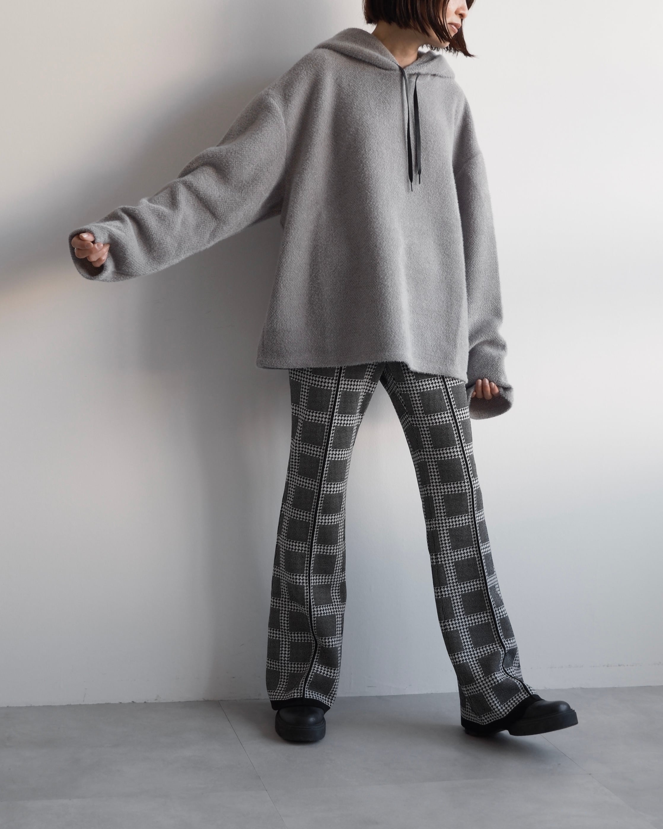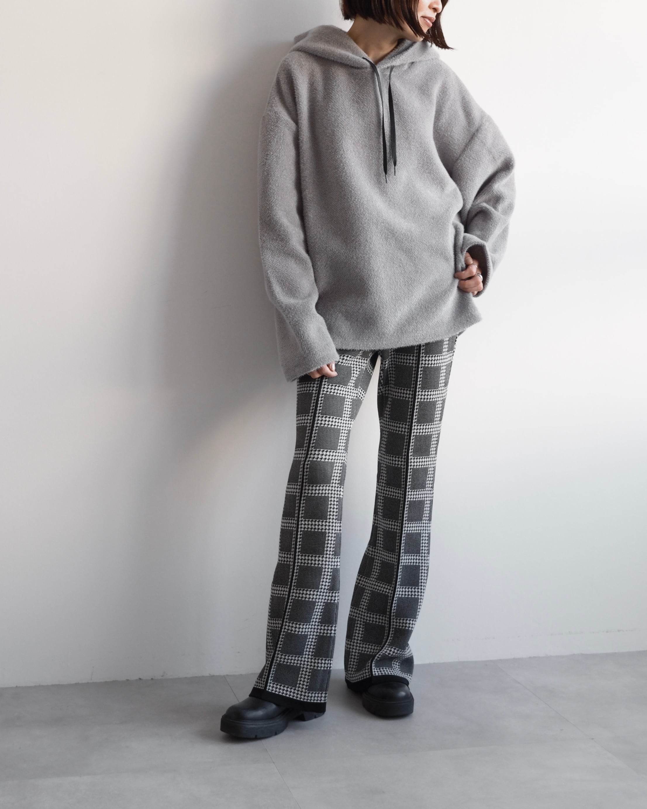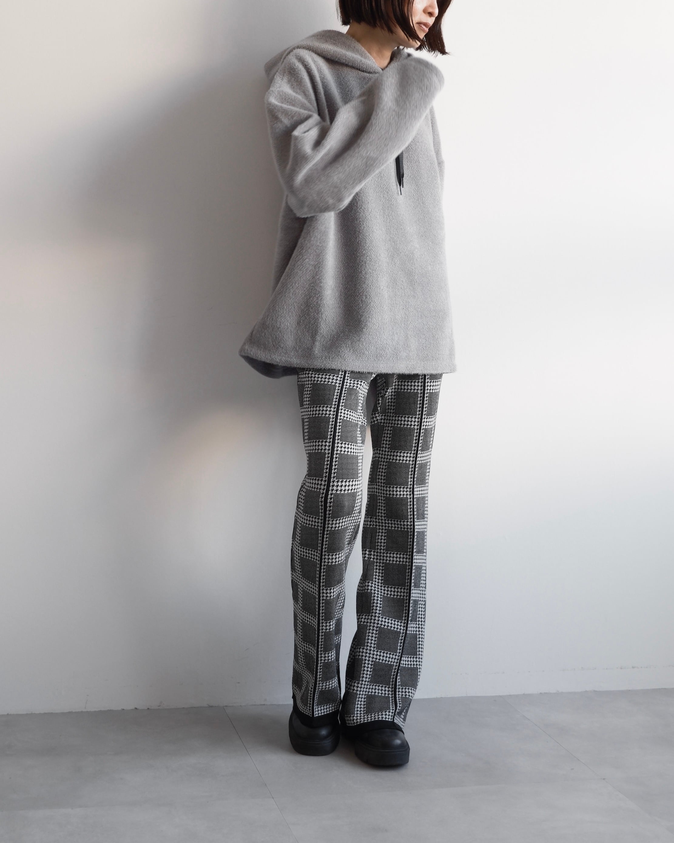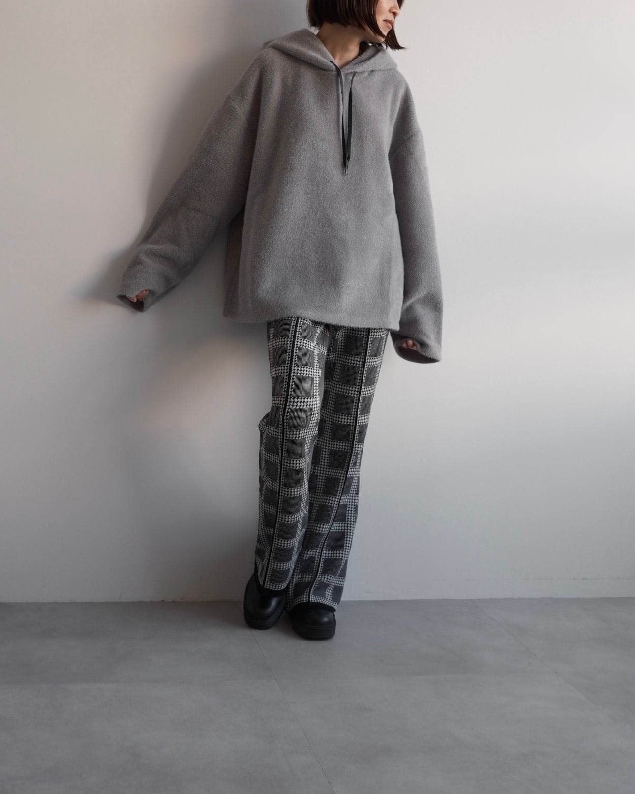 クシュっと自然な立体感をもたせたフードが顔まわりを穏やかに包み込み、後ろ姿にも柔らかな陰影をつくります。