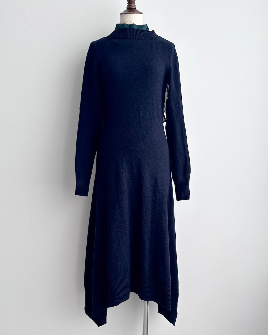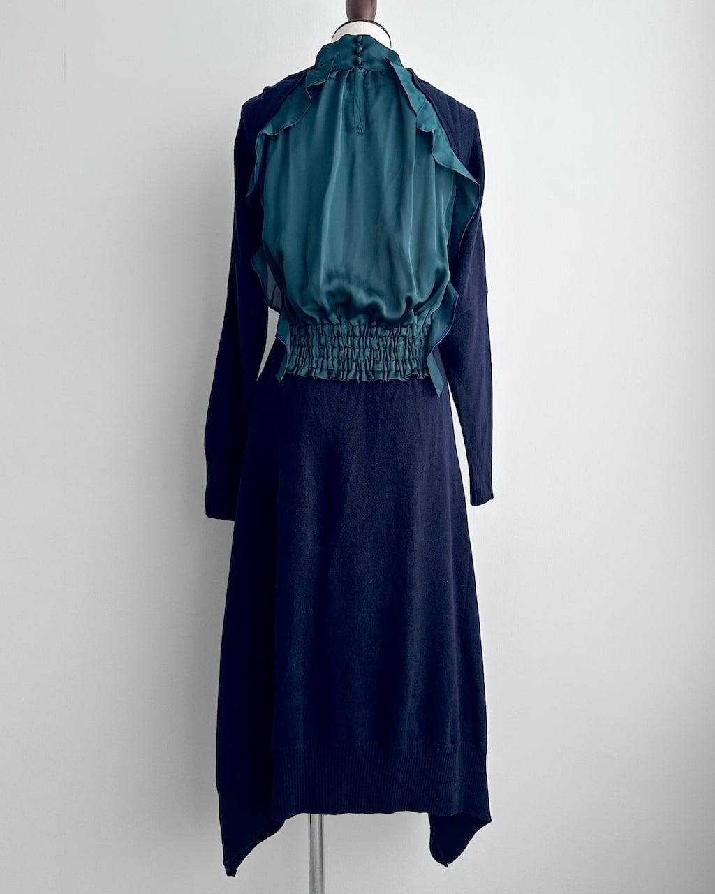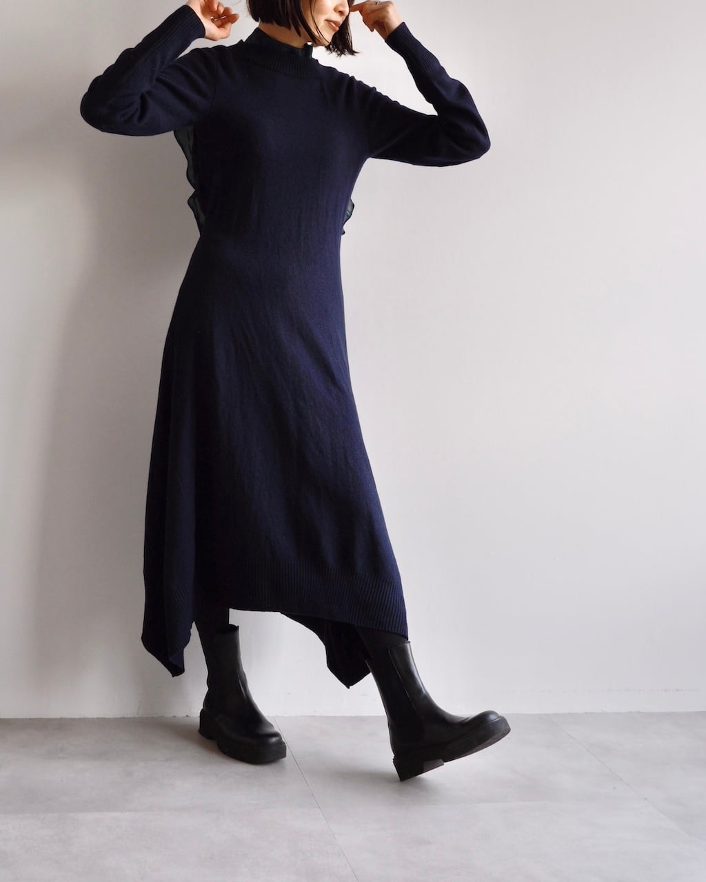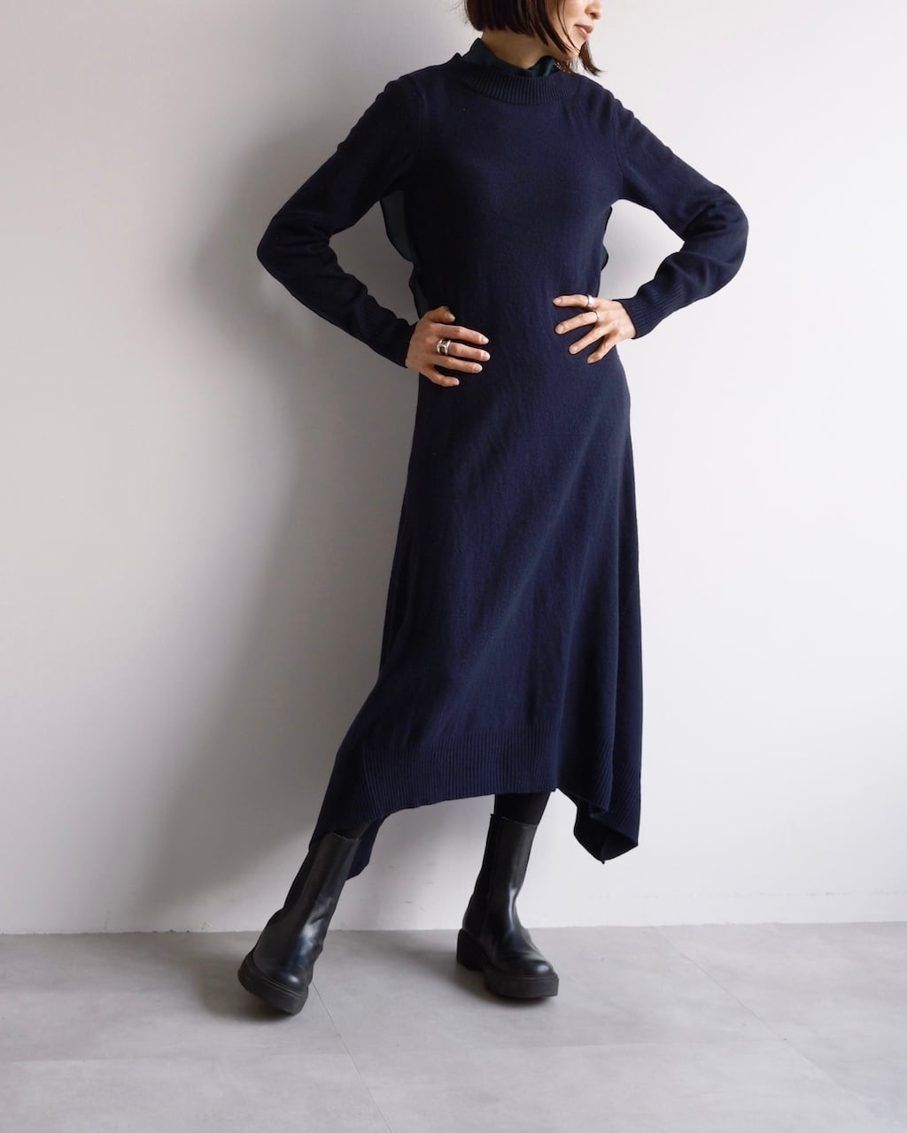 ネイビーのウールニットドレスに、バックスタイルに異素材を組み合わせた sacai らしい一着。