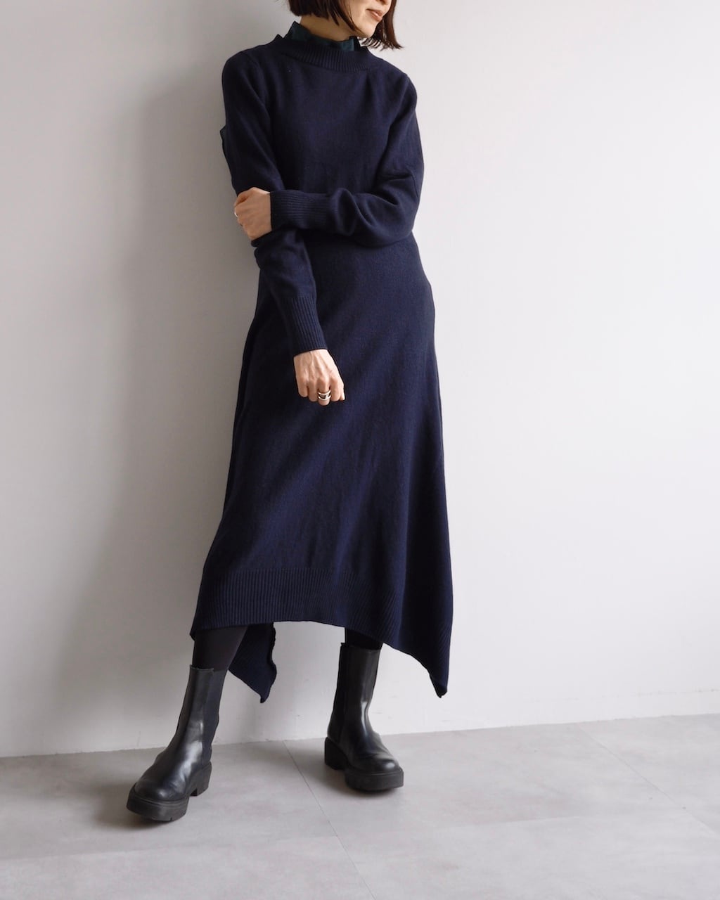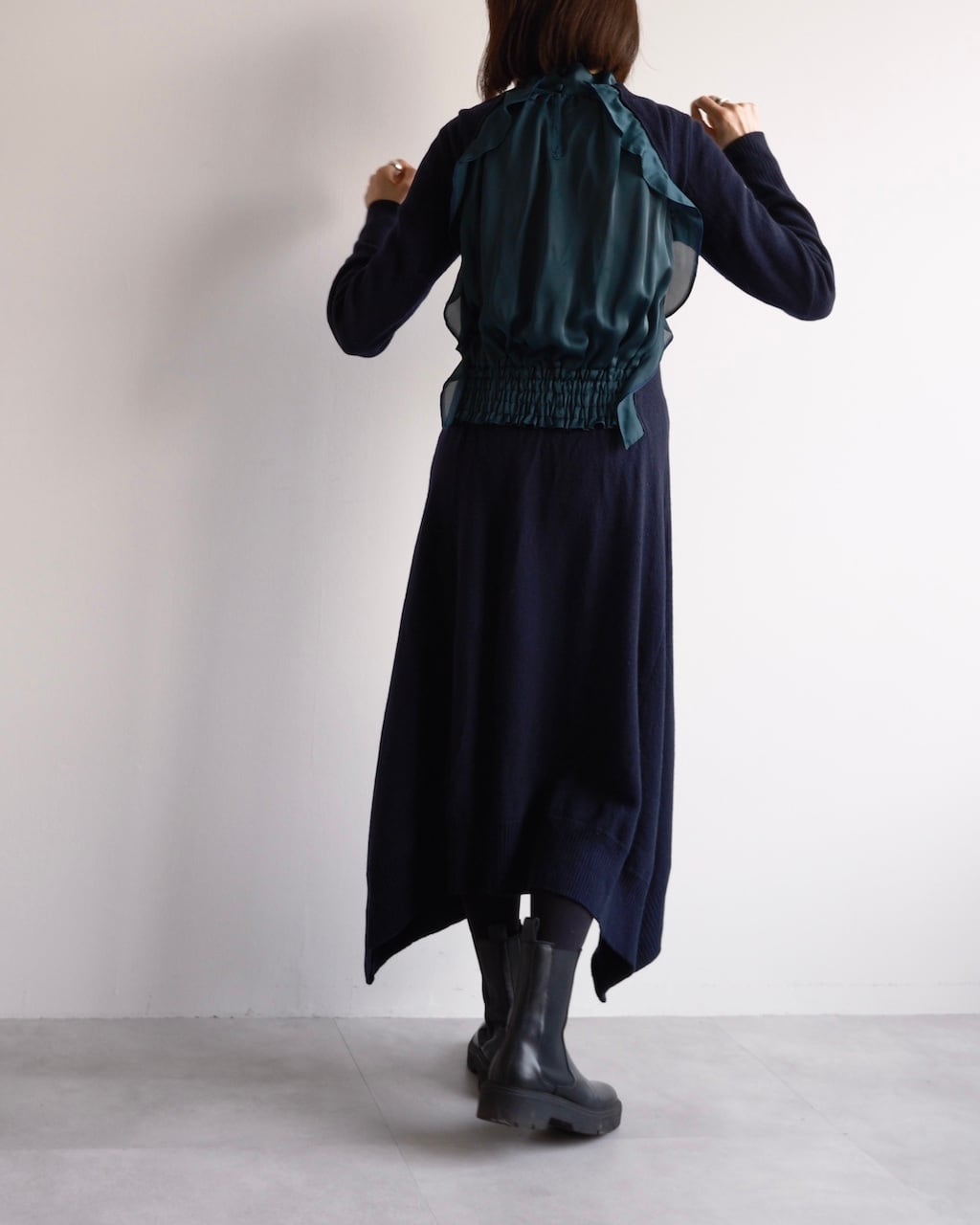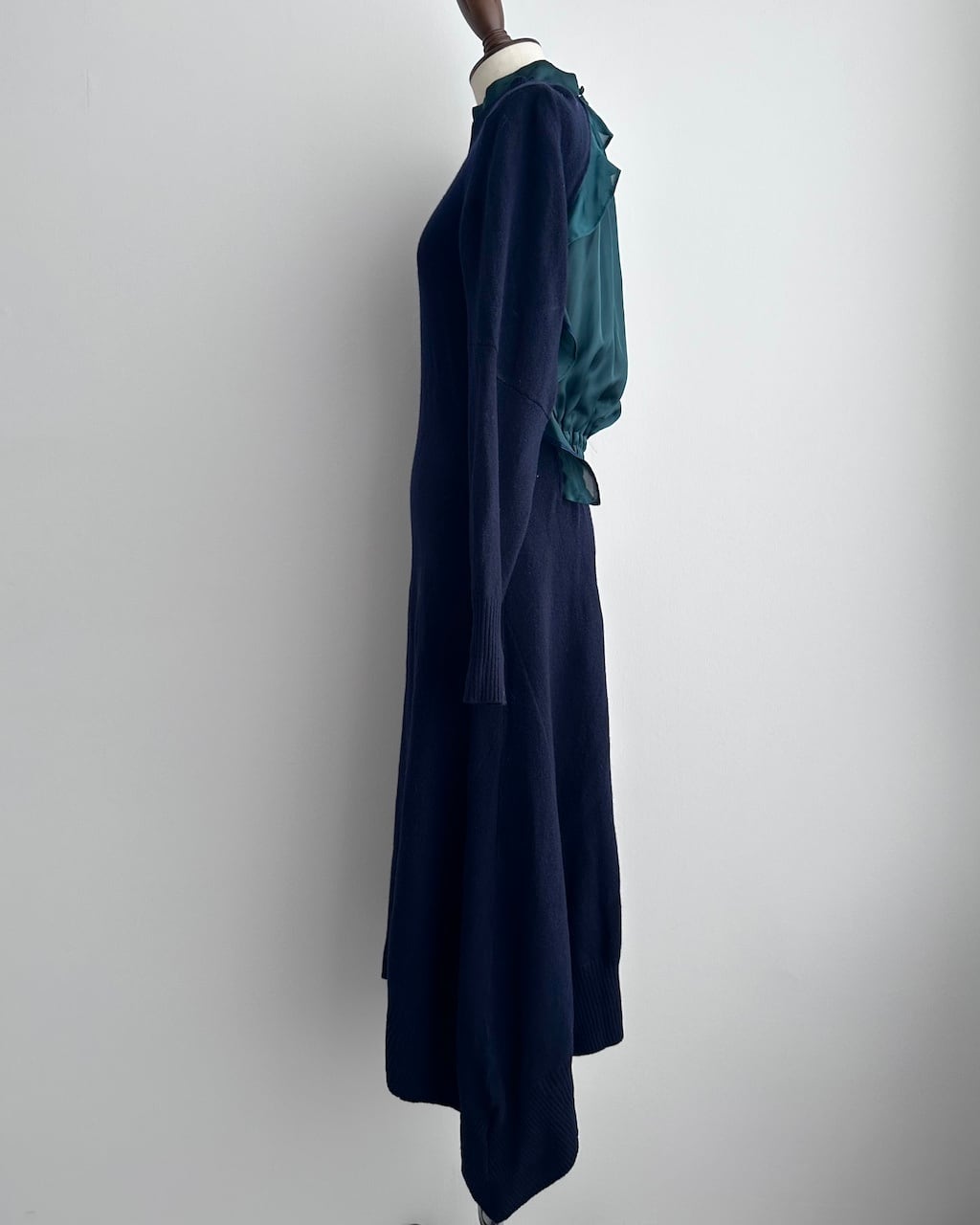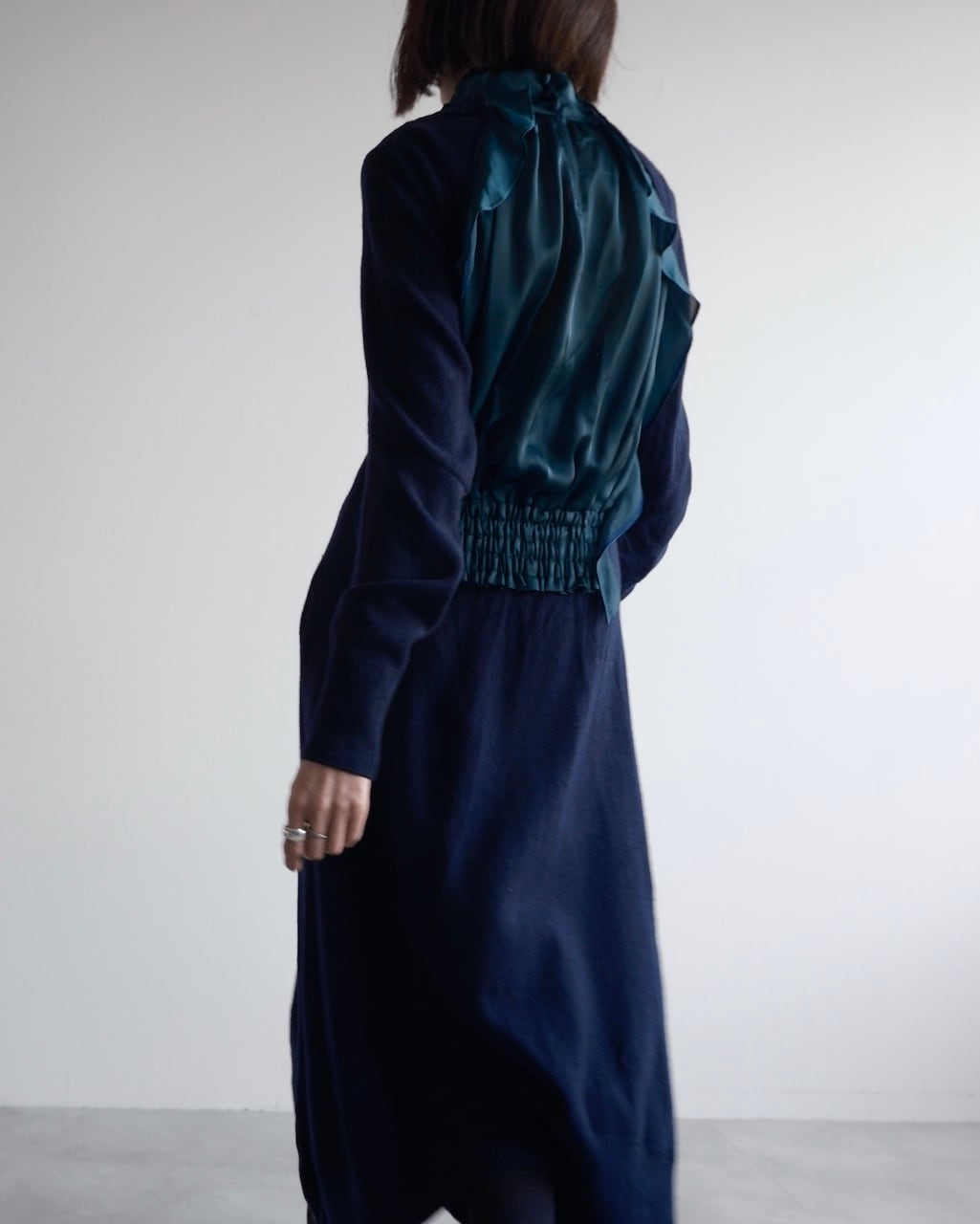 ネイビーのウールニットドレスに、バックスタイルに異素材を組み合わせた sacai らしい一着。