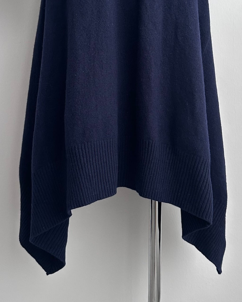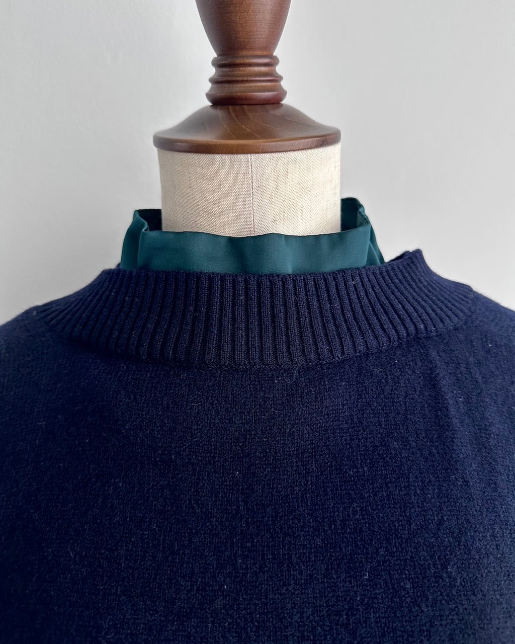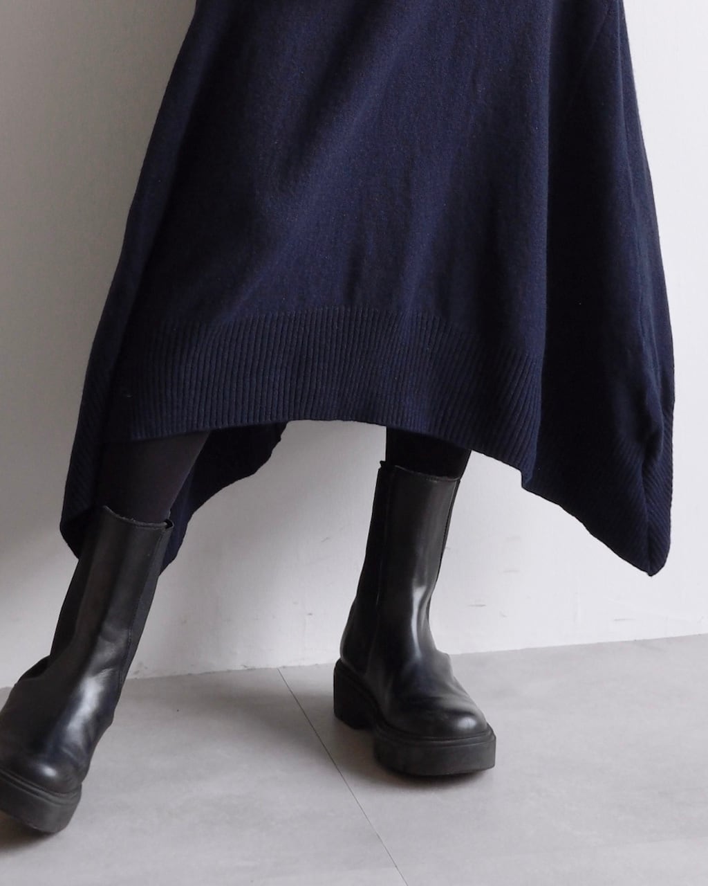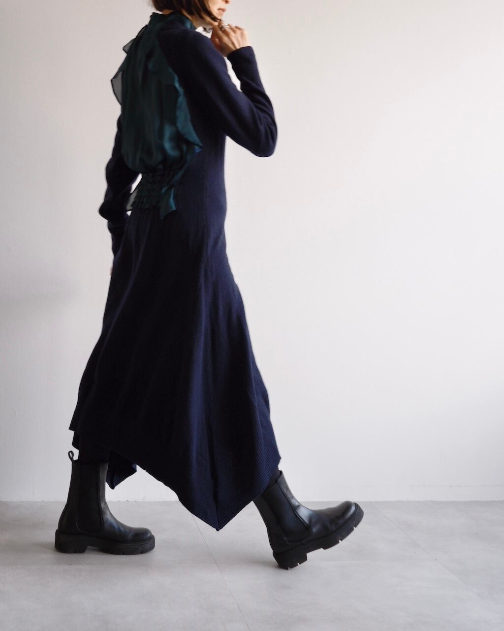 ネイビーのウールニットドレスに、バックスタイルに異素材を組み合わせた sacai らしい一着。