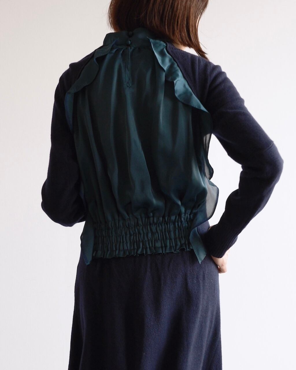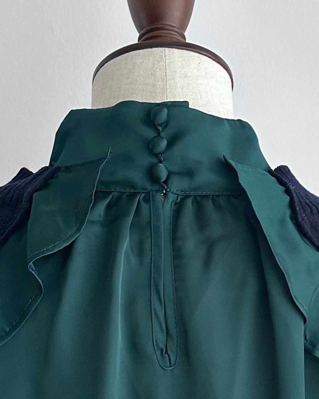 首元後ろにはクラシカルなくるみボタンが配され、前から見た時もちらっとグリーンが覗く仕様に。