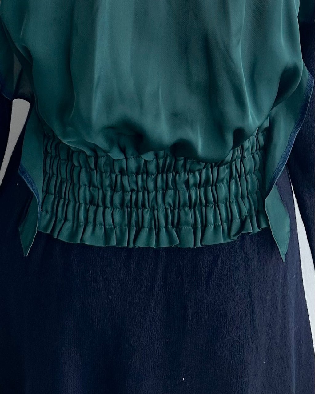 背中部分はギャザーによるシャーリング仕様で、ウエスト位置にメリハリをプラス。