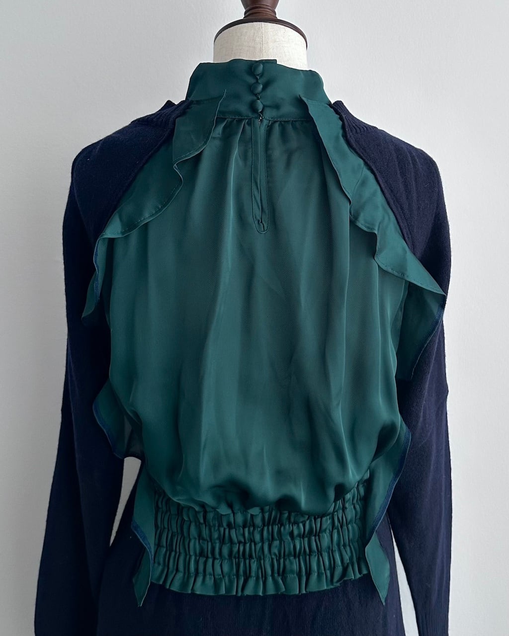 フロントはミニマルなロングニットドレスで、背面には光沢のあるグリーン色のポリエステル素材を重ね、立体的なコントラストを生み出しています。