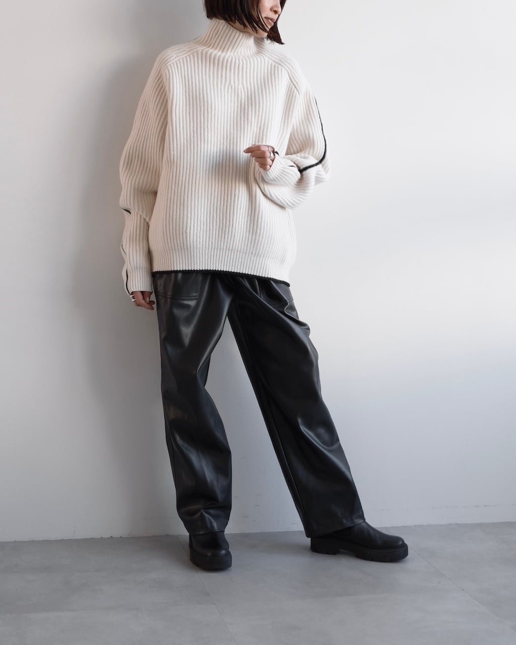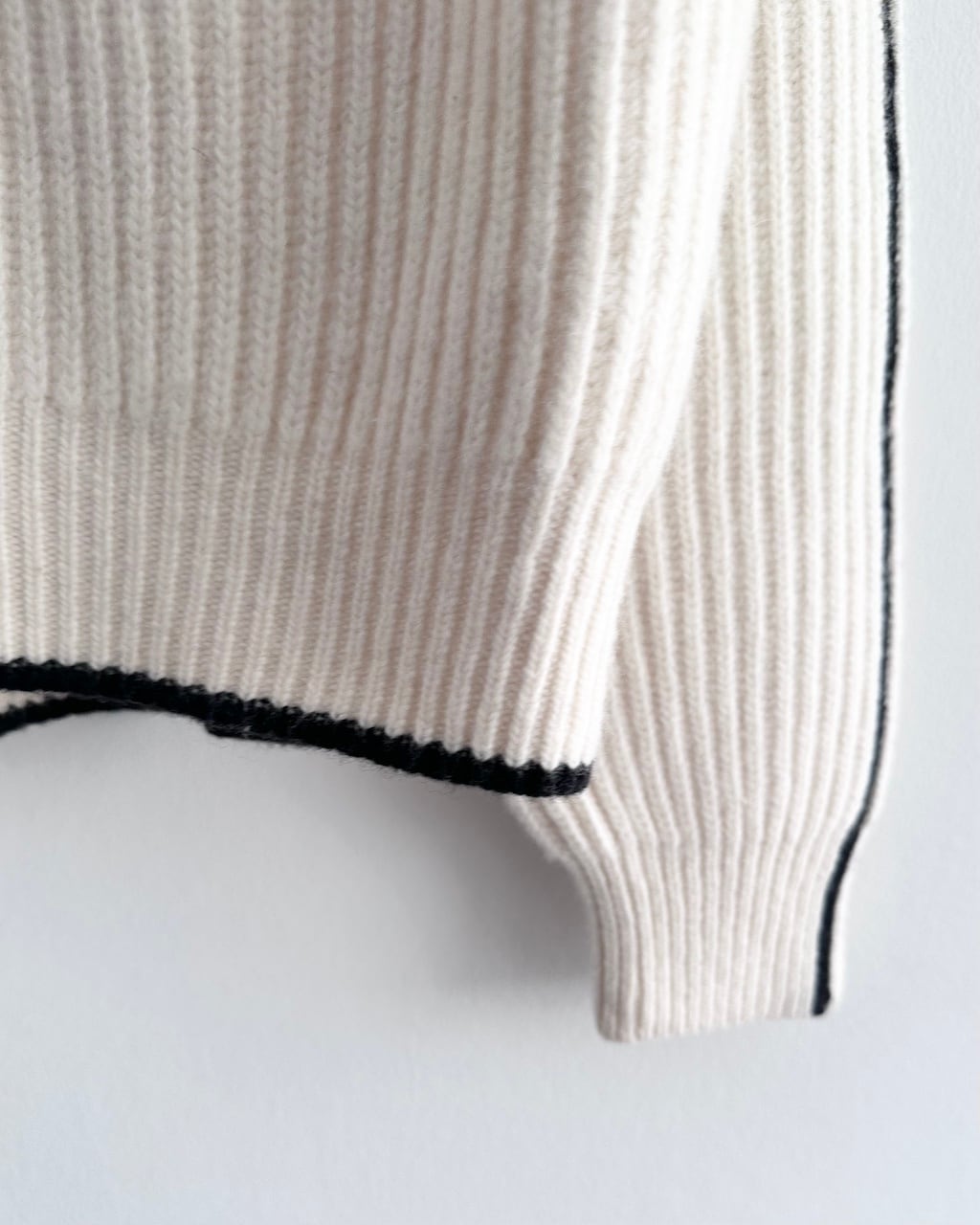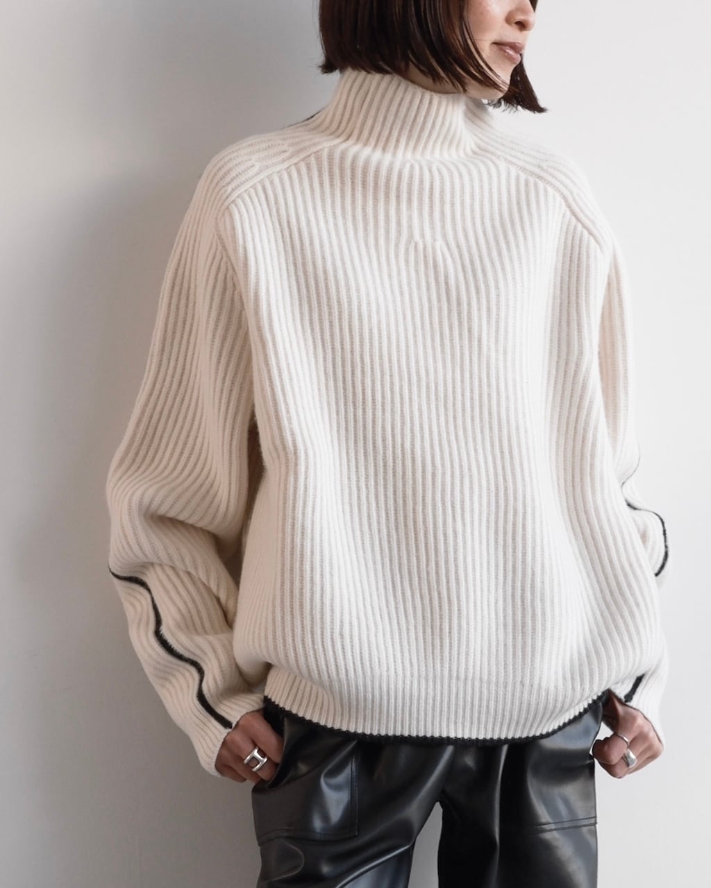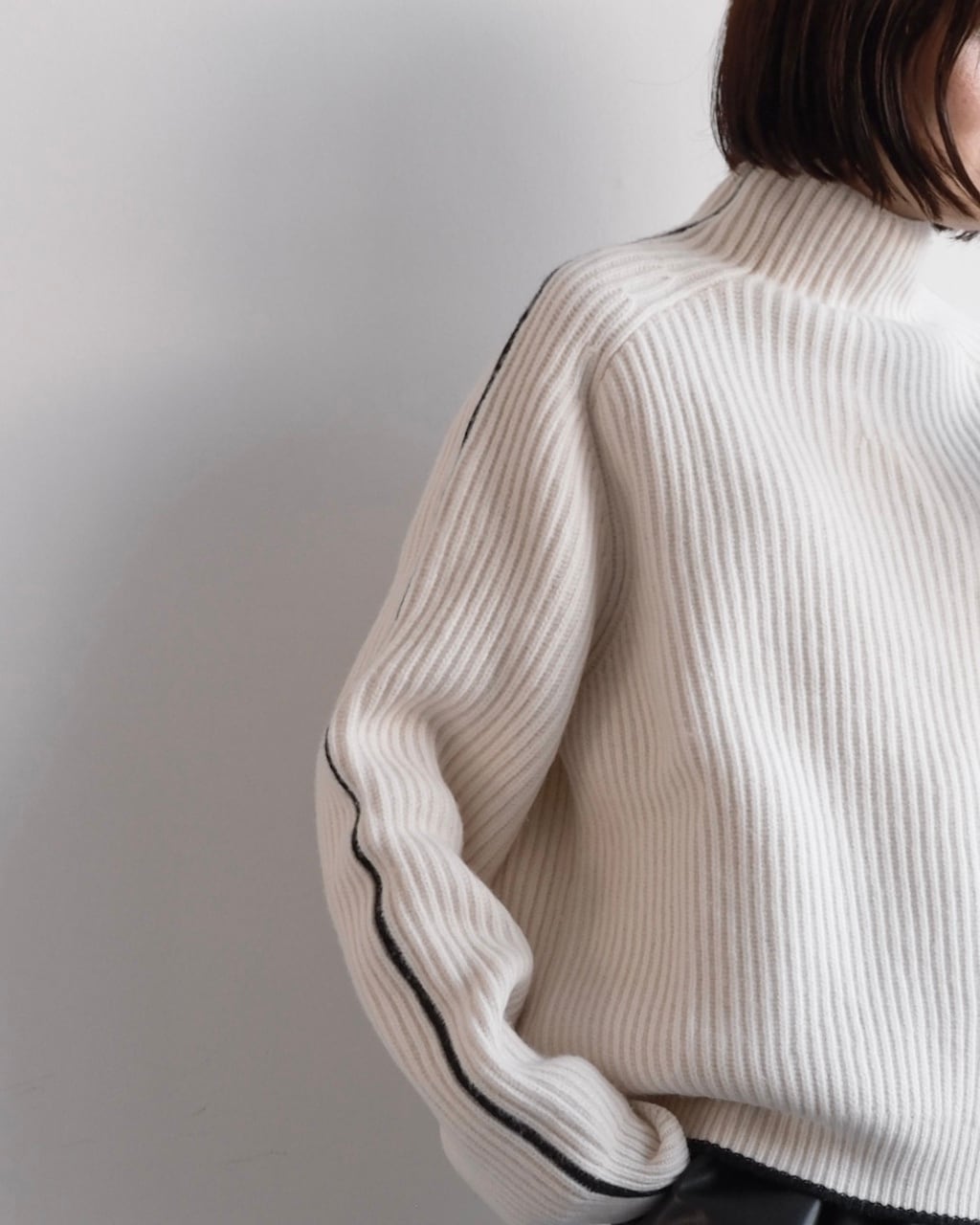 オフホワイトのボディに、袖と裾に配されたブラックのラインがアクセントに。