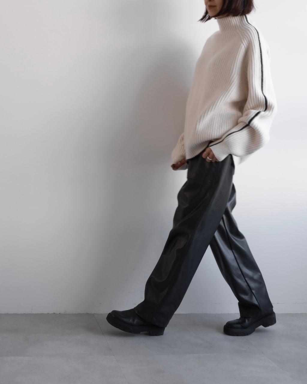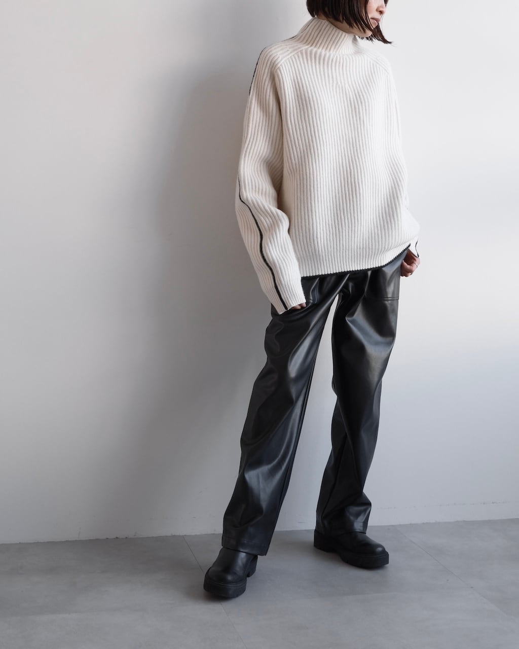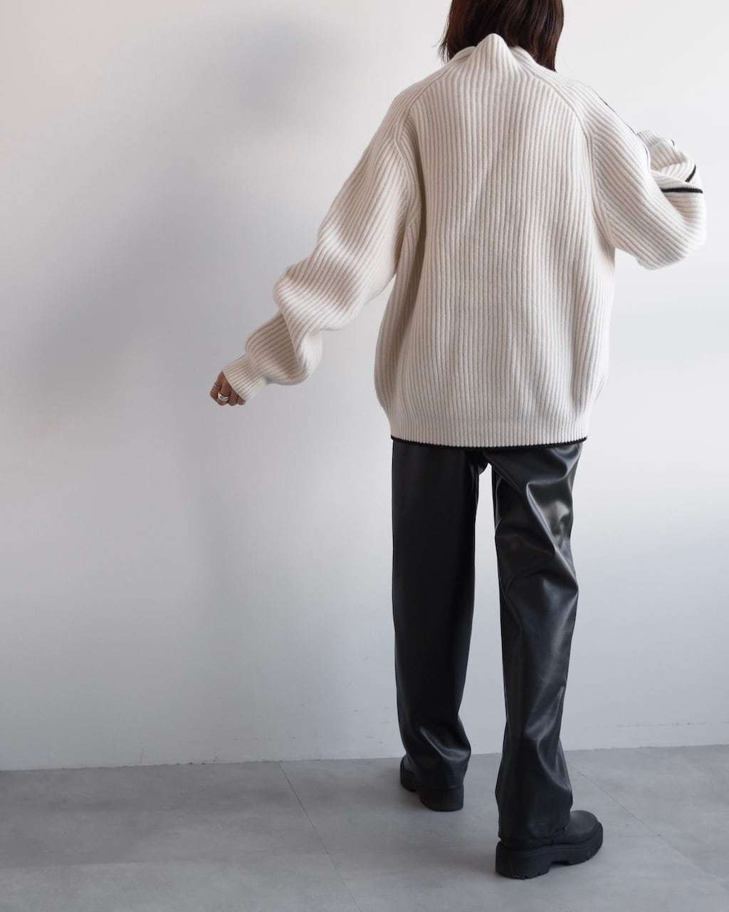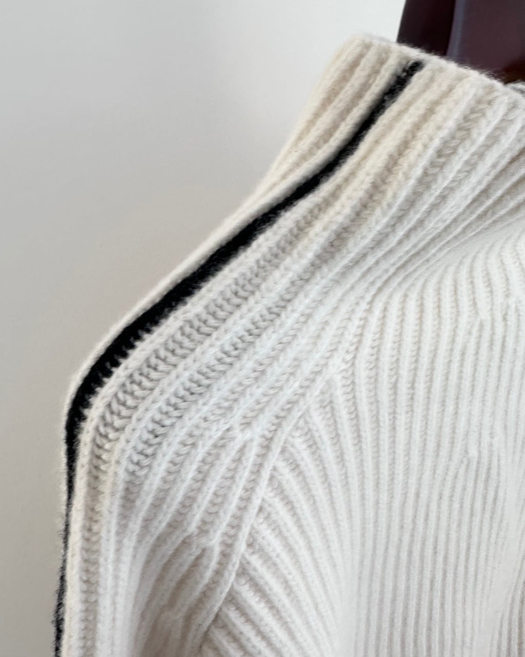 オフホワイトのボディに、袖と裾に配されたブラックのラインがアクセントに。