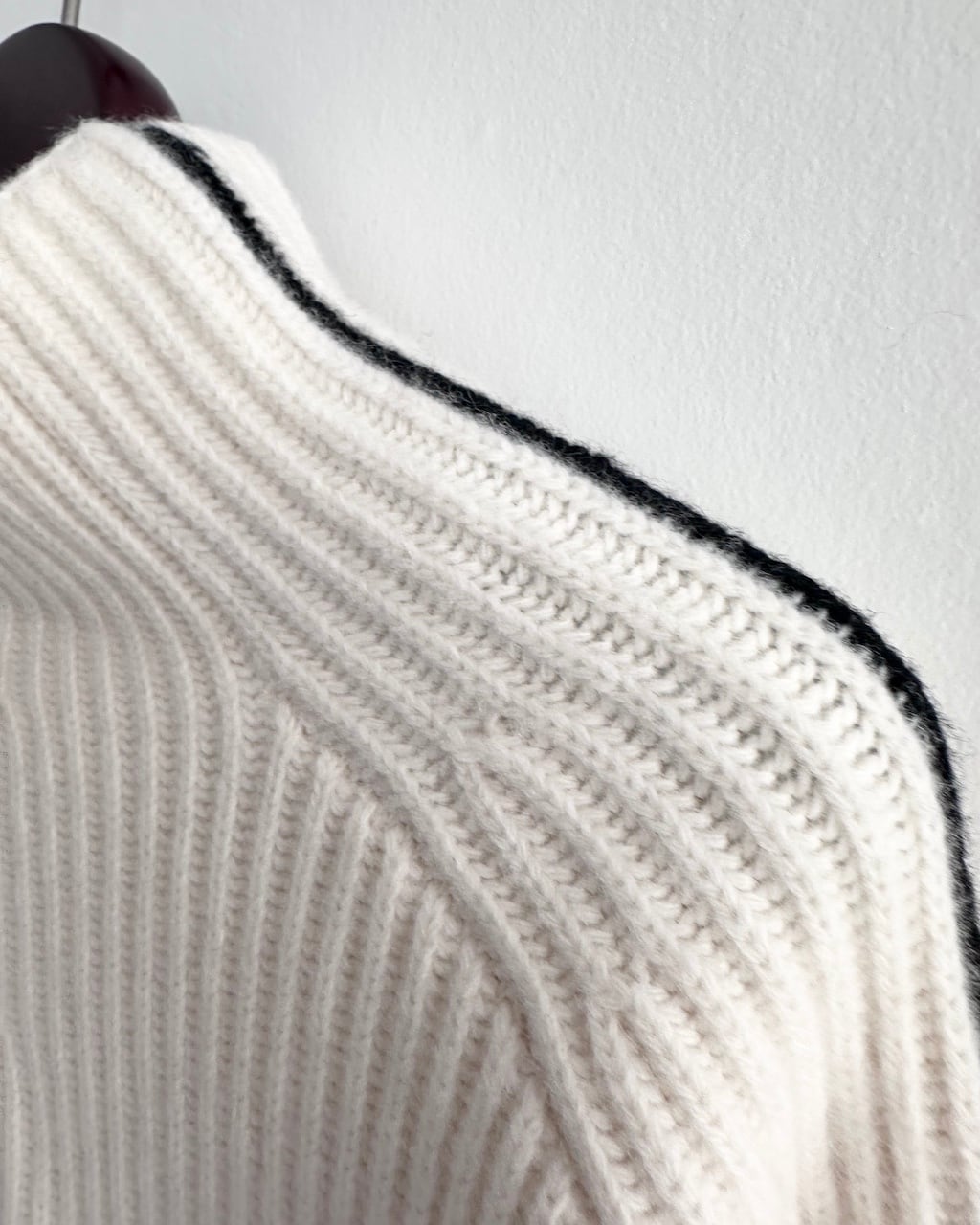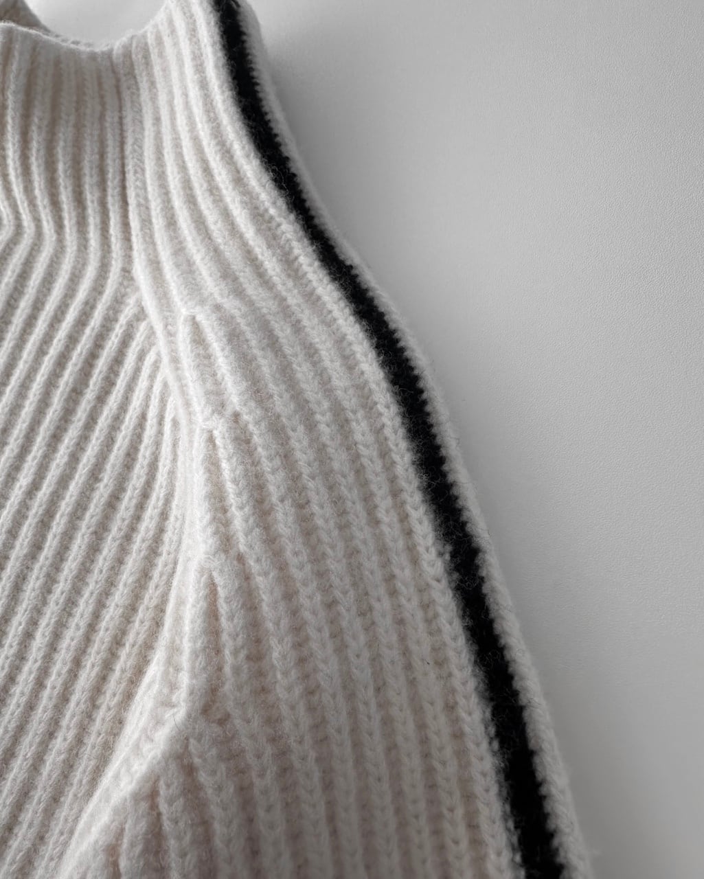 縦畝のはっきりとしたリブ編みと肩から袖にかけて自然に流れるラグランスリーブが特徴。