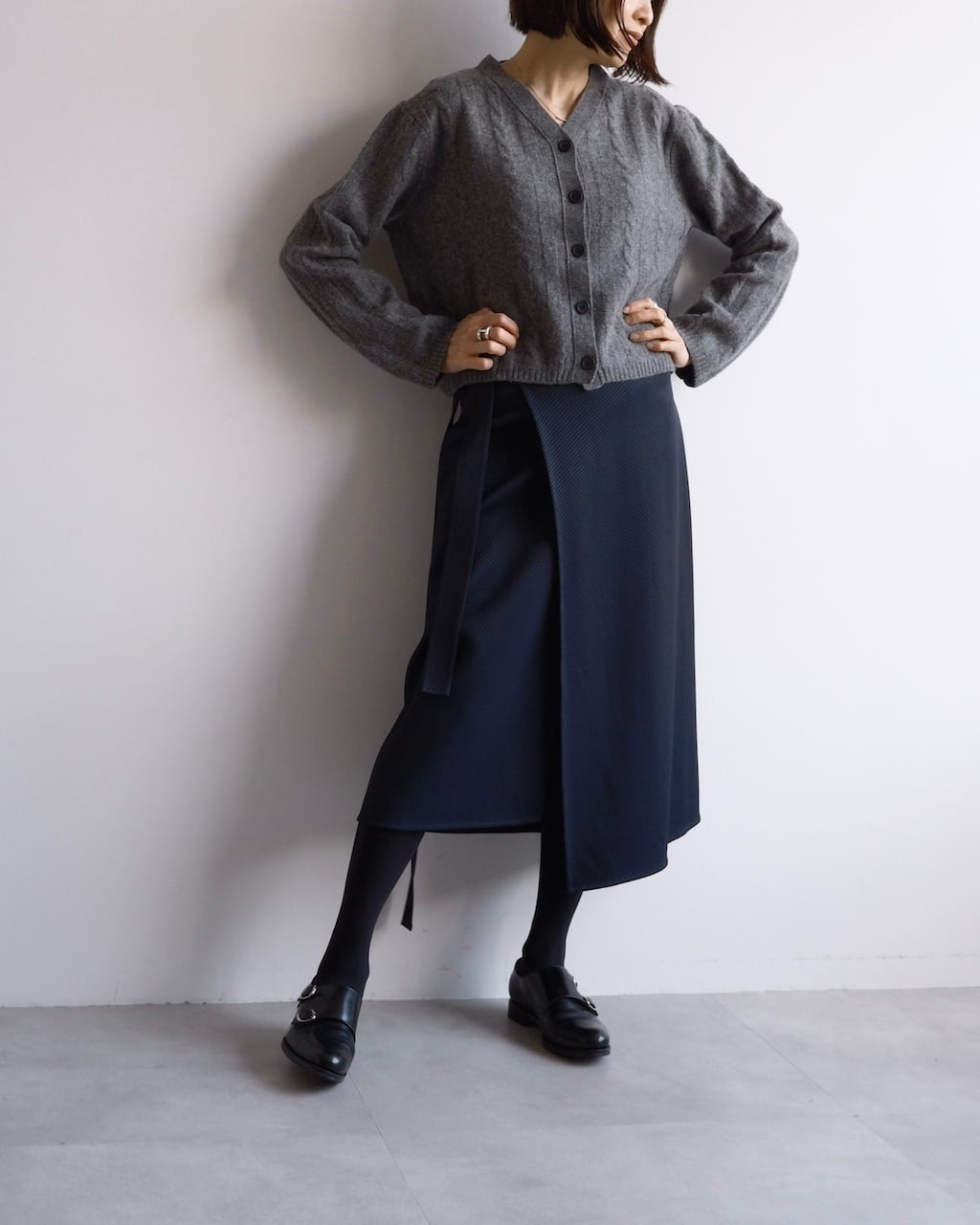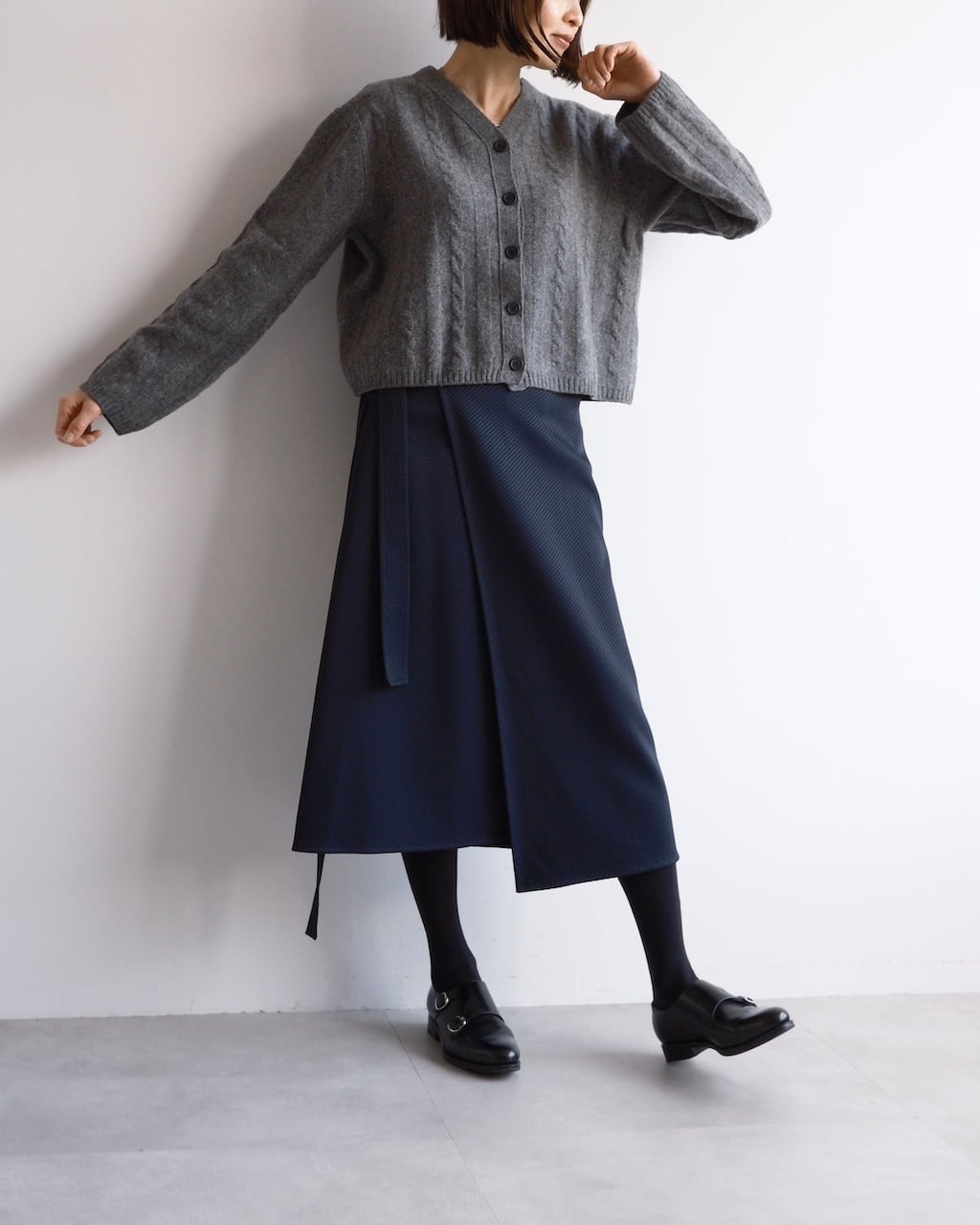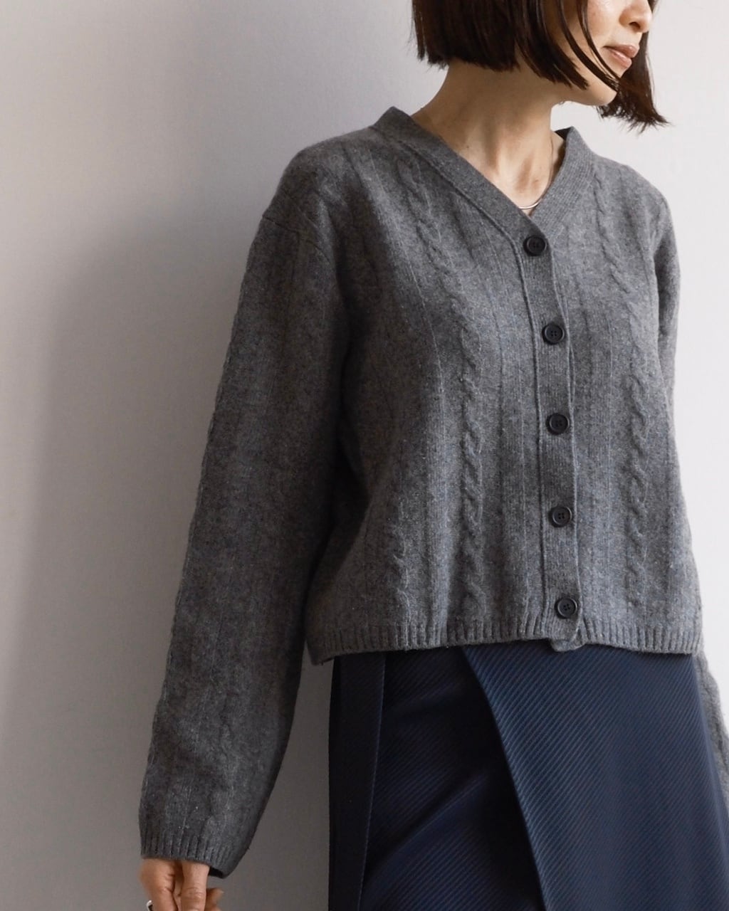 やや短めの丈感と幅広のシルエットが、ボリュームのあるボトムとバランスがとりやすく、スタイリングに自然な奥行きが生まれます。