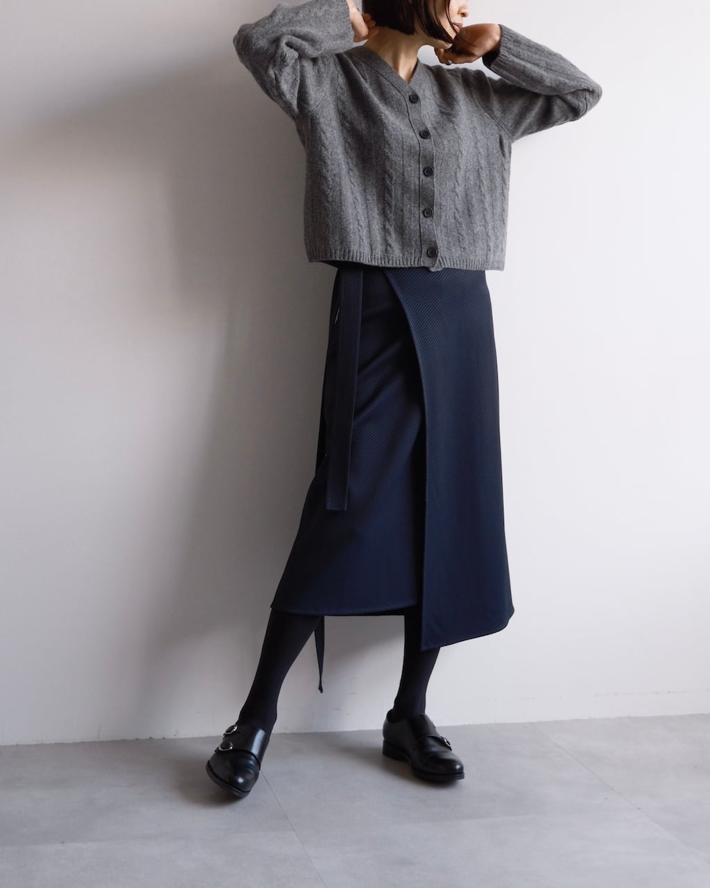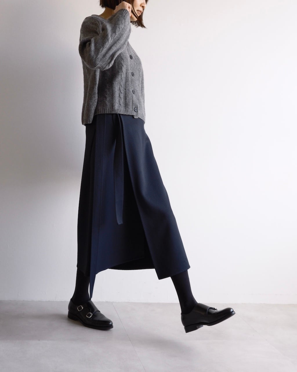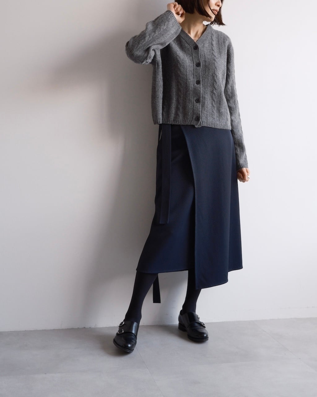 やや短めの丈感と幅広のシルエットが、ボリュームのあるボトムとバランスがとりやすく、スタイリングに自然な奥行きが生まれます。