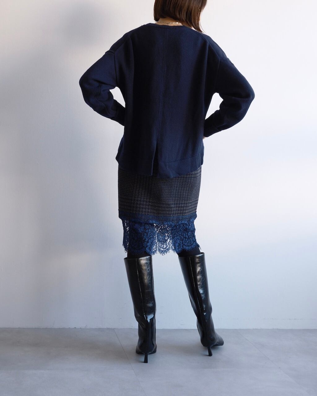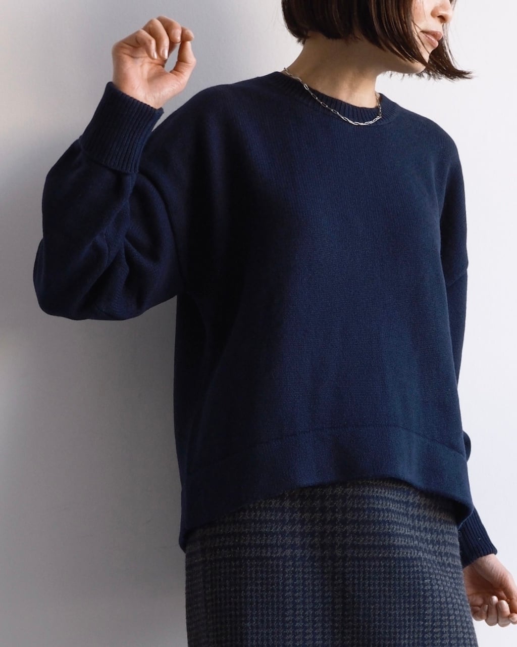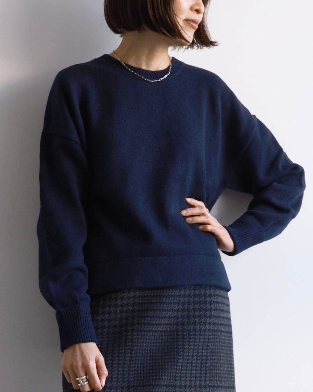 パンツ、スカート問わず合わせやすく、日常の装いに自然と溶け込むニットです。