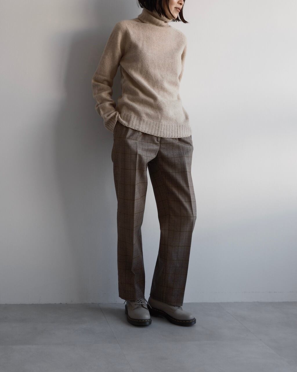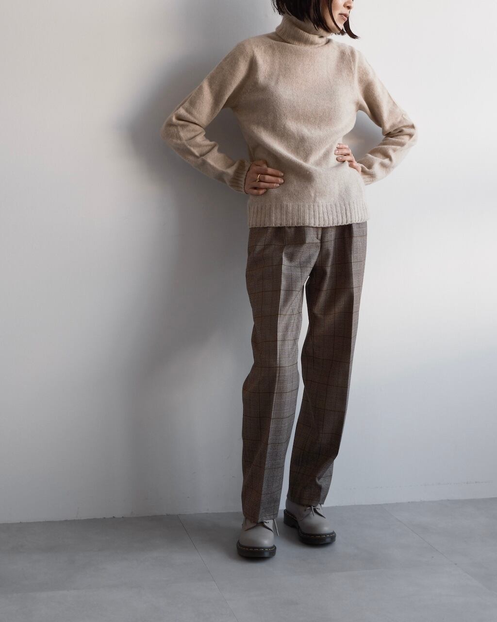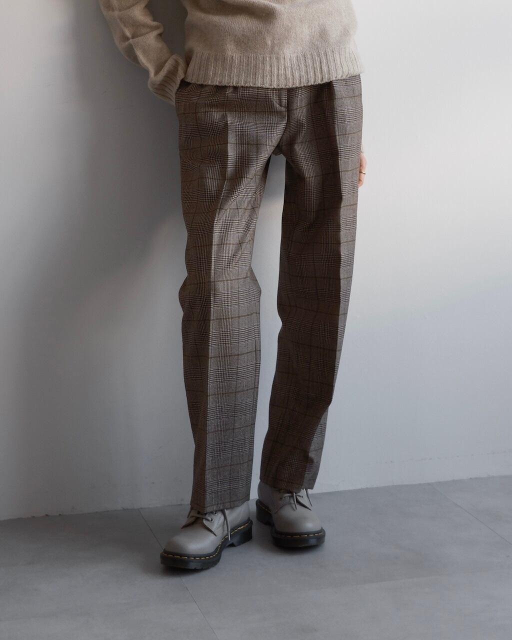 上質なウール素材ならではのしなやかさがあり、チェック柄でありながら大人っぽく落ち着いた佇まいに仕上げてくれます。