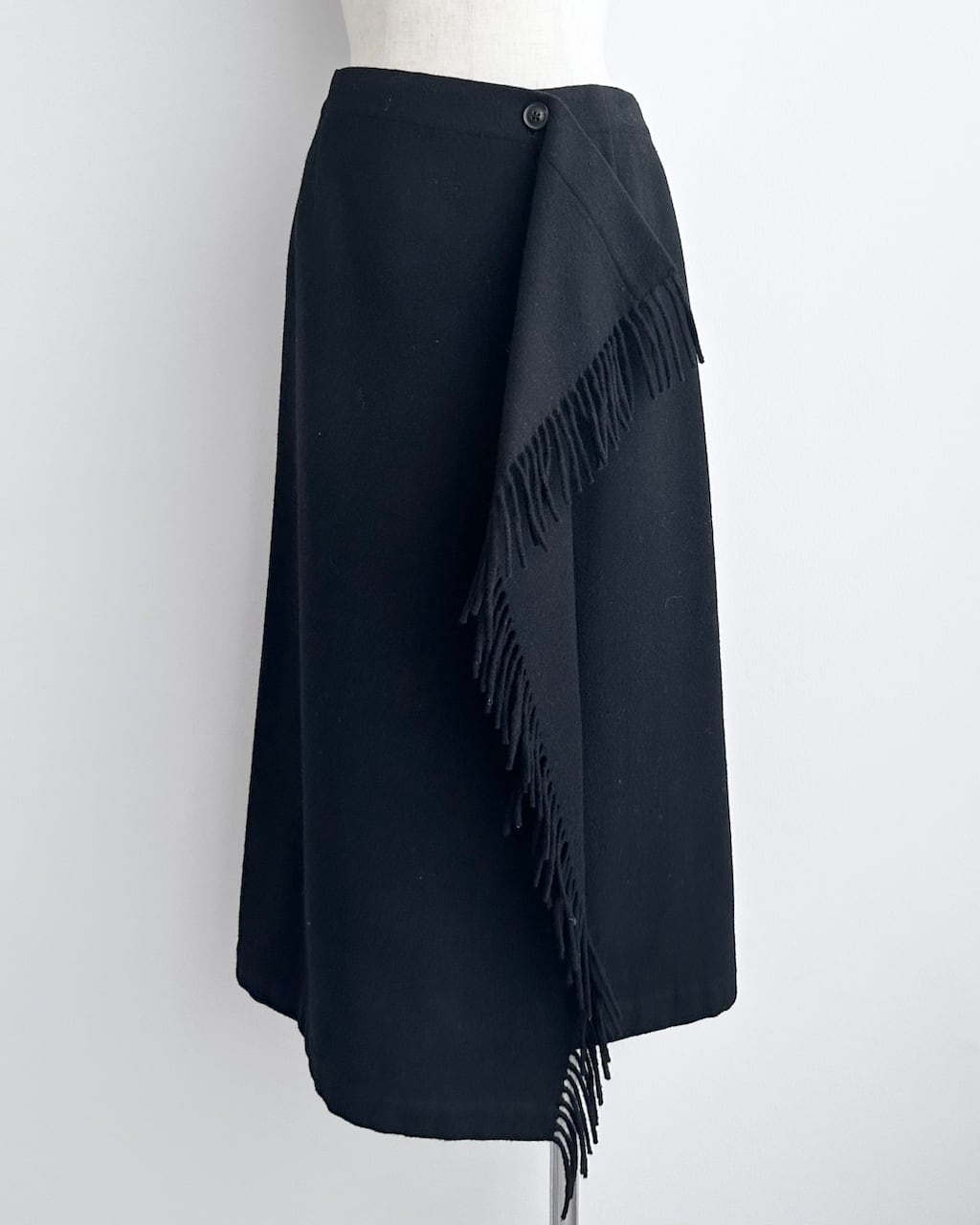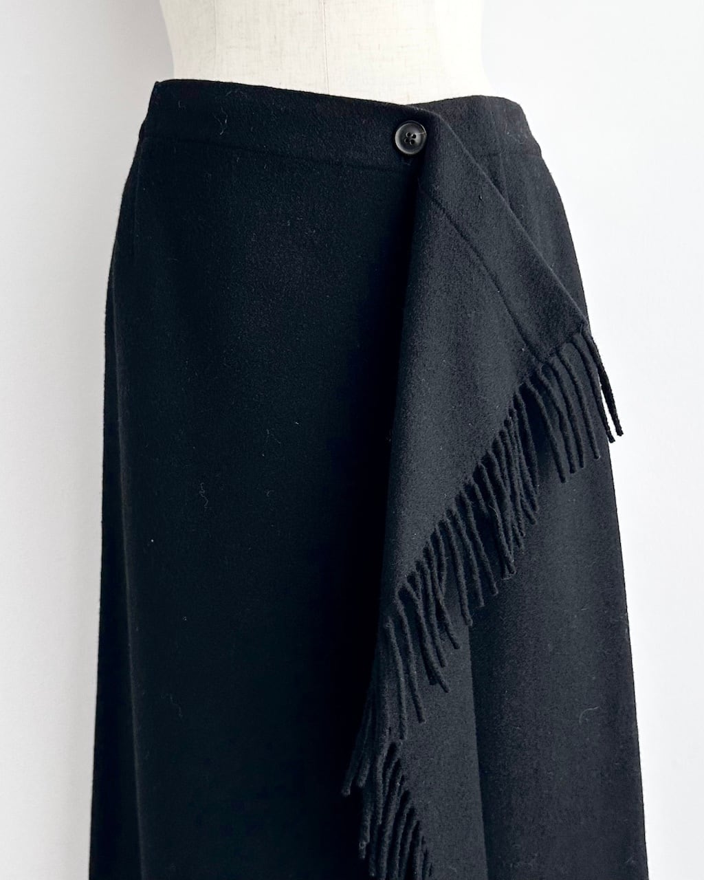 ミニマルなブラックの中に、アシンメトリーな重なりとフリンジディテールが動きを与えるtricot COMME des GARÇONSのラップスカート。