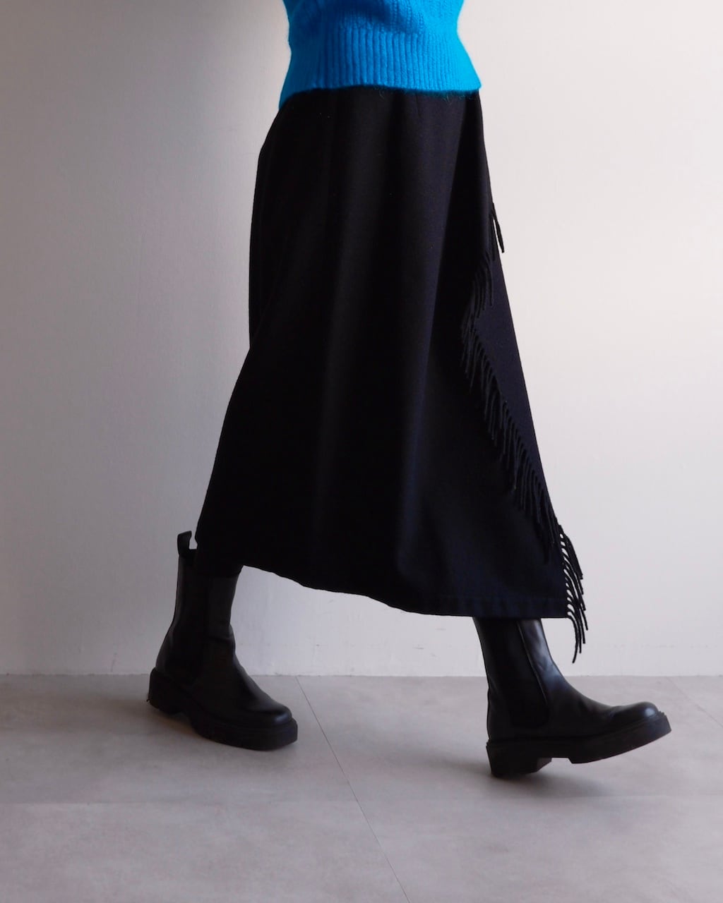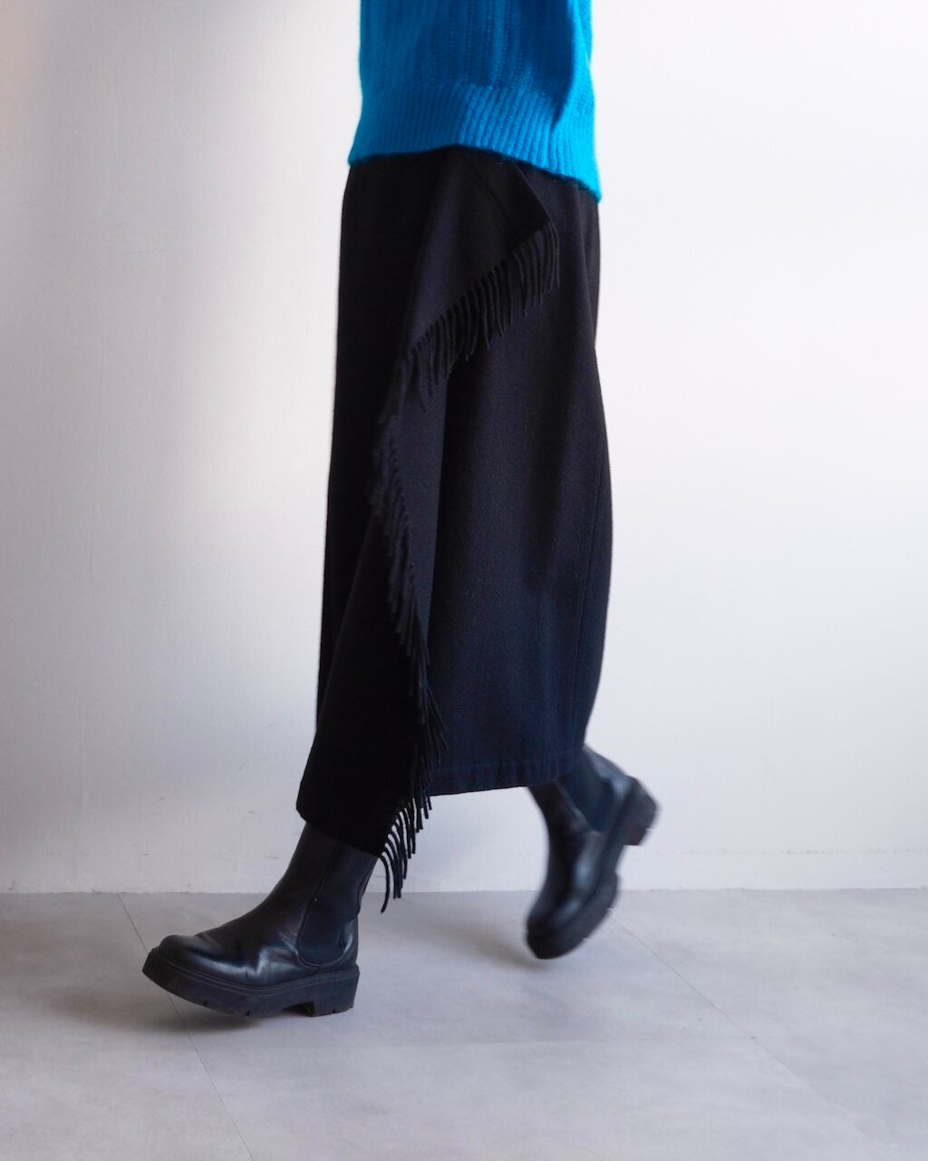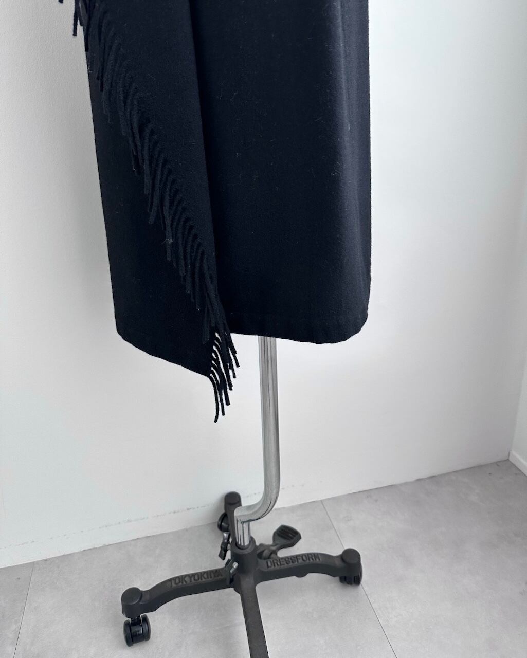 斜めに配されたフリンジが歩くたびに控えめなリズムを描き、COMME des GARÇONSらしいバランス感覚が感じられるデザインです。